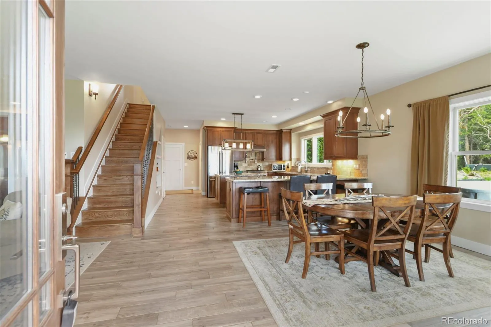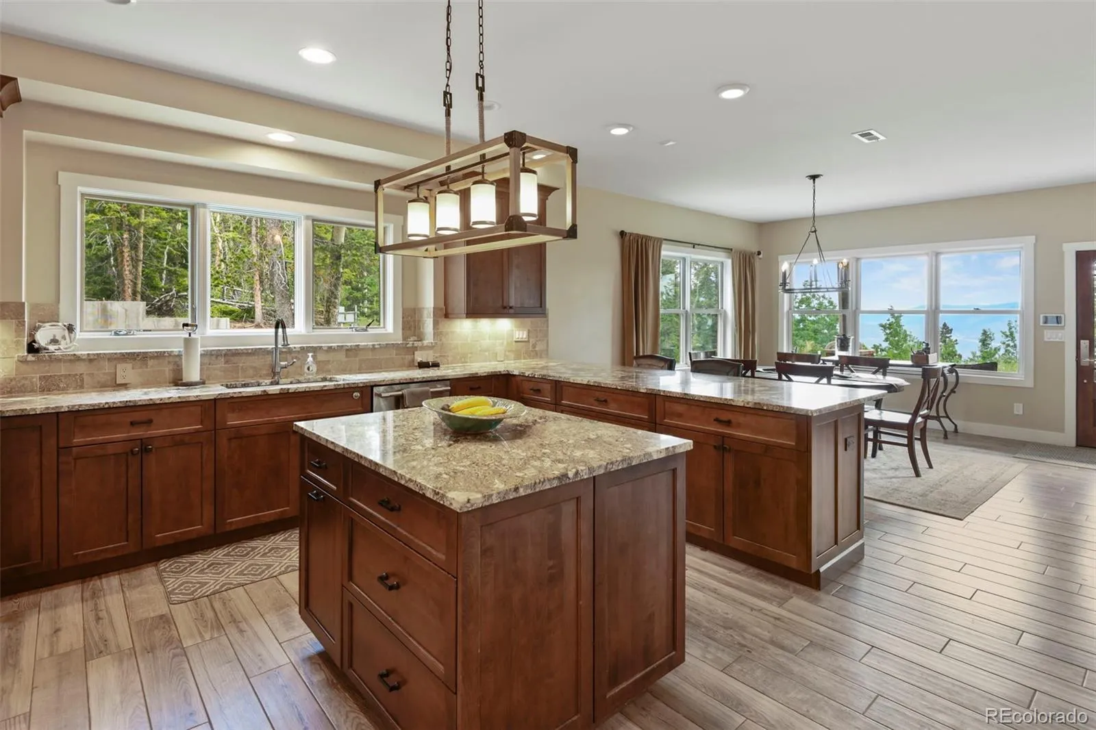 The home’s interior makes an immediate impression, with a seamless open-concept layout connecting the great room, dining area, and a standout kitchen. High-end cabinetry, slab granite countertops, tile backsplash, and upgraded appliances are complemented by a generous walk-in pantry. Expansive windows flood the home with natural light, while radiant in-floor heating delivers exceptional comfort and efficiency year-round. A flexible main-floor office easily functions as a fourth bedroom or guest suite.