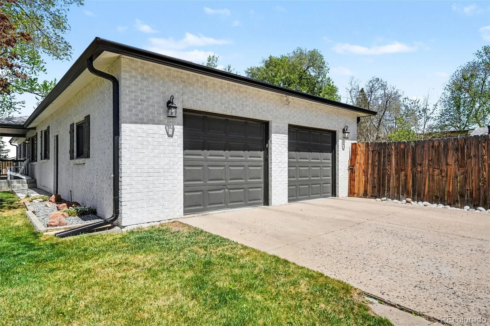 The exterior showcases painted brick with modern black accents, offering a clean and inviting curb appeal. The side-facing garage enhances the attractiveness of the front of the home, while the fully landscaped yard features mature trees provide shade and privacy.