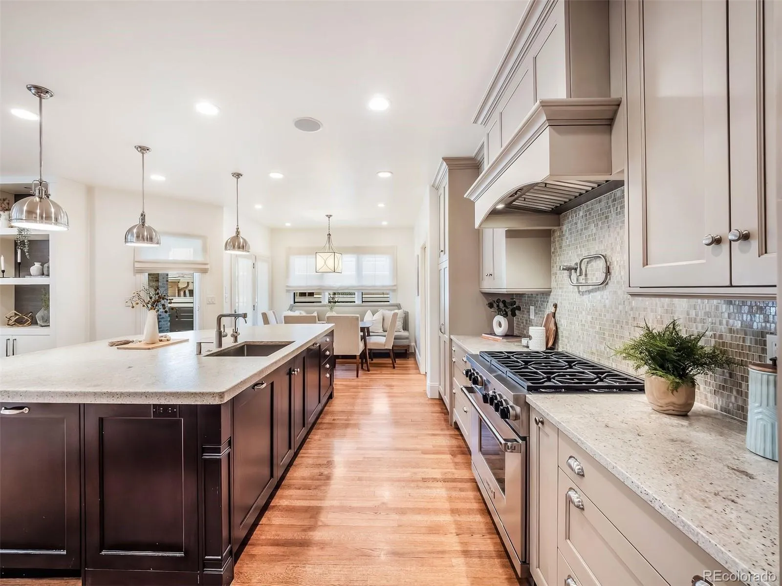 The stunning chef’s kitchen features custom cabinetry, high-end appliances, and an oversized island that anchors the space, along with a dedicated eating area and a door opening directly to the outdoor kitchen for effortless indoor-outdoor living.