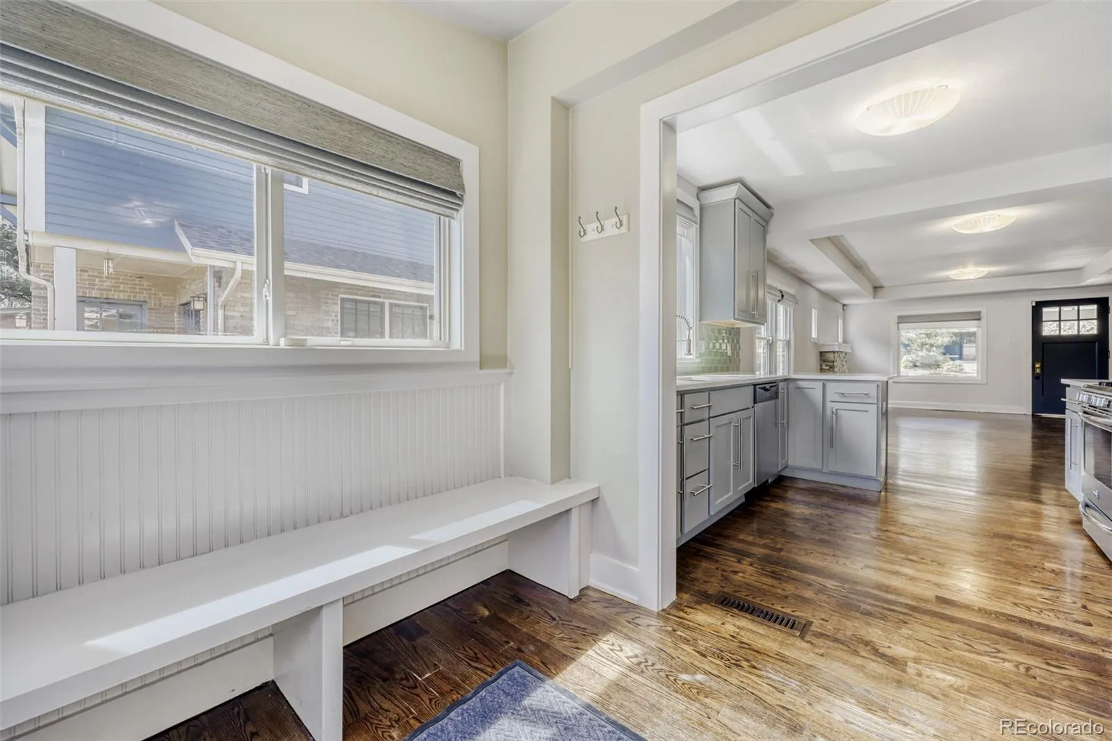 The kitchen stands out with updated cabinetry, sleek countertops, stainless steel appliances, and a stylish tile backsplash, offering both functionality and design. Custom mudroom-style back entry with built-in bench seating adds everyday convenience and charm, enhancing both form and function.