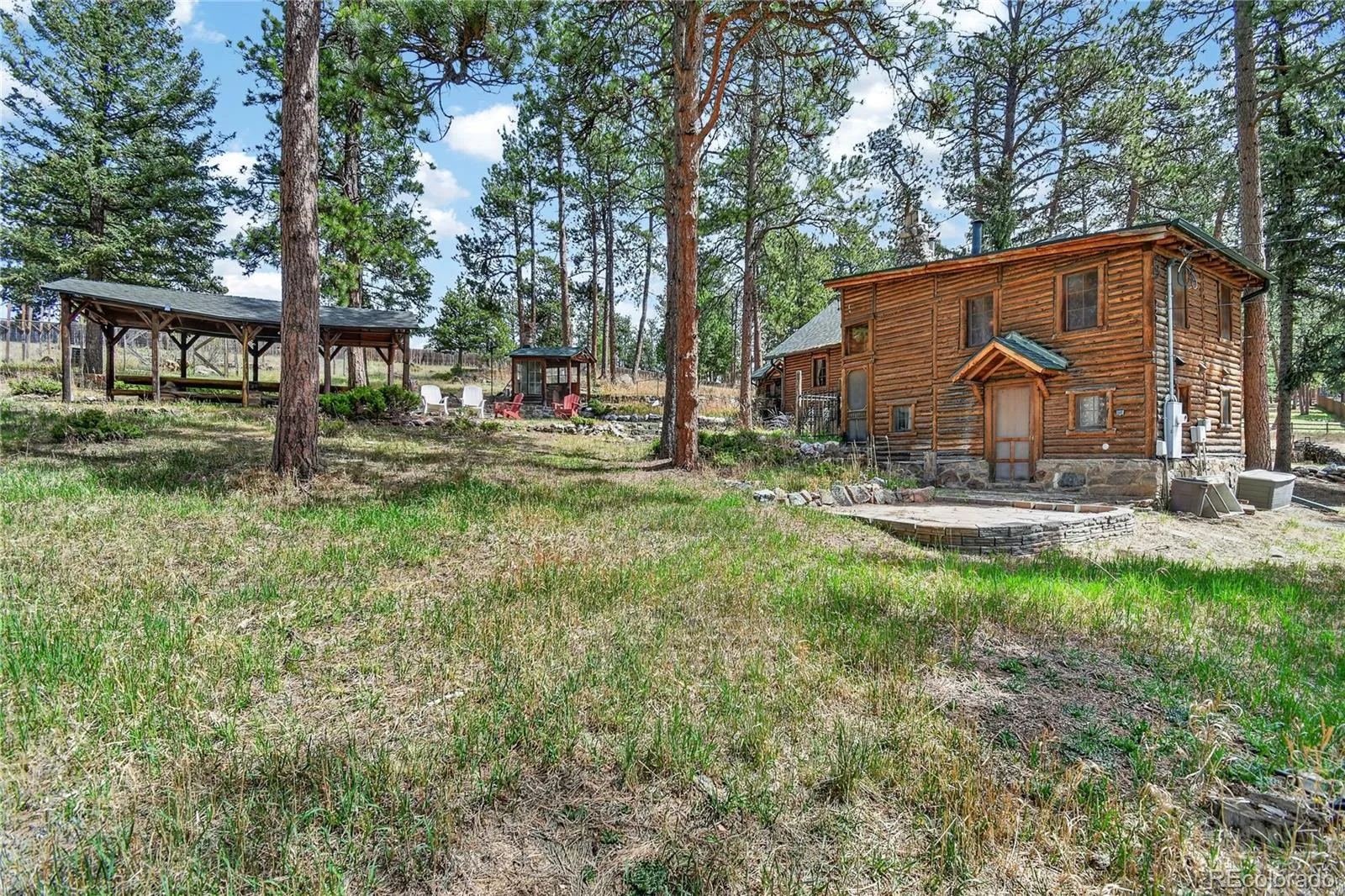 Welcome to Log Haven! Nestled on nearly 2 wooded acres, this warm and inviting hand-hewn log home blends vintage cabin charm with modern versatility—just 30 minutes from Denver. Spanning over 2,000 square feet across three levels, this 3+ bedroom, 2.5 bath home offers flexible living options, including a separate lower-level entrance—ideal for guest quarters, multi-generational living, or potential short-term rental income. While used as a family vacation home now, the property previously operated as a six-figure-producing Airbnb. Inside, you’ll find beautiful hardwood floors, a cozy living room with a wood-burning stove and vaulted ceilings, and a spacious game/bonus room perfect for entertaining. The well-equipped kitchen flows into a large dining area with seating for gatherings big and small. Unique sleeping spaces—including a charming loft and a bunkroom for four—add to the home’s character and functionality. Step outside and experience your own private mountain oasis. The property features multiple flagstone patios, an original covered outdoor dining area with seating for up to 20, a fenced garden, and serene natural surroundings filled with local wildlife. Enjoy peaceful mornings and stunning sunsets while listening to birds – including the resident pair of Great Horned Owls.