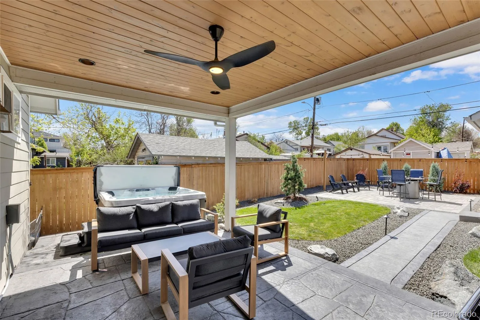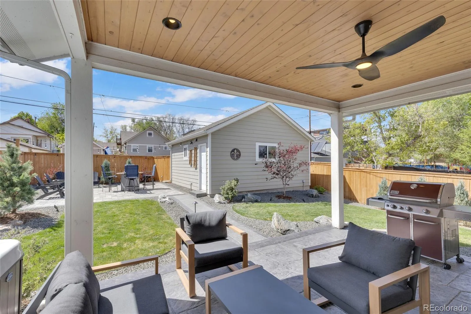 The backyard is a true extension of the home. A covered patio features a wood paneled ceiling, recessed lighting, ceiling fan, & generous lounge space that feels like an outdoor room. Beyond that, more than $50,000 in professional landscaping and lighting creates a private, polished setting with a hot tub, flagstone patio, dedicated seating area, and detached 2 car garage. All of it sits just moments from Edgewater Beer Garden, Sloan’s Bar, the restaurants and breweries along 25th Avenue, Edgewater Public Market, and Sloan’s Lake. This is turnkey Edgewater living with style, function, and room to grow.