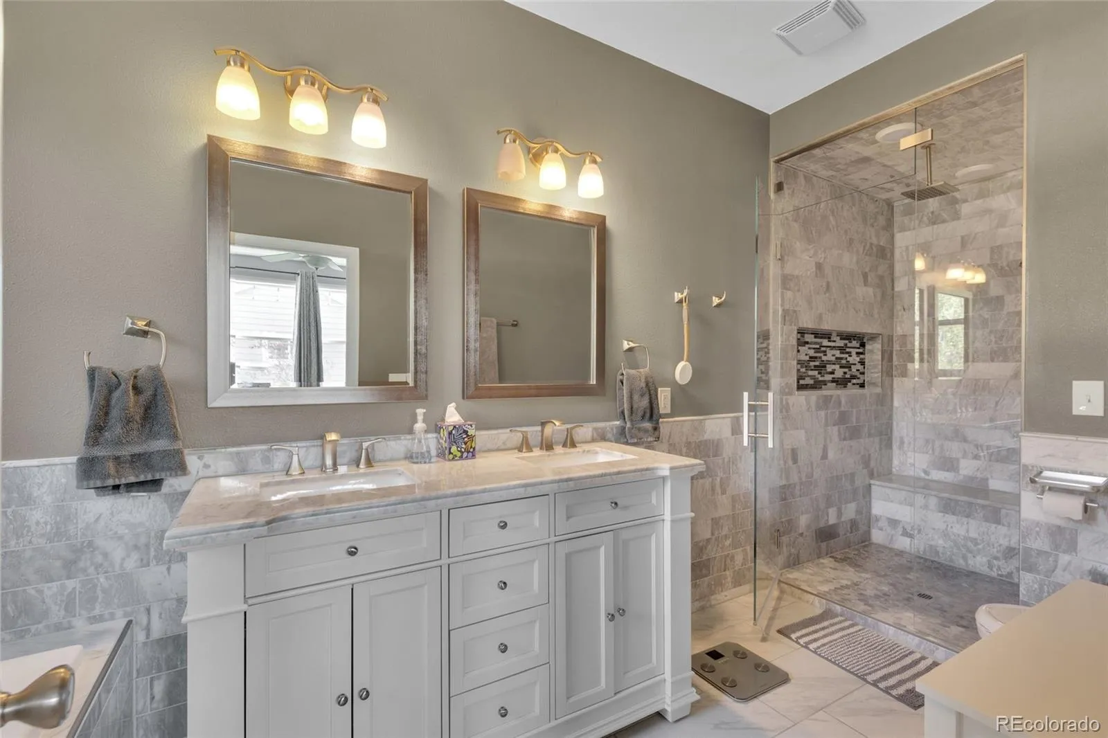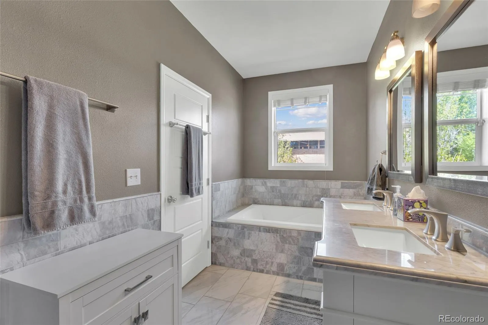 The newly updated primary suite is a true standout, with a rare five piece bath with dual vanities, marble finishes, a soaking tub, and a custom spacious glass enclosed shower. The second full bath is accessible from both the living room and the middle bedroom, offering added convenience and privacy for guests, family, or office use. Downstairs, the full unfinished basement offers exceptional future potential with 10 foot ceilings, rough in plumbing, and three egress windows, making it well positioned for additional bedrooms, living space, or a recreation area.