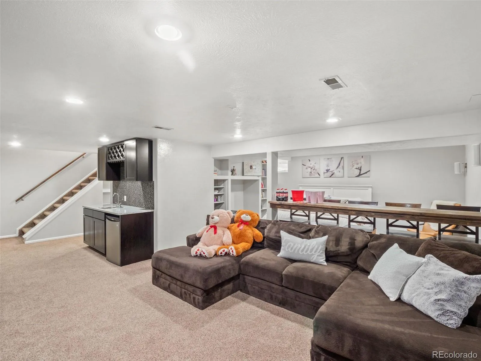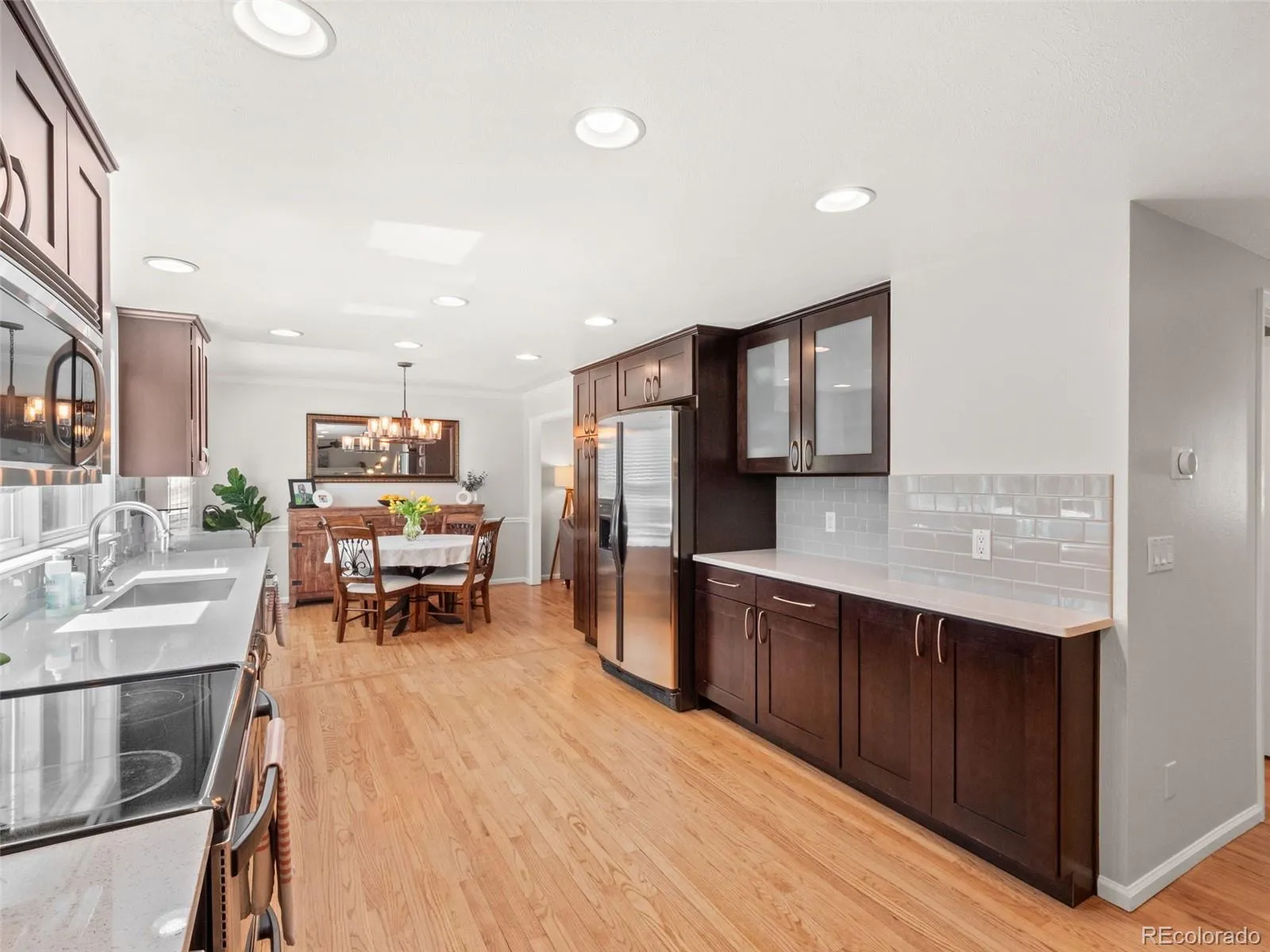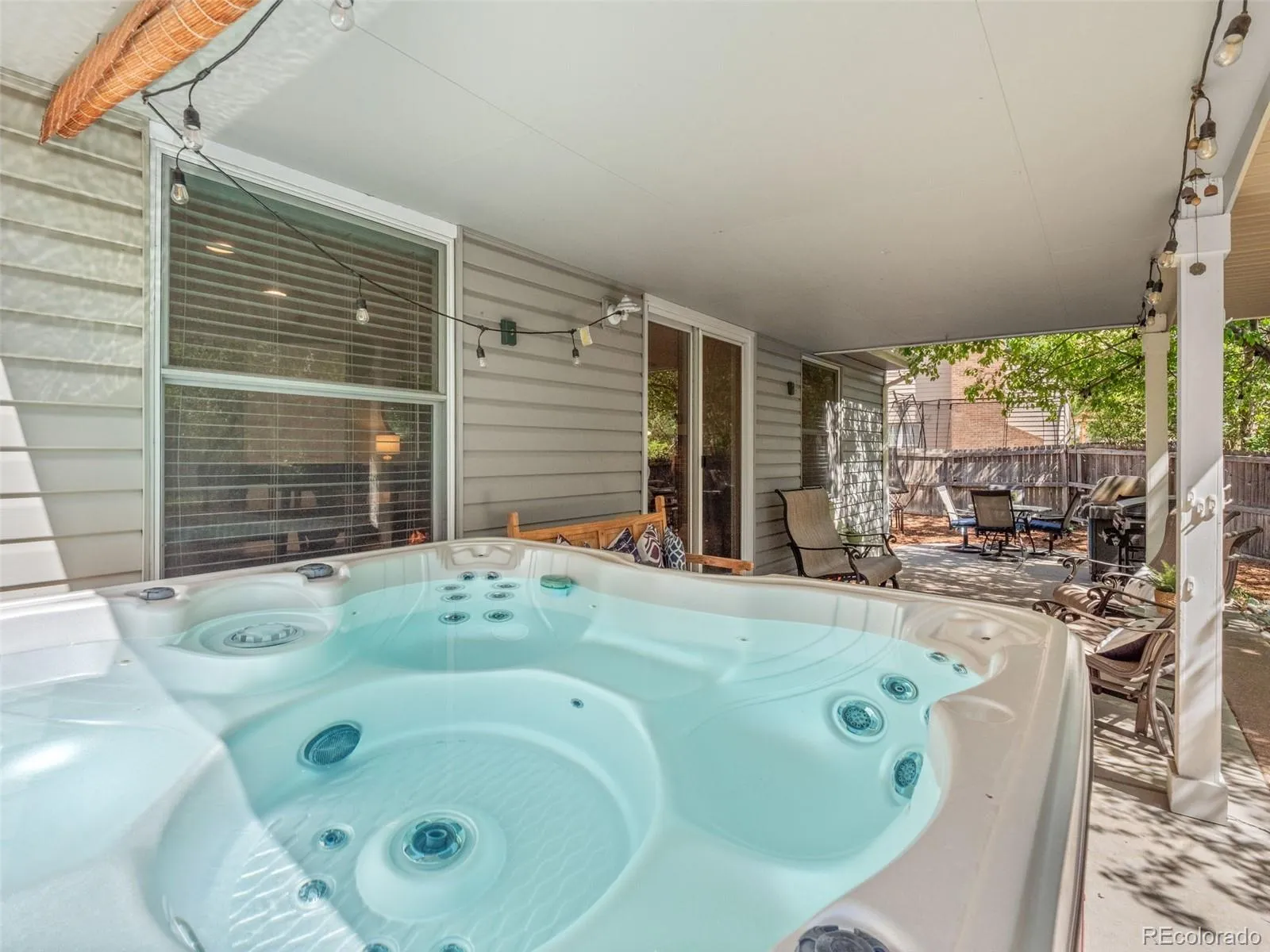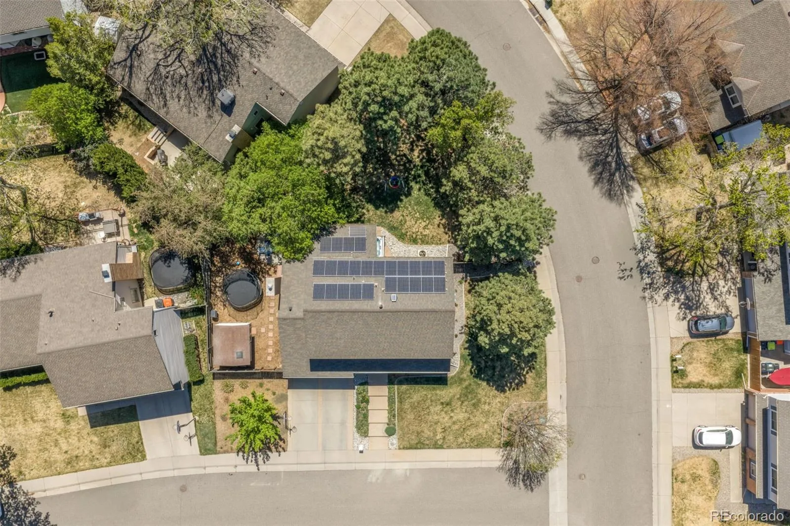 Charming 4-Bedroom, 4-Bath Home. Situated on one of the largest corner lots in a quiet cul-de-sac, this home offers privacy, functionality, and comfort. The stamped concrete walkway leads you to a covered front porch, perfect for a morning coffee. The open-concept main level features hardwood floors throughout. The updated eat-in kitchen and dining room flow into two separate living rooms — each with its own gas fireplace — providing additional spaces for relaxing and entertaining. The fully finished basement includes a wet bar and bonus guest room space. Step outside to a covered patio overlooking the large backyard, complete with mature trees for ample shade, a hot tub, and peek-a-boo views of the Rocky Mountains. A dedicated gas line connects directly to the Weber grill for easy outdoor cooking. The side yard includes a shed with electricity. Energy-efficient solar panels installed in 2018 cover the electric bill, adding long-term value and savings. New paint on main floor, stairs and upstairs hallway. A 3-min walk takes you to Holly Pool, featuring a 100 ft waterslide, lap & leisure pools and the Holly Tennis Center with 6 outdoor lighted courts. Cherry Park is up the street with a new playground installed in 2023, basketball courts, a sledding hill and open turf fields. There are multiple entrances to the expansive Highline Canal trail system. This home is within walking distance to the award-winning Heritage Elementary School and 12 acres of scenic green space and lit trails of Heritage Place. This community offers year-round events to enjoy: 4th of July Parade, Party & Firetruck Display at Cherry Park, a Chili Cookoff, Summer Food Trucks, an Easter Egg Hunt, Horse Drawn Sleigh Rides w/ Santa & Mrs. Claus, and more. Come see this amazing home!