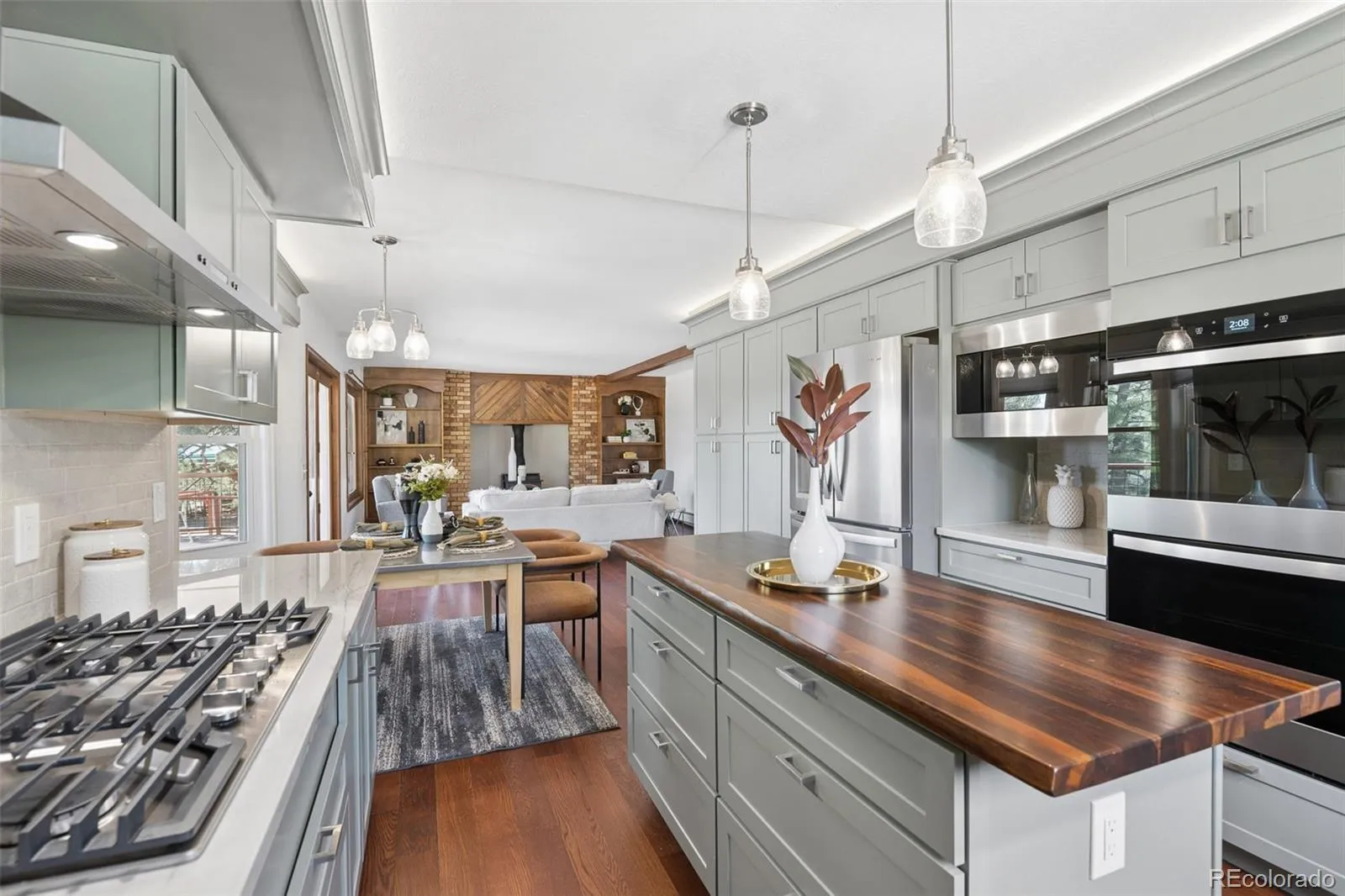 The main level unfolds with an open, connected layout designed for both everyday living and entertaining. At the center, the newly remodeled kitchen features quartz countertops, custom cabinetry, a butcher block island, and a gas cooktop, anchoring the space with both function and style. Vaulted ceilings and expansive windows bring in natural light throughout, while direct access to the deck creates a seamless transition to outdoor living.