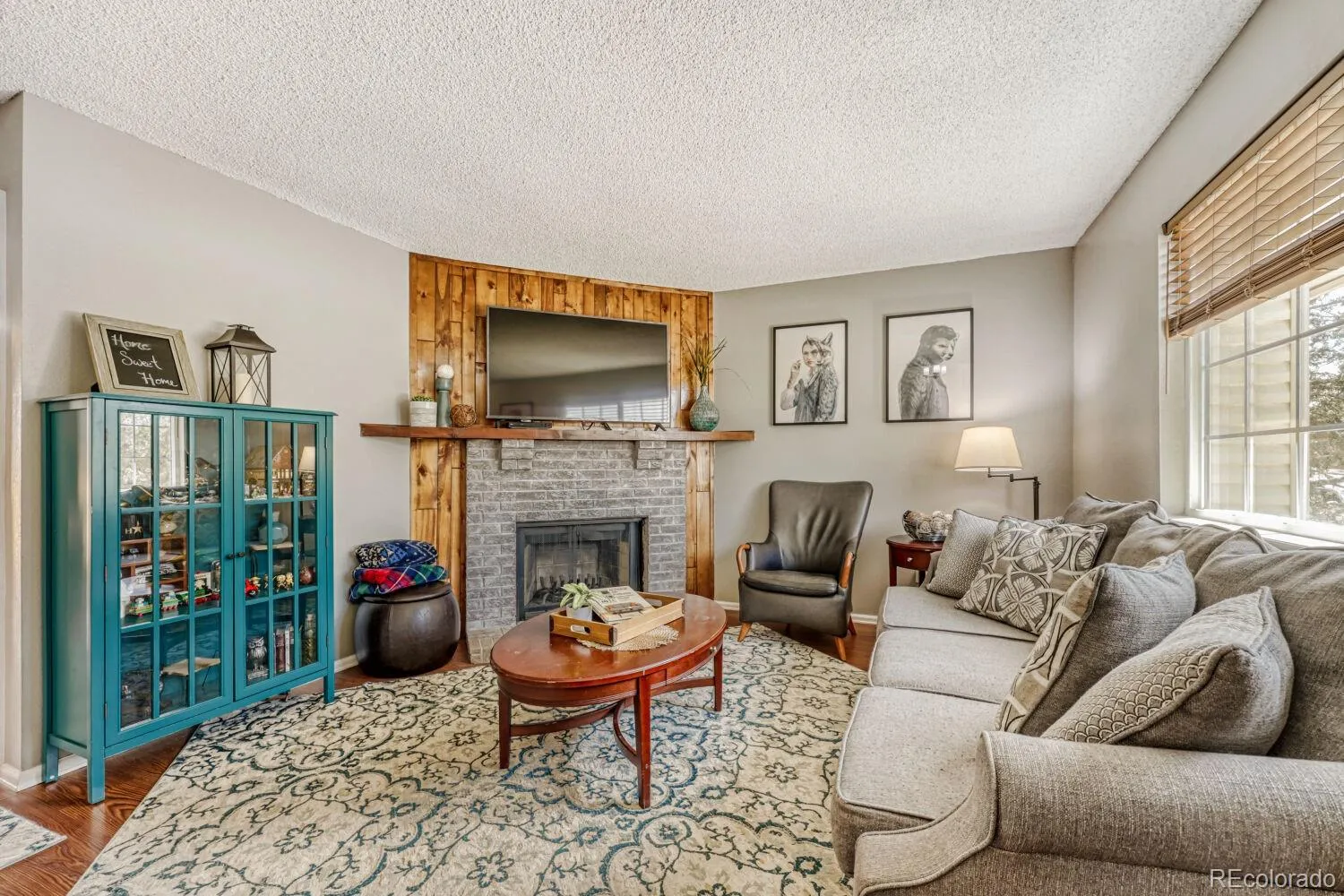 The main living area features a functional wood-burning fireplace, creating a warm and inviting atmosphere perfect for relaxing evenings or entertaining guests. The kitchen offers excellent storage with a large pantry and flows seamlessly into the dining space. A sliding glass door with built-in interior blinds opens to your private outdoor retreat complete with a new fence and large concrete patio poured in 2025 — ideal for outdoor dining, gatherings, pets, or simply enjoying Colorado’s sunshine.