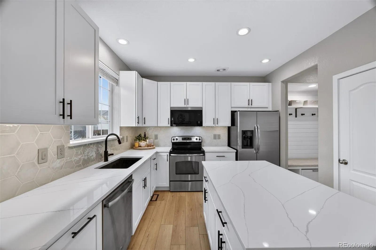 The heart of the home is a stunning kitchen remodel featuring Alpine White soft-close Avondale cabinetry, Calacatta Ultra quartz countertops, Anatolia Teramoda hexagonal ceramic backsplash, under-cabinet and island lighting, a flush-mount microwave, and a pop-up counter outlet — truly a chef’s dream. The main level flows beautifully with Cortec Enhanced LVP flooring in Calypso Oak, complemented by updated interior stair railings and a fully refreshed half bath. A dedicated home office, mudroom entry, and guest half bath round out the main level perfectly.
