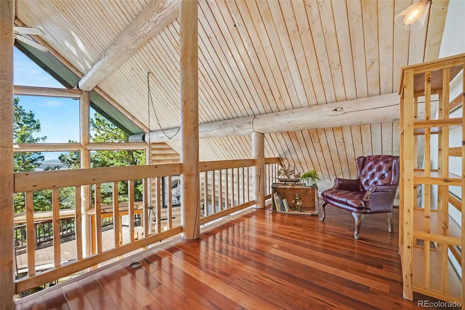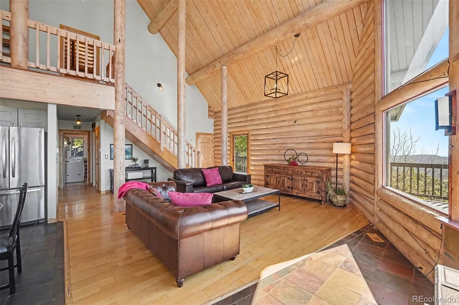 At the summit, the main home welcomes you with a massive multi-level wraparound deck designed to capture the incredible surroundings. Sip wine and enjoy the sunsets from your 6-person hot tub. Inside, the home showcases a warm and inviting modern log interior with vaulted wood ceilings, wood floors, and expansive floor to ceiling windows. Impressive log pillars span both levels, adding to the home’s unique character. The open floor plan seamlessly connects the kitchen, dining, and living areas, centered around a cozy wood stove. The kitchen features granite countertops and stainless steel appliances. The main level includes two bedrooms, an updated full bathroom, and a conveniently located laundry room. Upstairs, a bonus loft space overlooks the main living area and offers stunning mountain views. The primary suite is a private retreat with a bay window, two private decks, and an updated bathroom featuring a steam shower and marble finishes.