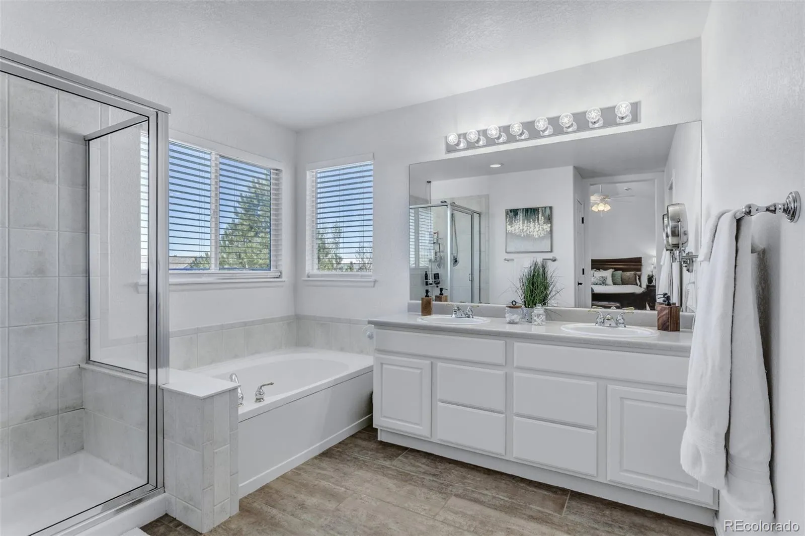 Inside, the home features a dramatic two-story entry and living room, upgraded kitchen with refinished cabinetry, quartz countertops, quartz sink, reverse osmosis drinking water system, induction range with convection oven, included refrigerator, and wood floors, along with a spacious family room with fireplace and open flow to the kitchen. Cordless blinds enhance the main living areas. The primary suite includes a sitting area, walk-in closet, and remodeled bath with dual vanities, separate shower, and soaking tub.