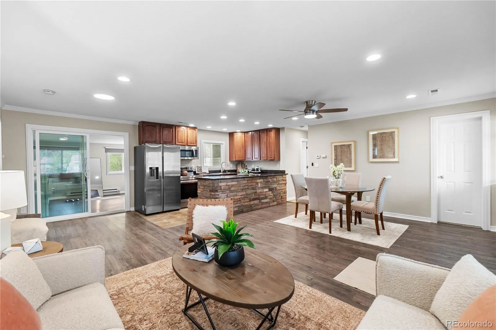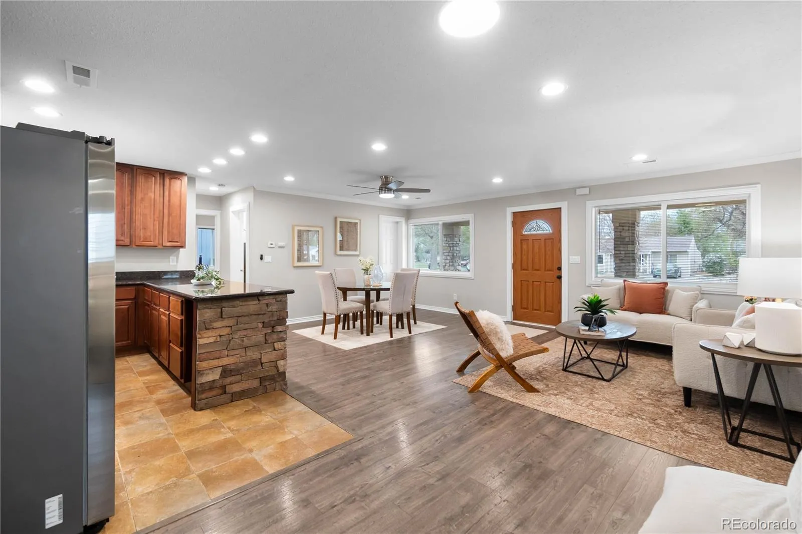 The perfect balance of nature with the pulse of the city, just one block from the High Line Canal Trail entrance. Morning jogs and sunset bike rides under the canopy of trees can become your daily ritual. This beautifully remodeled University Hills home offers the ultimate turnkey lifestyle, blending modern amenities with effortless single level living. Step through the front door to find a bright, open-concept heart of the home, where the kitchen, dining, and living areas invite easy conversation. Sparkling clean, featuring brand new interior paint, plush carpet, and contemporary lighting, with all appliances staying. Truly Move-In Ready!