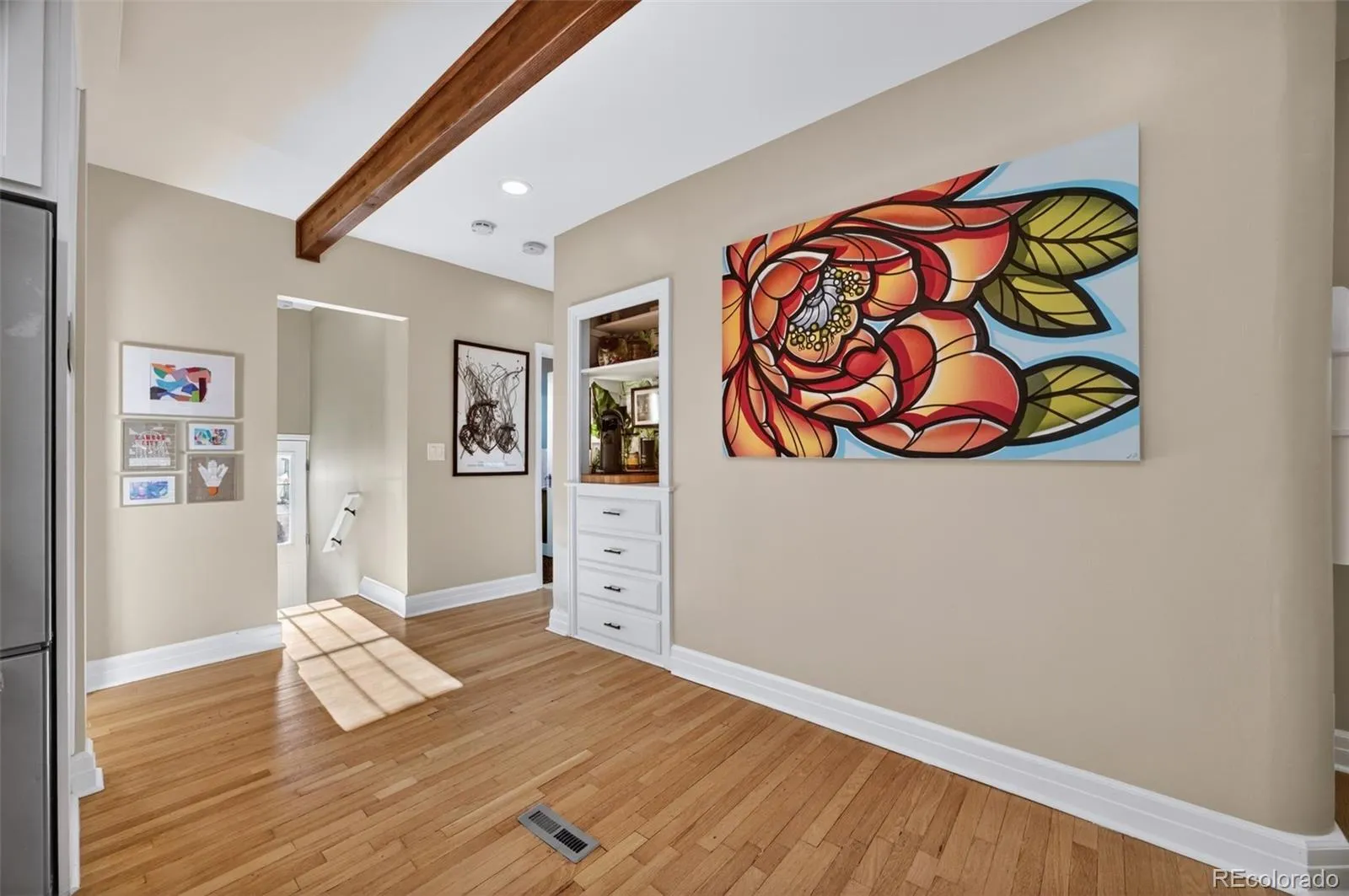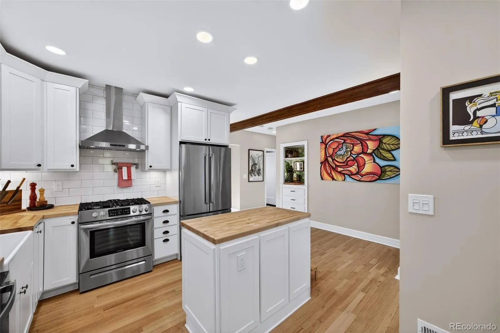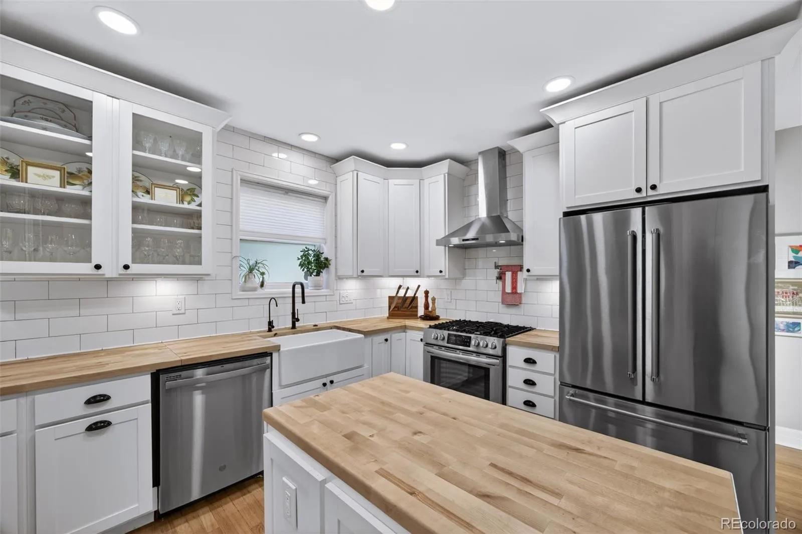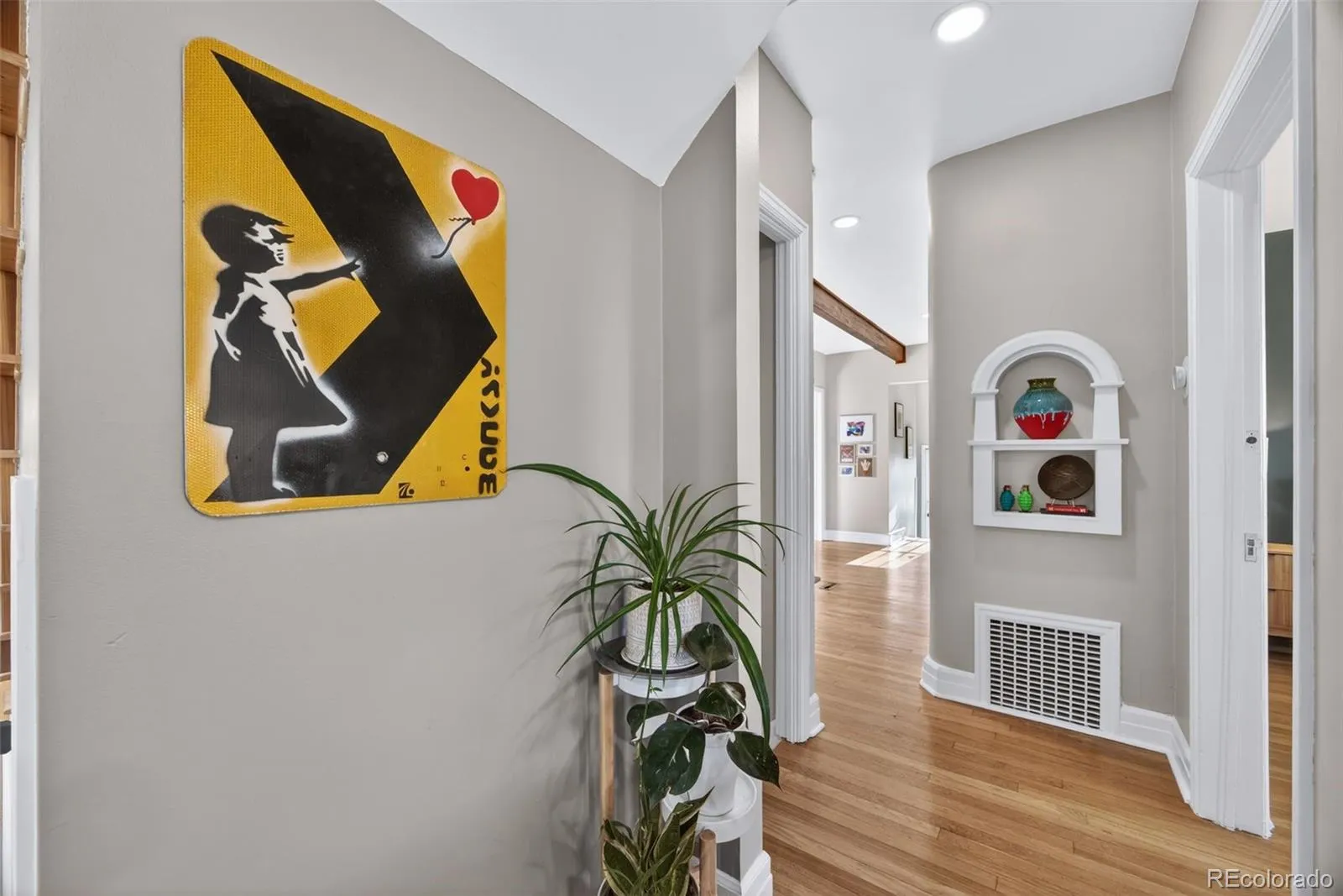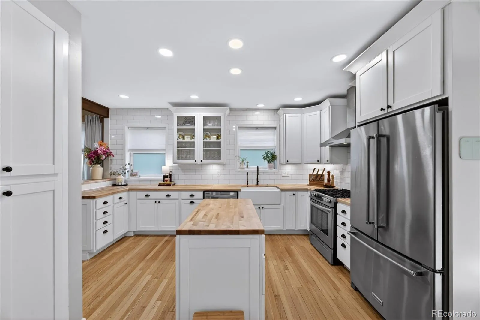 Welcome to this stunning 1930s home, where timeless charm meets thoughtful updates and incredible curb appeal. A fully fenced front yard and original front door set the tone as you step inside to a warm, inviting living room featuring a wood-burning fireplace with a modern mantle, flowing into an open dining room. The kitchen is truly a standout. Open from two sides, it features white cabinetry, a central island, stainless steel appliances, subway tile backsplash, butcher-block countertops, a farmhouse sink, exposed brick, and a thoughtfully designed coffee bar with a convenient two-tap system. The home is equipped with a reverse osmosis water filtration system. The main level includes three bedrooms and an updated 3/4 bathroom, along with easy access to the backyard. Step outside to a pergola-covered patio with an epoxy-coated floor for easy maintenance and a fully fenced, professionally landscaped yard designed for effortless entertaining and everyday enjoyment, complete with a charming playhouse. The primary suite is a true retreat with vaulted ceilings, skylights, and a spacious walk-in closet with custom organization. The ensuite bathroom features a two-person soaking tub, marble tile, rain shower, and dual sinks. Upstairs also includes an additional bedroom ideal for an office. The finished basement offers flexibility with a large family room featuring a second wood-burning fireplace, plus a 3/4 bathroom and a generous laundry room with a utility sink and storage. Fully finished attached tandem two-car garage with a work area and two off-street parking spaces. The home was freshly painted throughout in 2025. Unbeatable location with easy access to City Park, the Denver Zoo, Botanic Gardens, Cherry Creek North, and Cheesman Park. Enjoy local favorites nearby, including Nuggs Ice Cream, Marczyk Fine Foods, Gelato Boy, and Postino, plus a park right at the end of the block.