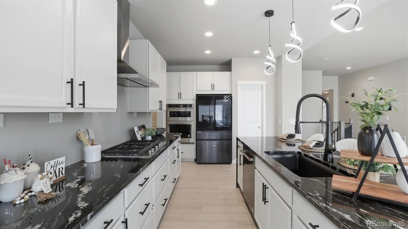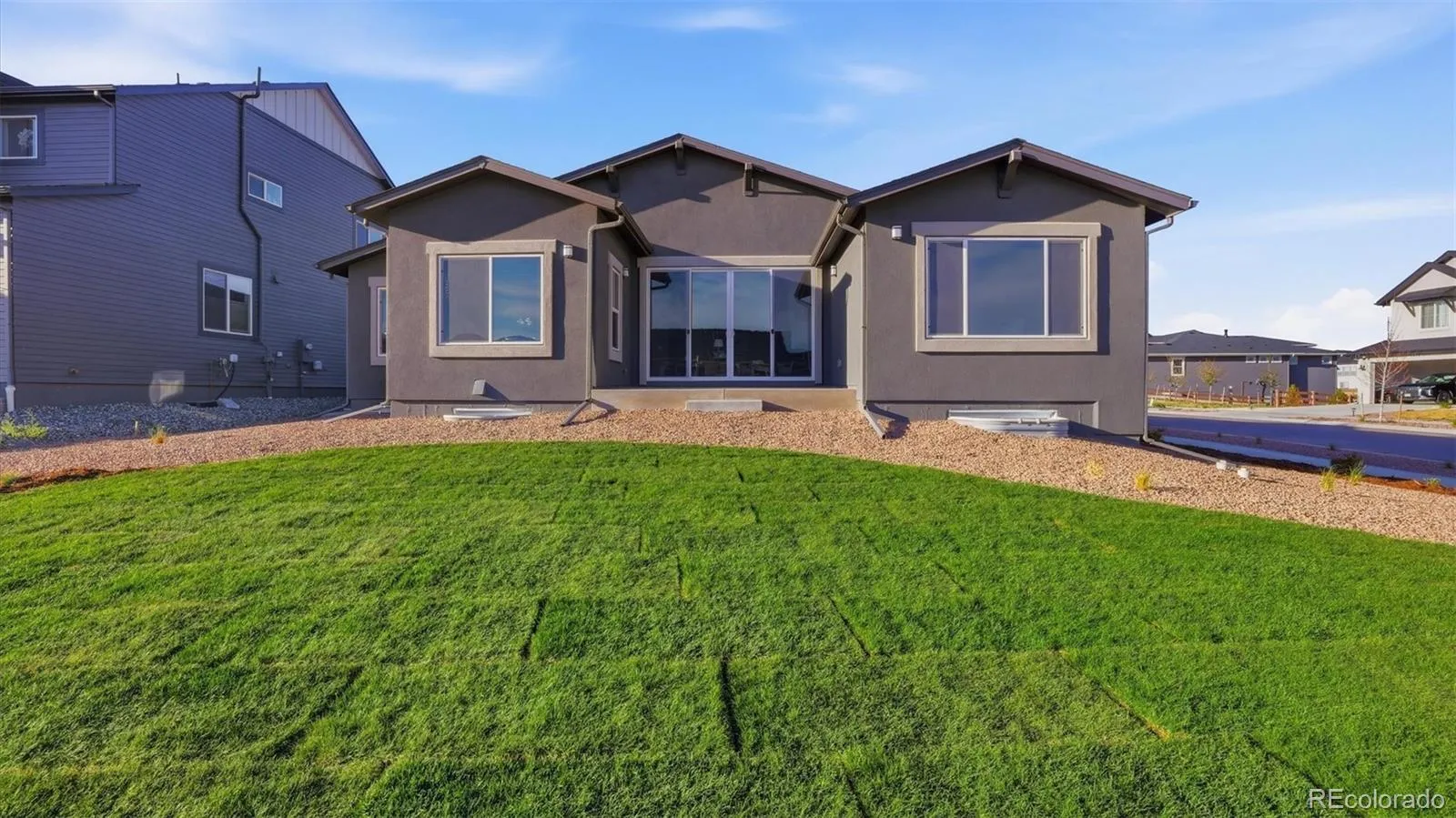 Exquisite stucco/stone ranch-style home on a 0.27-acre corner lot in the popular D20 community of Revel at Wolf Ranch. This brand-new 5BR, 4BA home blends luxury, functionality & modern elegance. The expansive basement offers potential for a 6th BR & rough-in for an additional BA. High ceilings & abundant natural light create an airy ambiance. Luxury vinyl plank flooring flows through the Entry, Living Room, Kitchen & Dining Area, complemented by wood-look blinds. The Great Room features a stone-tile gas fireplace & wall of windows with sliding door to the back patio, complete with gas stub for grilling. The chef’s Kitchen boasts a large island w/breakfast bar, waterfall-edge marble-look quartz countertops, stainless steel appliances (5-burner gas cooktop, built-in oven, microwave, dishwasher, SMART Samsung fridge), walk-in pantry & ample cabinetry. A sunny Dining Area ensures effortless entertaining. Additional features include a Mud Room, Powder Bath, Laundry Room w/Samsung washer/dryer, & 3-car garage. A main-level Office with French doors offers a perfect work-from-home space. The vaulted Primary Suite is a serene retreat with a luxurious 5-piece Bath, a dual sink vanity with quartz countertops, tiled walk-in shower w/seat, soaking tub & walk-in closet. Two more main-level BRs share a Shower Bath w/dual sink vanity, quartz countertop, and enclosed shower. The partially finished Basement with 9′ ceilings includes a spacious Family Room, Game Area, 2 BRs (one w/en-suite Bath and 1 with a walk-in closet), & large Utility Room w/tankless water heater, furnace, & storage. Central A/C & heat, security system & radon mitigation add peace of mind. The backyard is beautifully landscaped and ready for weekend BBQ’s, kids play, or just relaxing and soaking up the Colorado sunshine. Wolf Ranch offers parks, trails, Rec Center (fee), pool/splash park, stocked lake, playgrounds & summer concerts. Easy access to Powers, Hwy 83, I-25, shopping, hospitals & more!