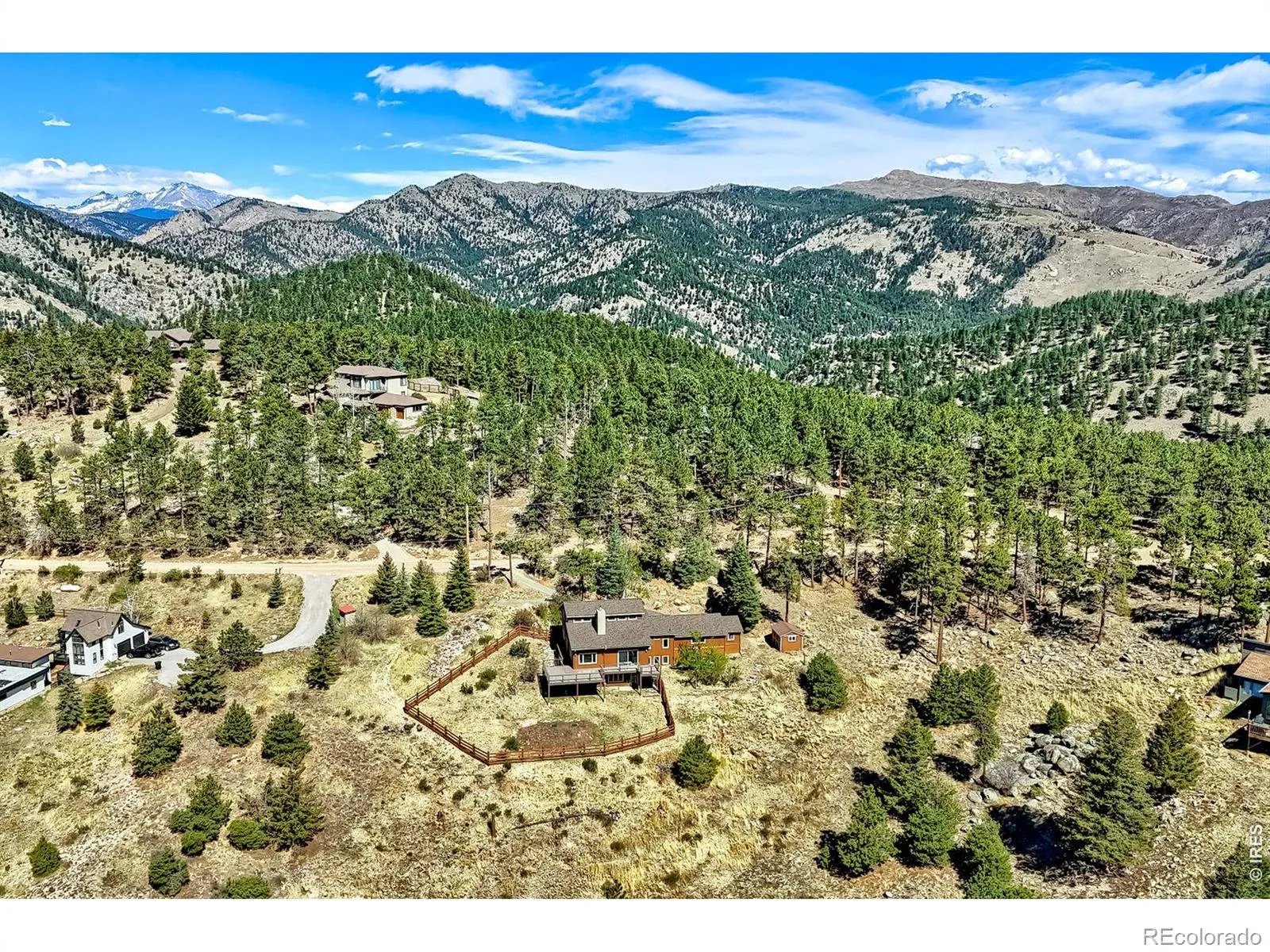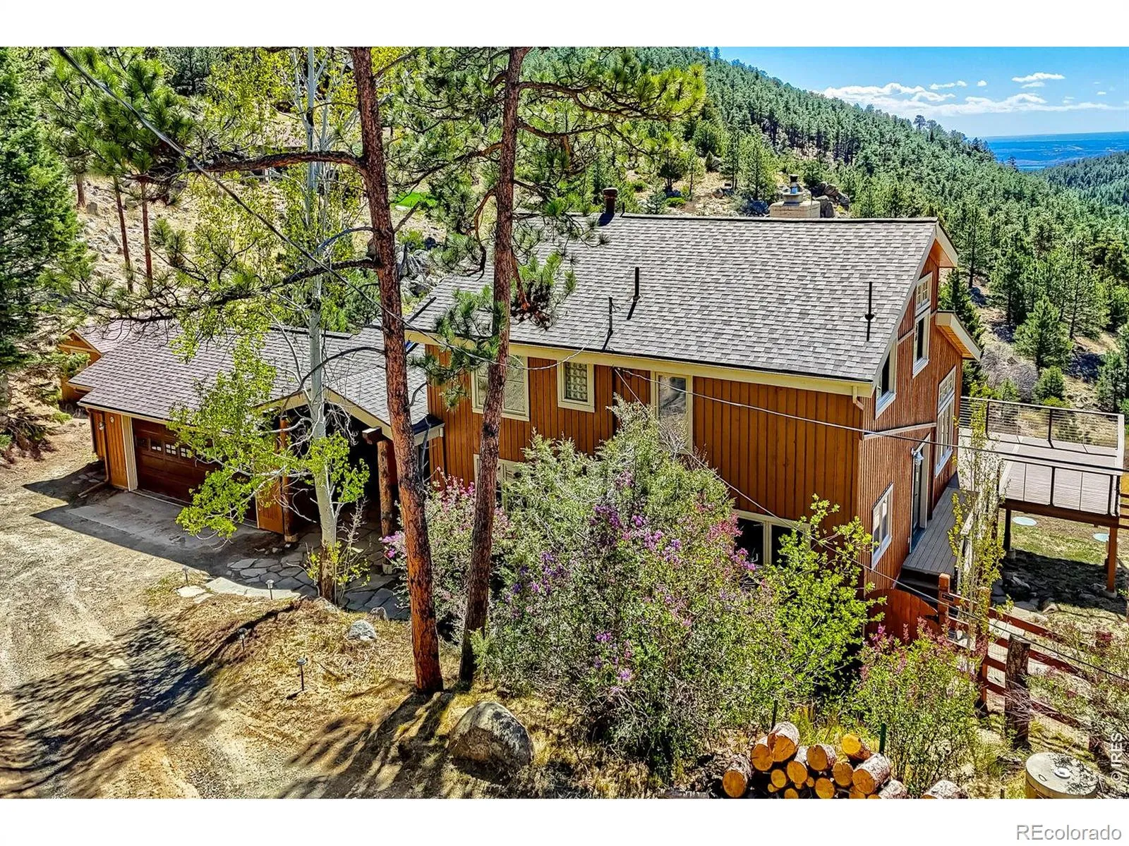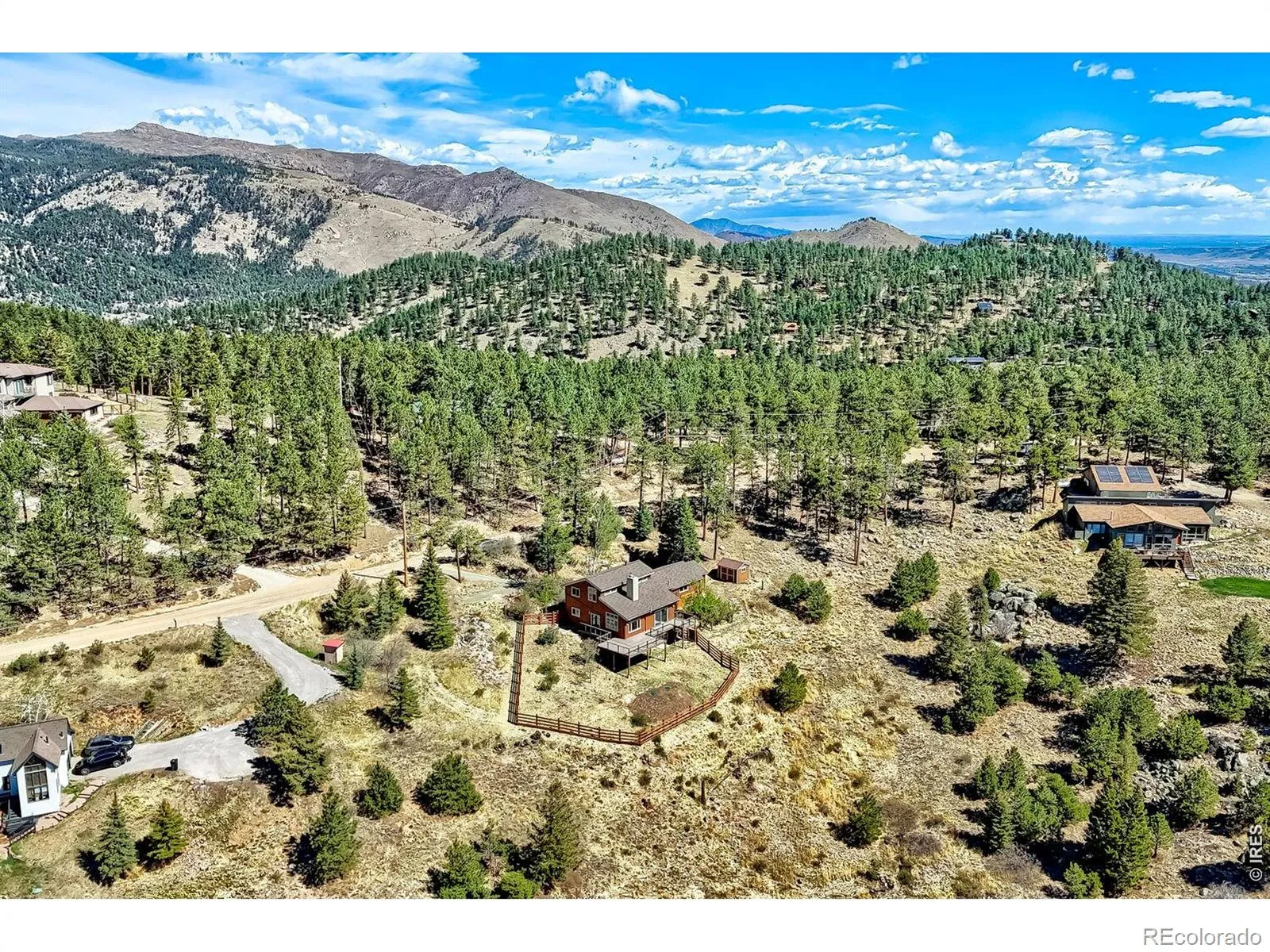 Enjoy peace, privacy, and breathtaking scenery in this close-in mountain sanctuary. Expansive southeast-facing windows frame stunning valley and plains views, filling the home with natural light. The bright, open floor plan showcases vaulted ceilings and warm wood floors, creating an inviting, airy atmosphere that flows seamlessly onto spacious decking-perfect for relaxing or entertaining while taking in the views. The well-appointed kitchen is ideal for both everyday living and hosting, featuring a large island, bar seating, and a convenient under-cabinet beverage refrigerator. Thoughtful separation of living spaces enhances both comfort and privacy throughout the home. The lower level includes a mini kitchenette, offering excellent flexibility for guests, extended stays, or multigenerational living. The oversized garage, complete with a workbench and additional storage area, adds valuable convenience and functionality. Recent upgrades include a brand-new Class 4 roof and new septic tank, providing added peace of mind in this exceptional property.