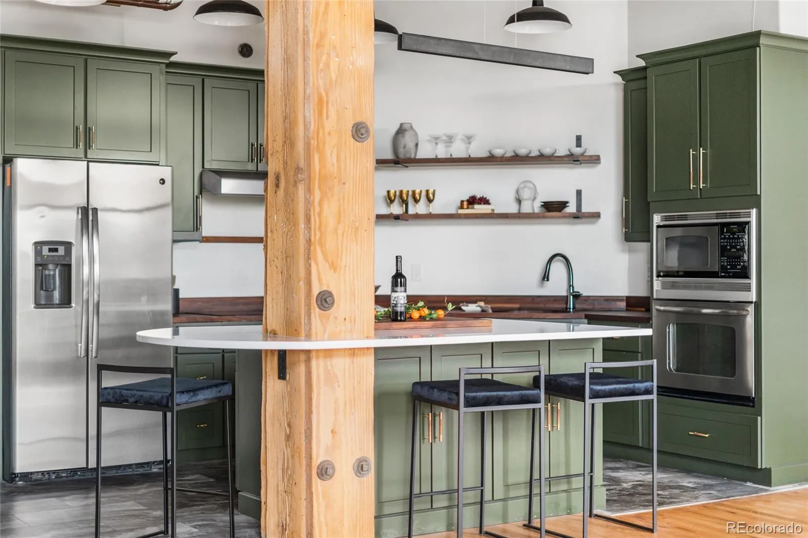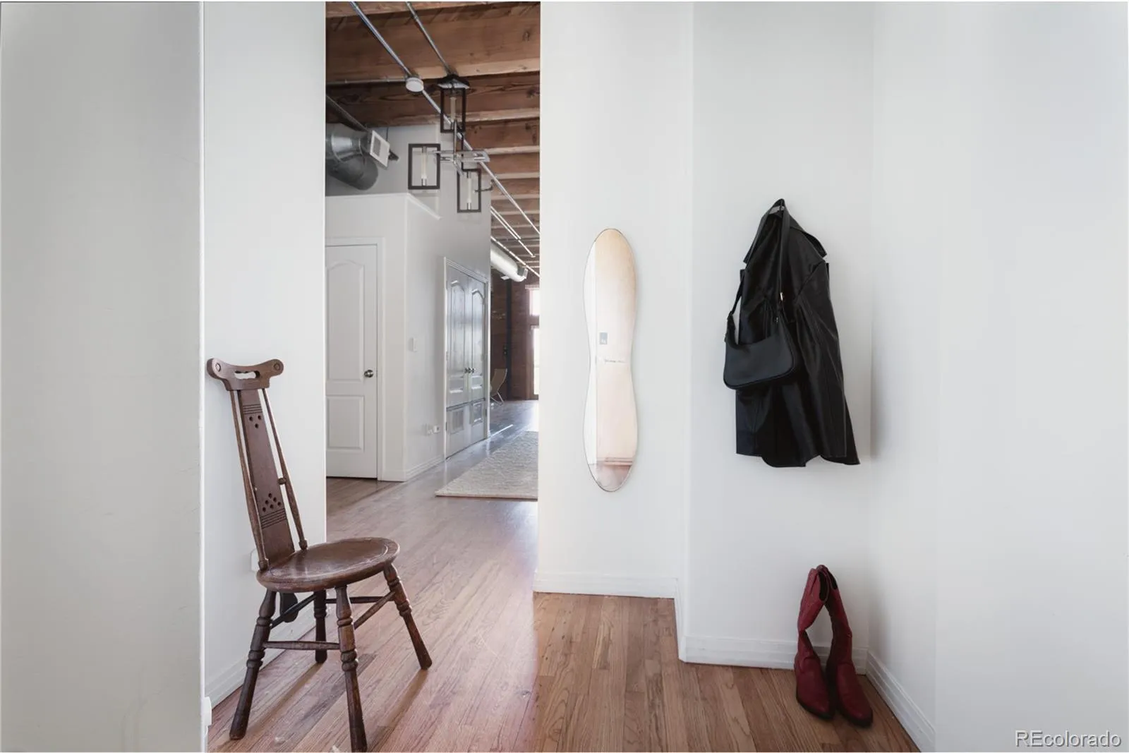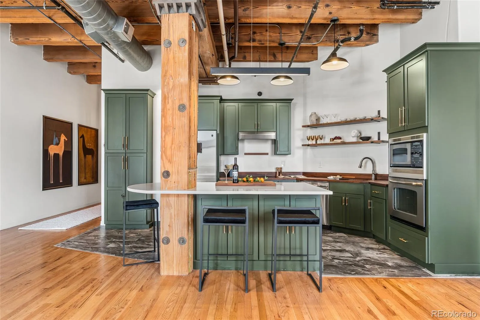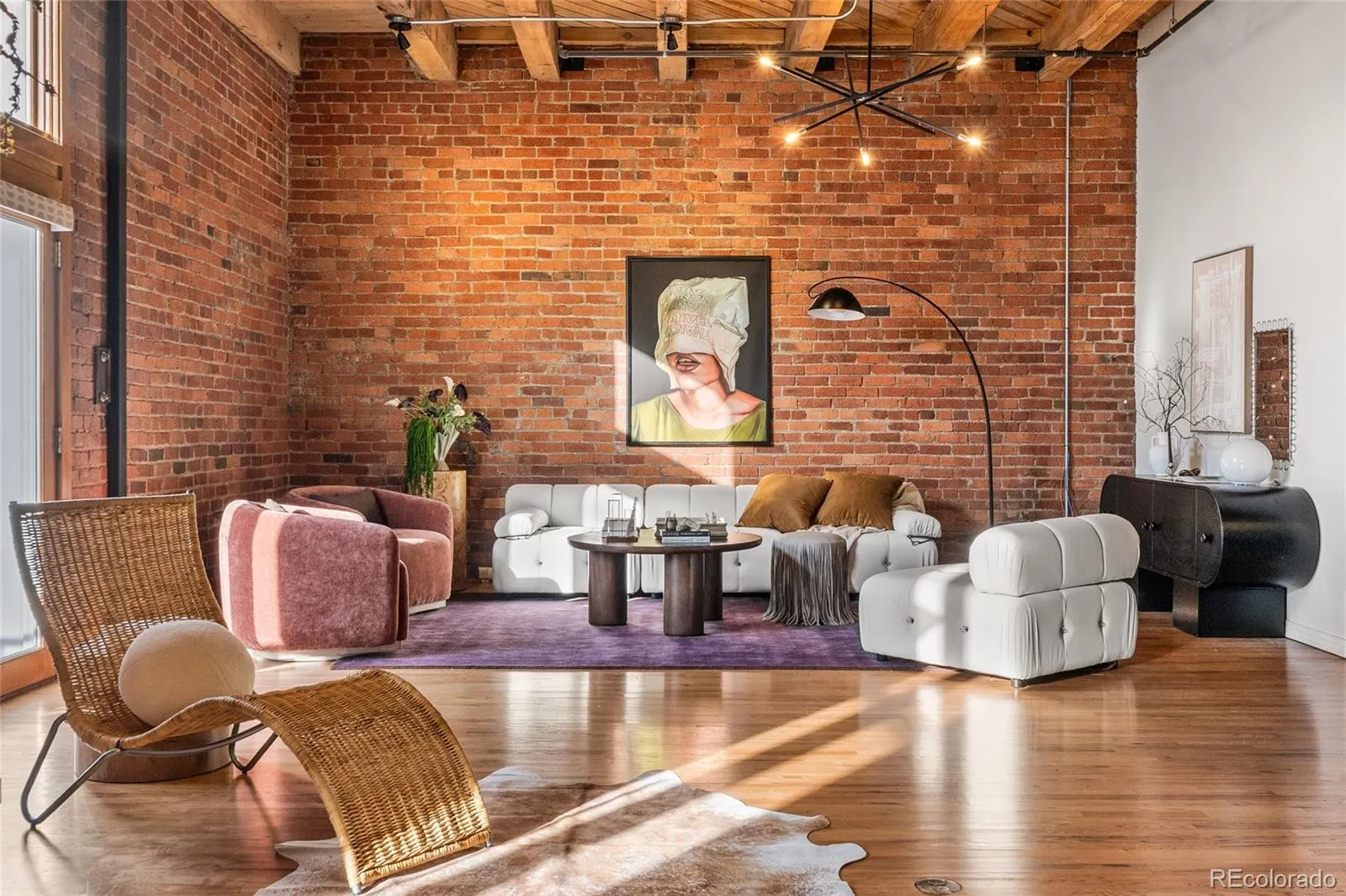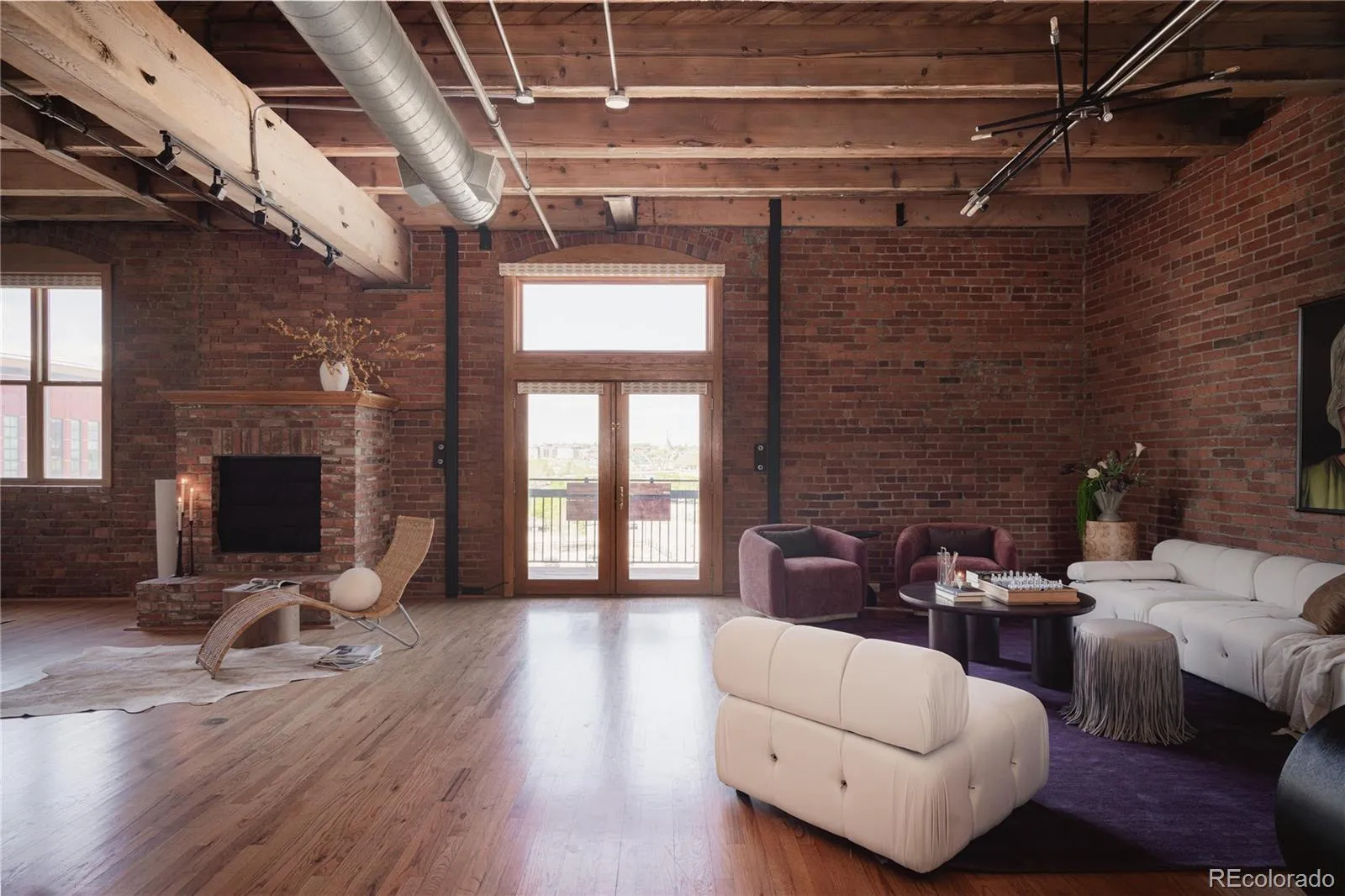 Set within a historic Denver loft building, this refined two bedroom, two bath residence blends original character with a polished, modern feel. The main living space is open and inviting, defined by exposed timber beams, brick walls, and warm hardwood floors, all grounded by a cozy gas fireplace. Large south facing windows fill the home with natural light and frame city and mountain views, while French doors open to a private balcony for morning coffee or evening sunsets.