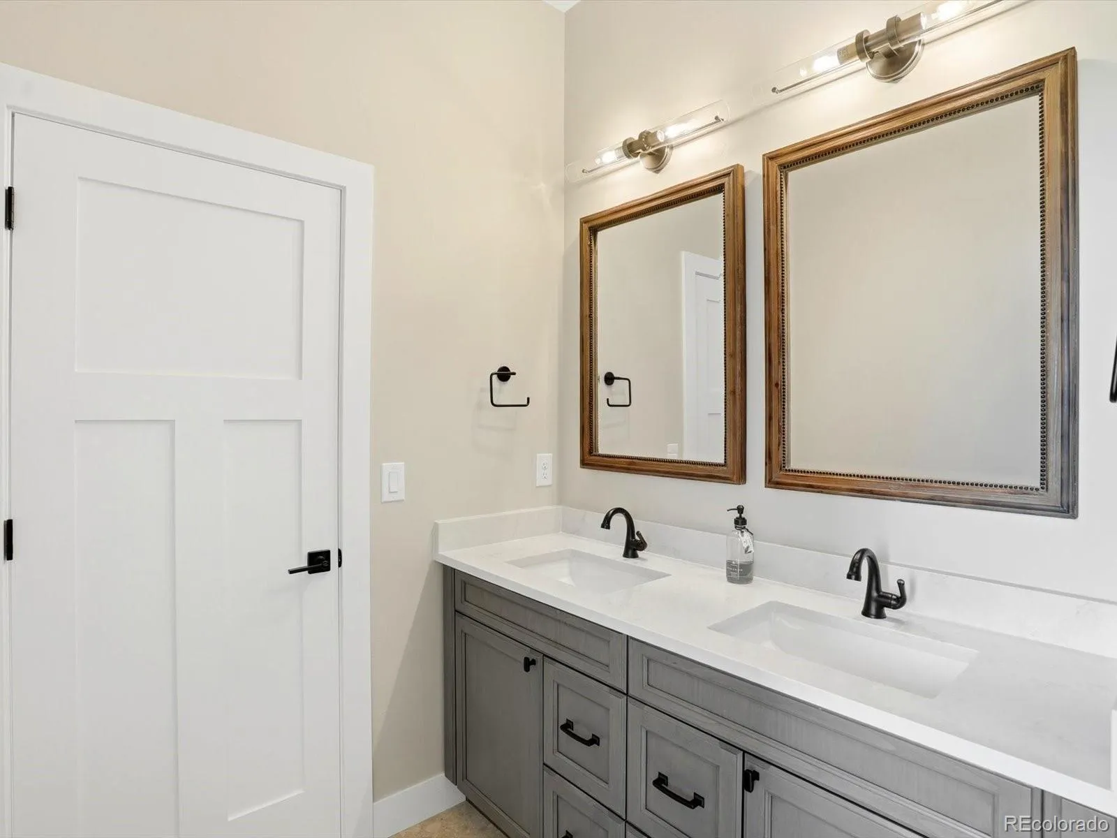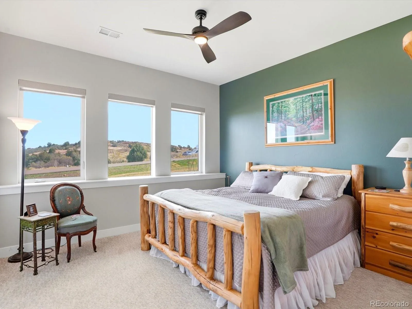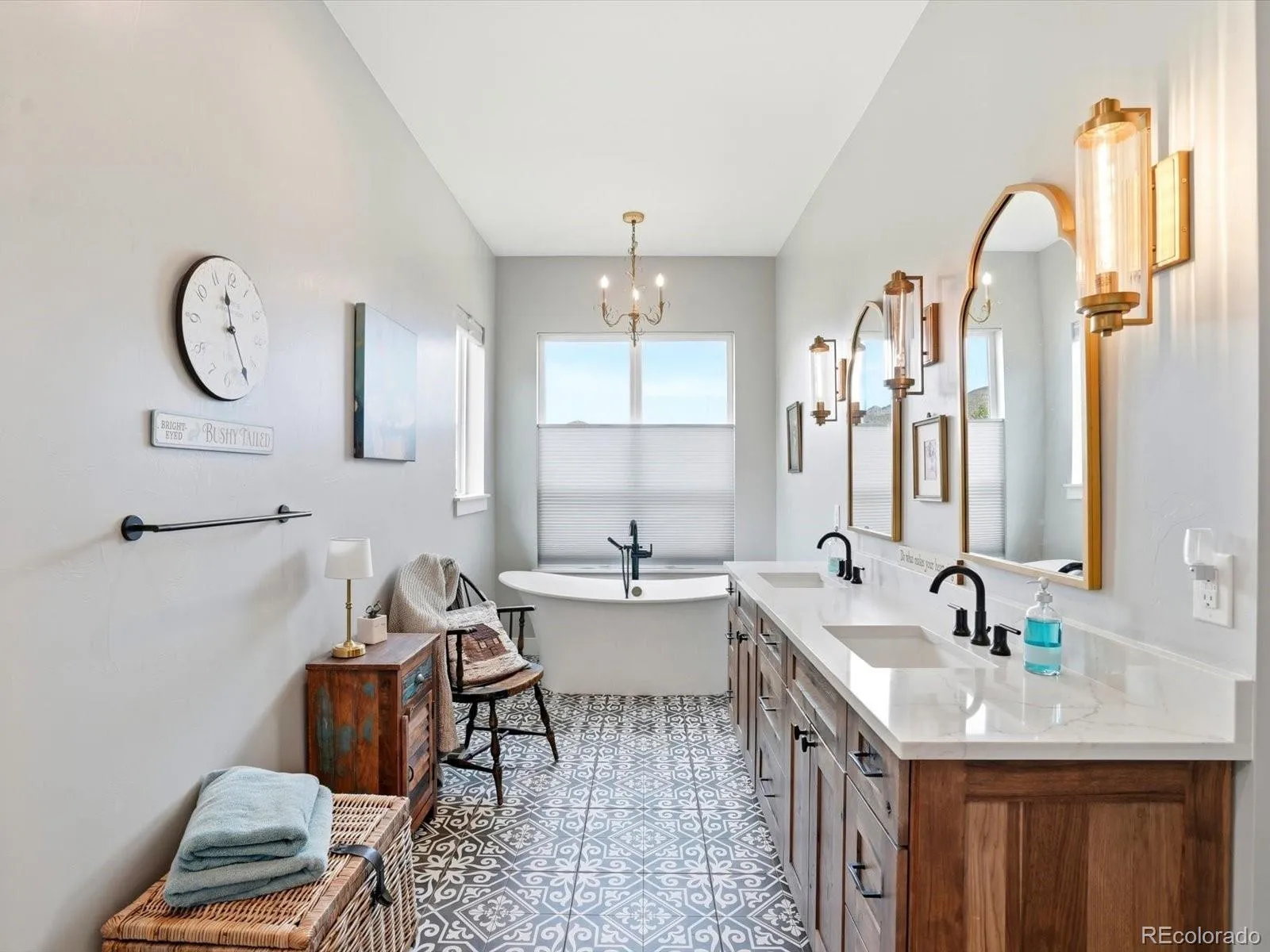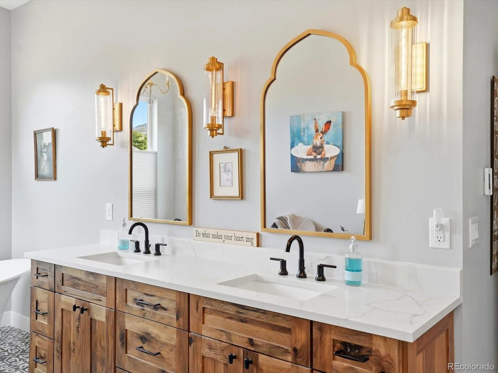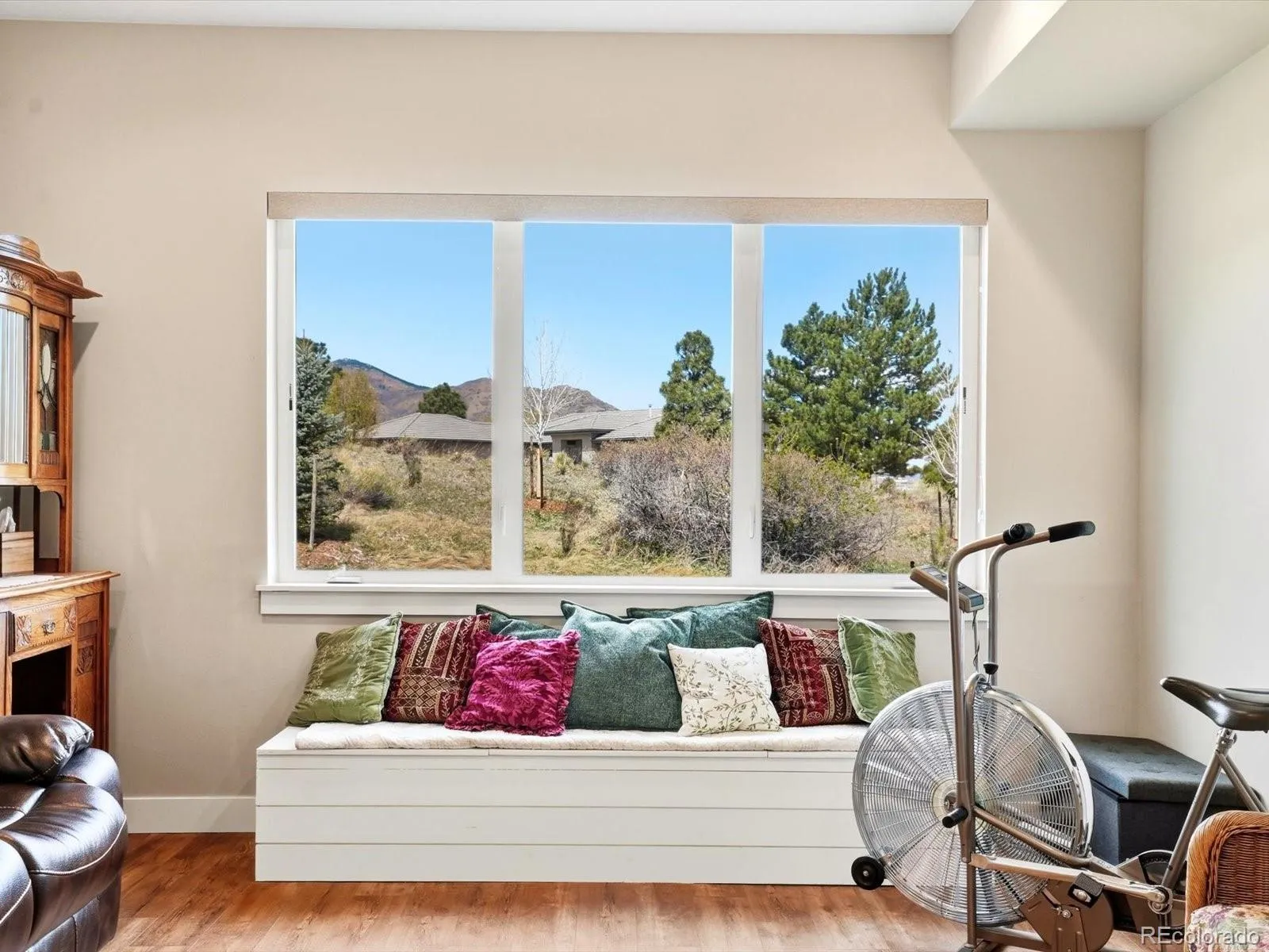 The thoughtfully designed main level includes both the primary suite and a secondary bedroom. The primary suite is a true retreat, featuring a spa-inspired bathroom with heated floors, a walk-in shower, a freestanding soaking tub, custom cabinetry, and foothill views. A spacious walk-in closet with custom shelving and built-ins completes the suite.