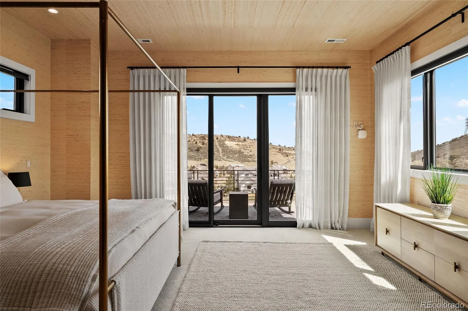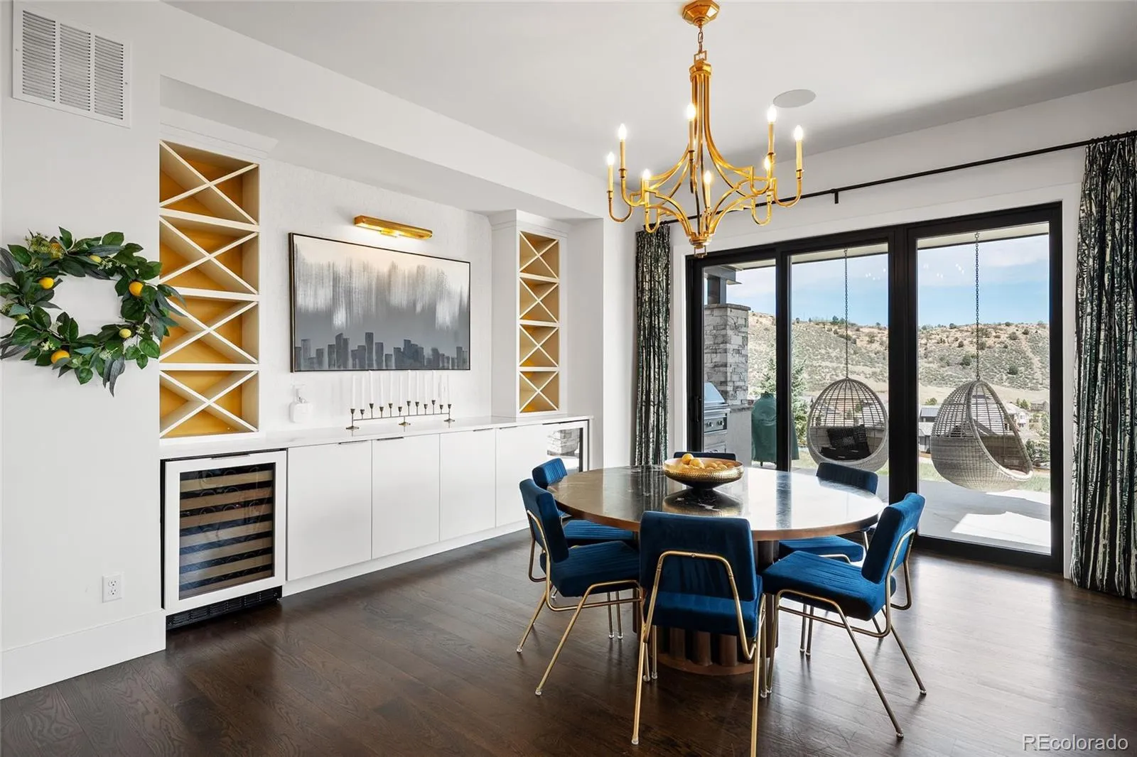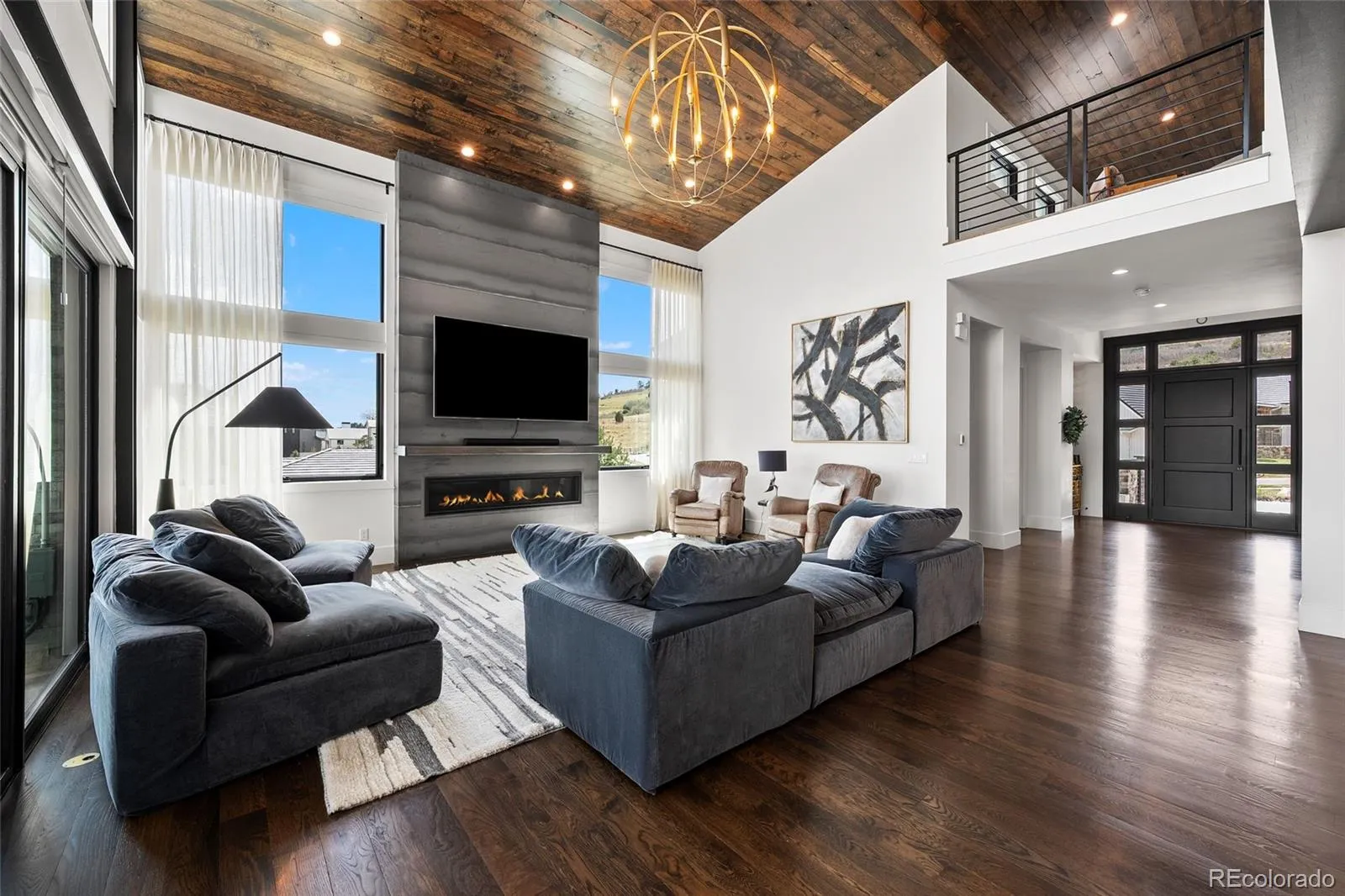 A rare collaboration between custom builder Ades Design and acclaimed interior designer Andrea Schumacher, this Colorado foothills estate is as much a work of art as it is a home. Every room tells its own story — unexpected textures, curated color palettes, and bespoke details that elevate each space beyond the ordinary. Soaring 20′ tongue-and-groove ceilings, a sculptural steel fireplace, and walls of glass framing the Rocky Mountains set the tone from the moment you enter. The gourmet kitchen and dining room — complete with high end appliances, a custom built-in buffet and dual wine refrigerators — were made for the kind of slow Sunday mornings and effortless dinner parties that define Colorado living at its best. The primary suite is pure indulgence: a fireplace, a spa bath with oversized shower and soaking tub, and a private balcony where the mountains are yours alone. Three additional ensuite bedrooms, each with their own distinct character, plus a loft and sitting area complete the upper level. The walkout basement shifts the mood entirely — a recreation room with fireplace, a second guest suite, and behind custom barn doors, a dreamy gym with rubber floors and a mirrored wall. A lofted kids’ playroom with custom ladder adds a touch of whimsy. Step outside and the Colorado lifestyle continues — neighborhood trails, a park, and a playground are right at your doorstep, perfect for morning runs, weekend rides, or afternoons with kids. Everyday conveniences including shopping, dining, and restaurants are just minutes away, making this the rare property where you never have to choose between serenity and convenience. Set just 25 minutes from Denver and 15 from downtown Littleton, with optional membership to Red Rocks Country Club for golf, pool, and year-round programming — this is Colorado lifestyle living, fully realized and beautifully designed.
