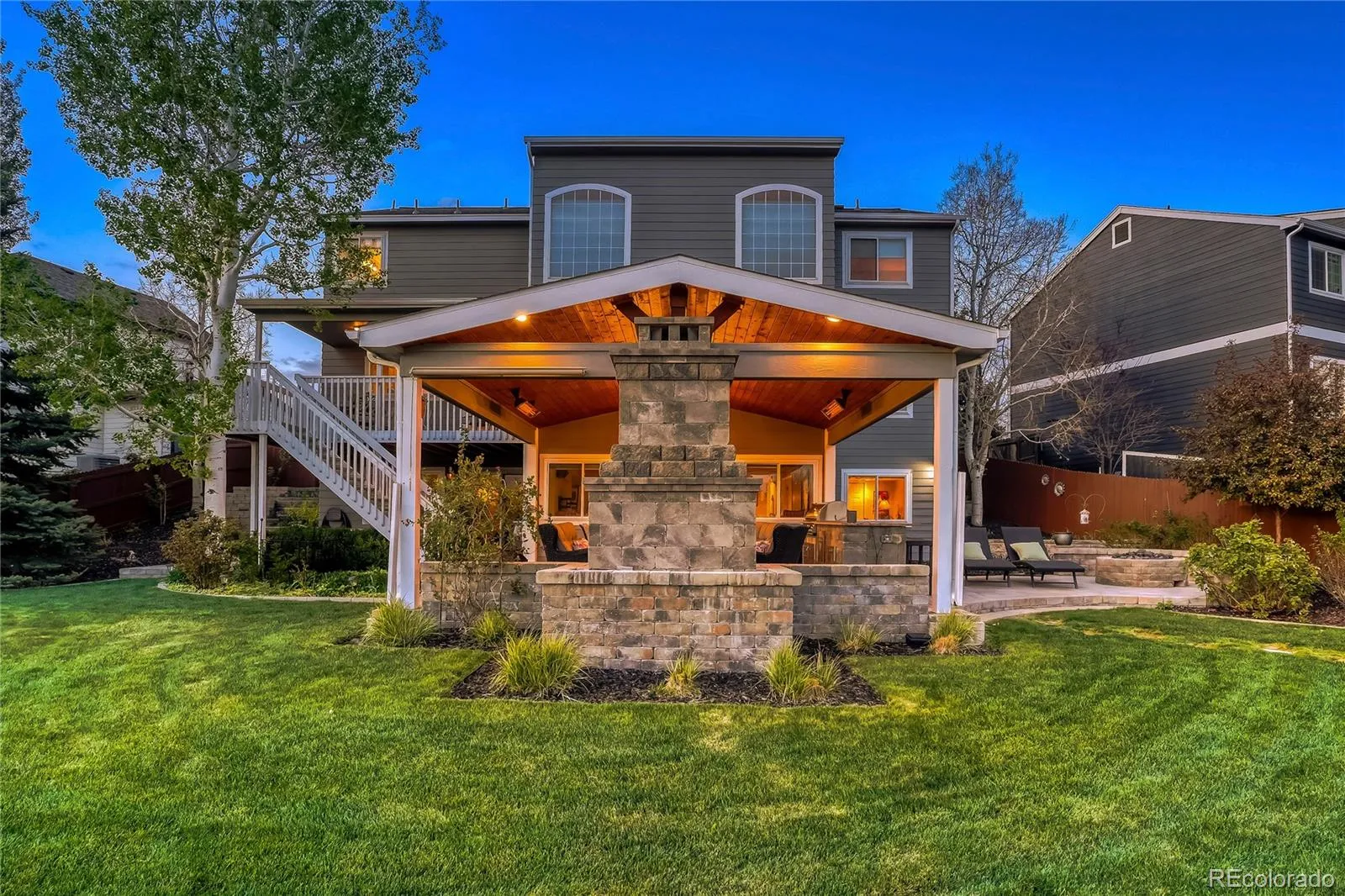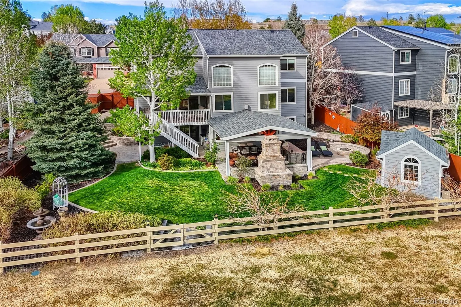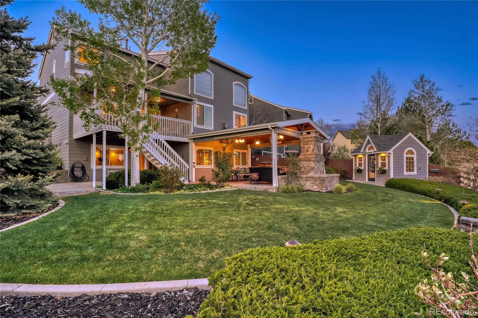 YOU NEED TO SEE THIS HOUSE! Welcome to 19548 E Powers Place, a beautiful and updated home located in the Tuscany neighborhood, where the desired Rolling Hills Elementary is located, and in the Cherry Creek School District that feeds into Grandview High School. It is located on a quiet street and the professionally landscaped yard provides for great curb appeal and great entertainment. As you walk into the house you immediately notice the attractive finishings and pride of ownership. The spacious eat-in kitchen has granite counters, hardwood floors, backsplash, Kitchenaide appliances, an island and access to the COVERED PATIO with views of the Open Space and mountains. The family room has an 18 foot ceiling and a fireplace with brick surround, and the main floor has a Dining room, Living Room, Office and Powder Room. On the upper floor you will find a very large Primary Bedroom w/ vaulted ceiling, ceiling fan and walkin closet. The Primary 5-piece bath has quartz counter, updated glass shower, soaking tub, tile walls and floor and a great view of the mountains. This level also has three more bedrooms, a laundry room and a recently updated Full bath with tile floor and glass door to the tub. The large and completely finished WALKOUT BASEMENT has two bedrooms, a Great Room with a fireplace, a wetbar and another living area with access to the doors to the incredible covered patio. Finally, a very private backyard on OPEN SPACE with multiple living spaces including an incredible covered patio that is an entertainers dream! It includes a large stone fireplace, a 10 1/2 foot bar table with granite countertop and built in grill, heating units, a television and more. In additon to the covered patio, there is a beautiful 4-season heated “She Shed” with electricity that can be an office or a playhouse, and a gas firepit. To top it off, it has a new roof, new windows, new exterior paint, remodeled bathrooms and more! This home will sell fast, so set up a showing today!