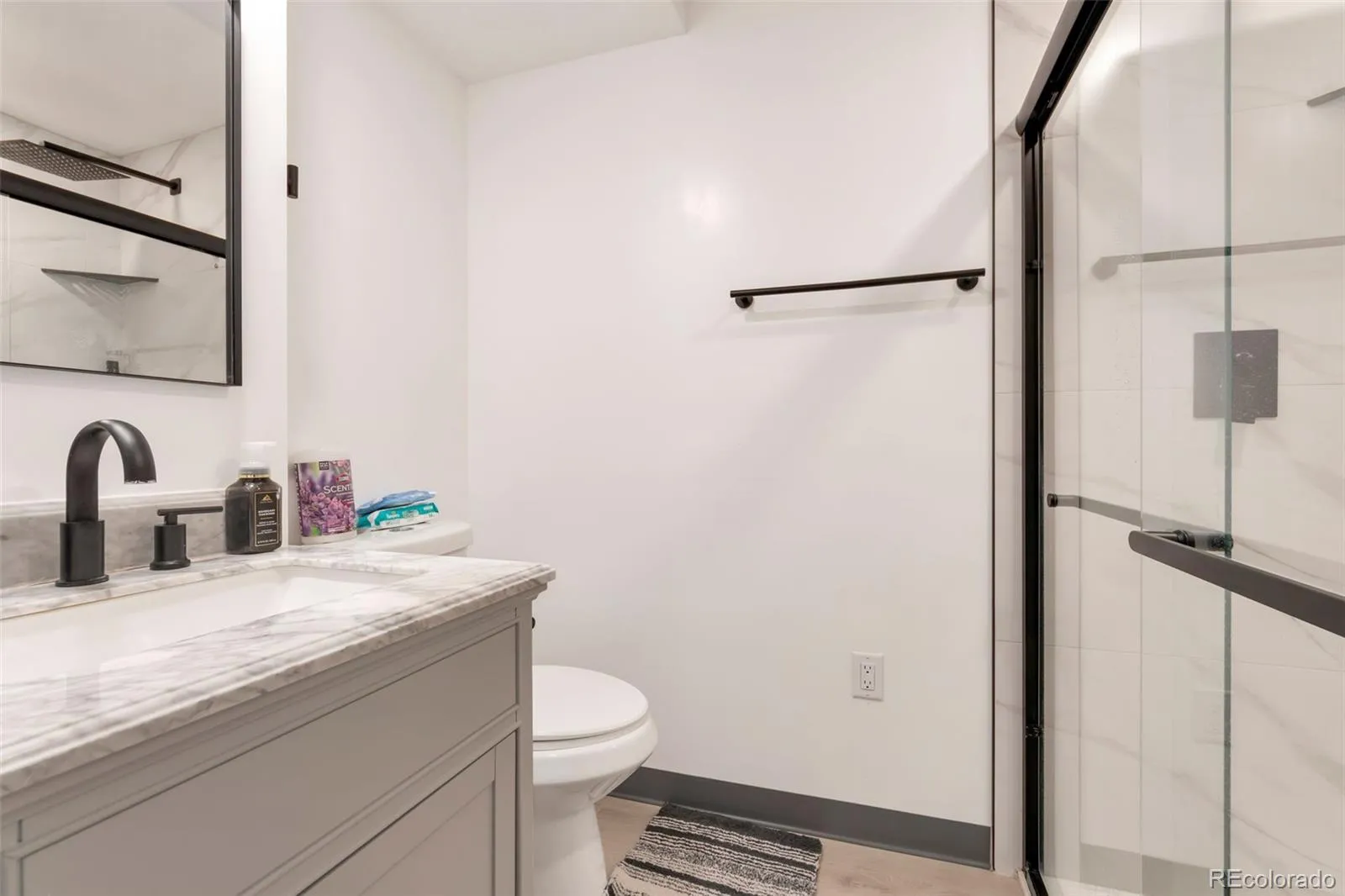 Upstairs, a vaulted primary suite gives you the retreat you deserve after a long day. Two additional bedrooms and a double-sink full bath handle the morning rush without the chaos. And downstairs, the fully finished basement surprises you with a fourth bedroom and a remodeled bath featuring marble countertops, matte black fixtures, and a glass-enclosed shower. That is the kind of upgrade you did not see coming.