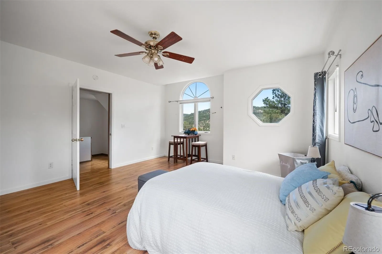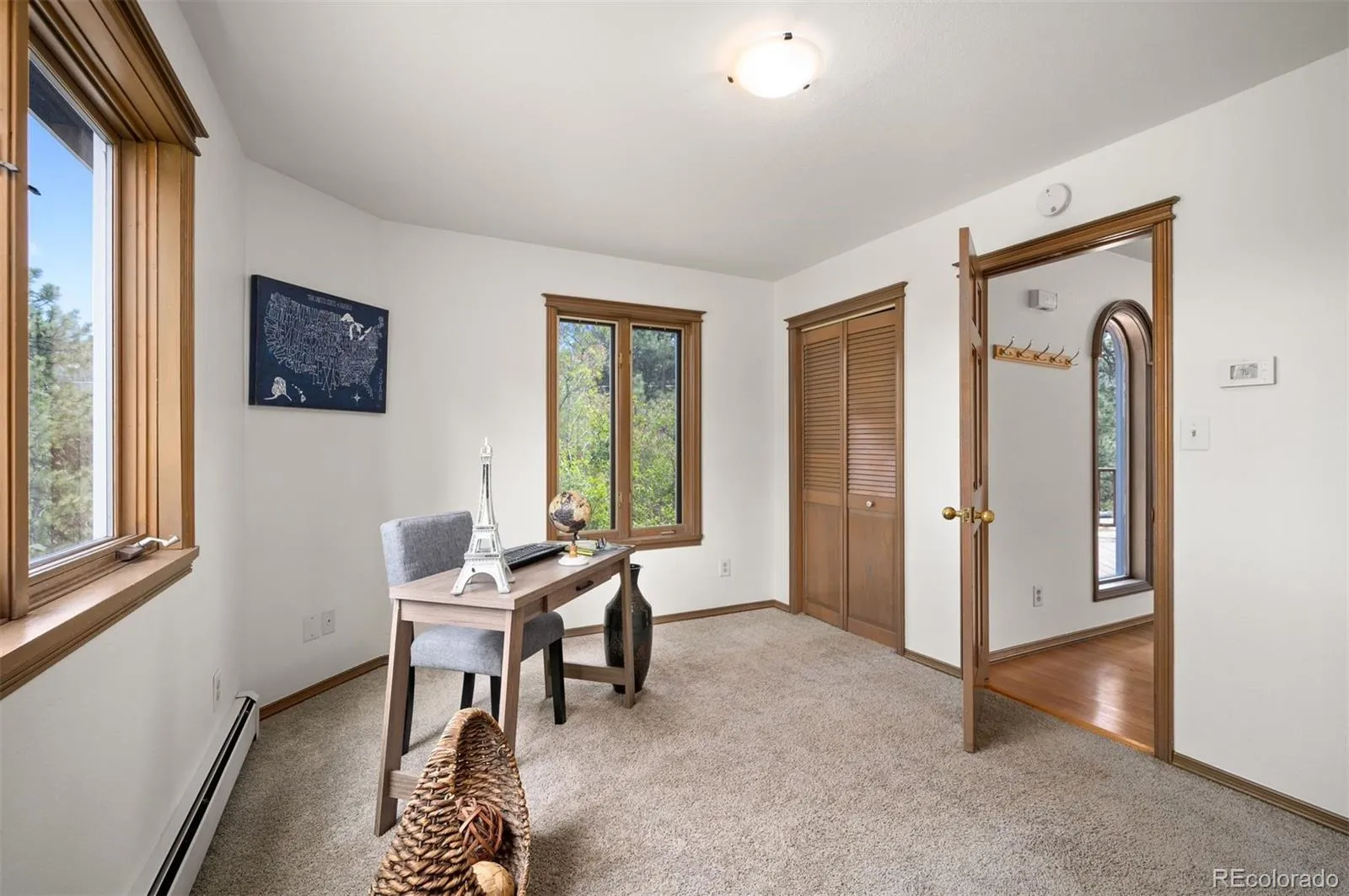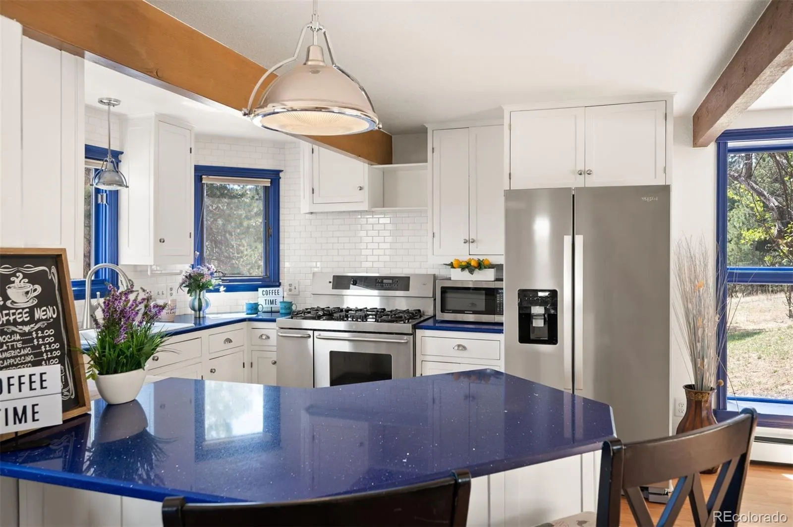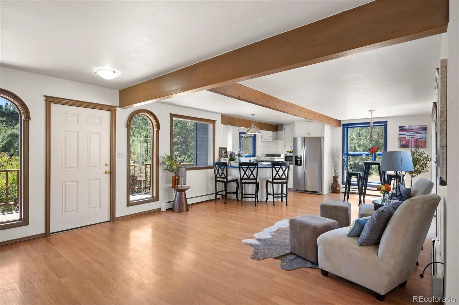 Nestled into the Foothills of The Rocky Mountains Your Shire Awaits! Very well care for turn key ready mountain contemporary home that is nestled in on 1.55 acres. Amazing mountain views from every room! The multiple decks and outdoors areas allow plenty of room for entertaining. Imagine sitting on the back deck watching the Elk, Moose & Deer roaming in the backyard. Exposed wood beams and an open floor plan captures the charm of mountain living at its finest. Updated kitchen to include newer stainless steel appliances, cabinets and granite counters. Imagine winter nights around the cozy wood stove fireplace watching the snow fall! The main level offers 2 bedrooms, full bathroom and laundry. Upper level private primary suite with plenty of room for a king size bed and additional furnishings. Imagine waking up in the morning and taking in the views from the private deck located off the primary suite. Private Primary bathroom with plenty of space and a luxury claw foot RED soaking tub! The upper level bonus room could be used as an additional bedroom, home office, gym, art studio, homeschool room or recreation room. The home is located within 5 minutes of downtown Evergreen and Evergreen Lake. Hiking and biking trails and open space are one of the many attributes of this location. The septic system has recently been updated to include and advanced treatment system. New paved driveway with plenty of room to add a garage if desired. The possibilities of this home and location are truly a rare find for this fantastic location. If you are looking for the perfect piece of mountain paradise to call your own, your search is over! Welcome Home