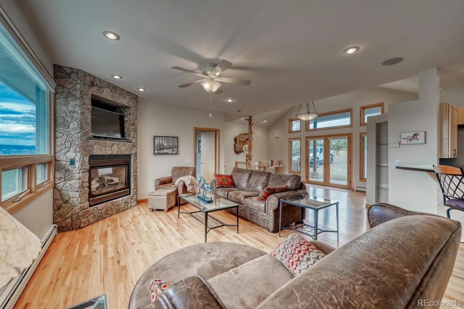 A welcoming entry with custom built-ins and framed mountain views leads into the expansive great room and open-concept living space. The main level features hardwood floors, a spacious living area with a stone gas fireplace, and a beautiful kitchen with a generous eat-up bar. The dining area is positioned to take in the views and opens to a spacious deck for seamless indoor-outdoor living. A mudroom and laundry connect directly to the attached garage for added convenience.