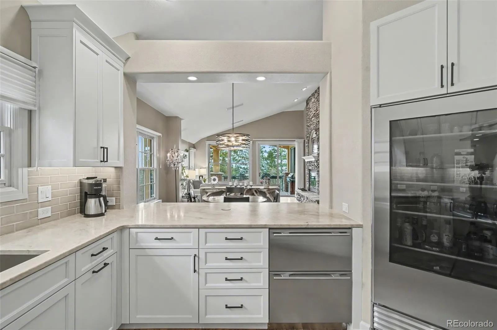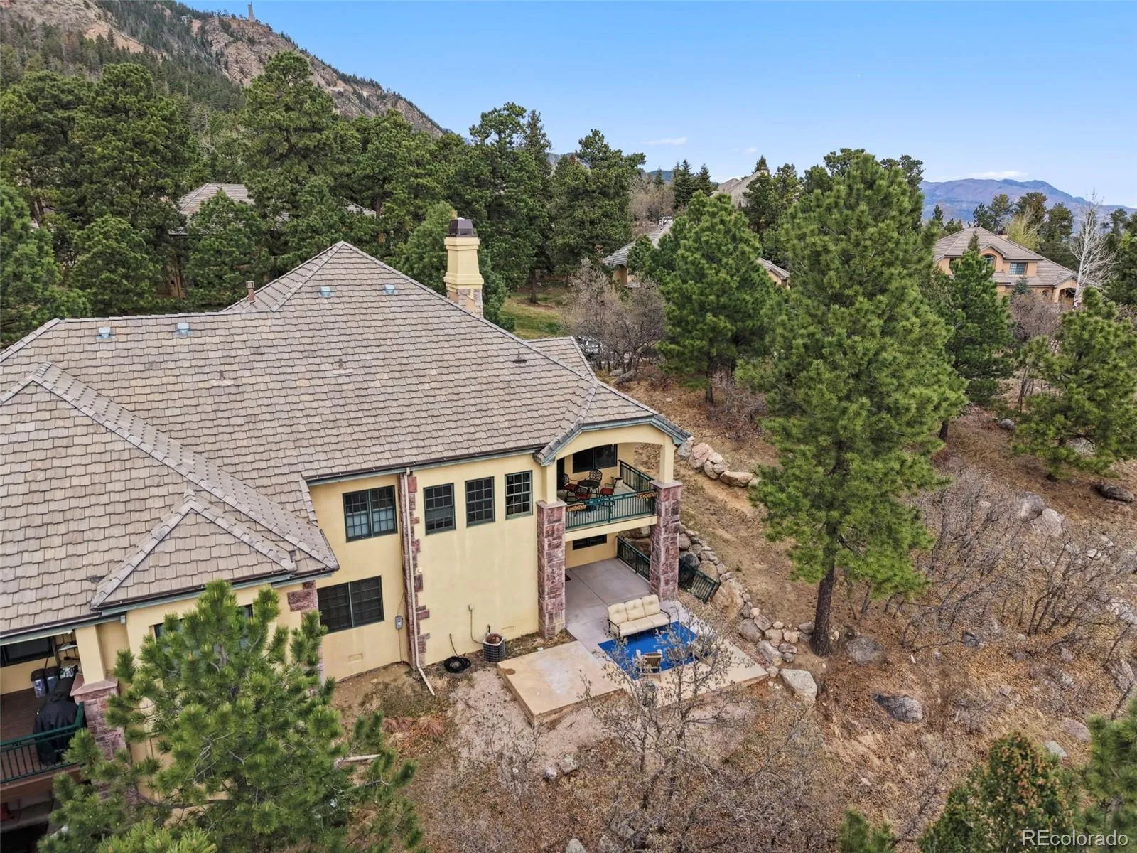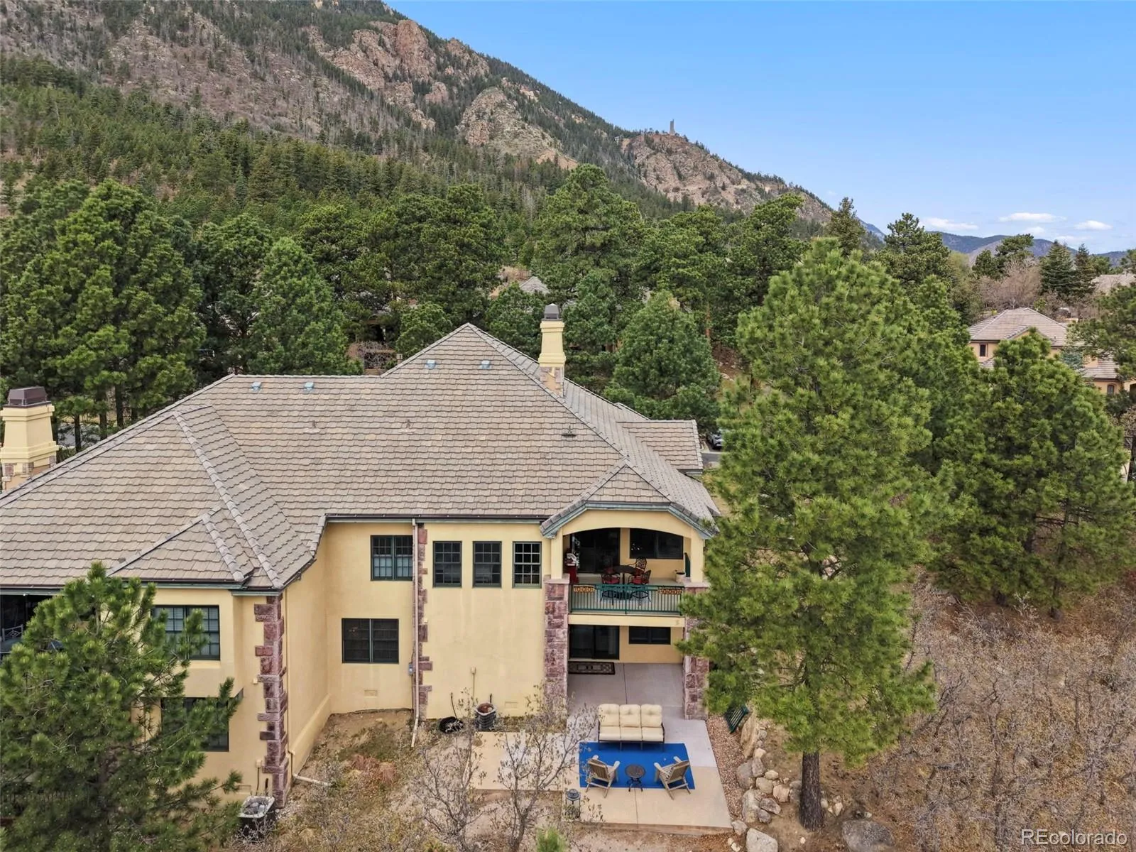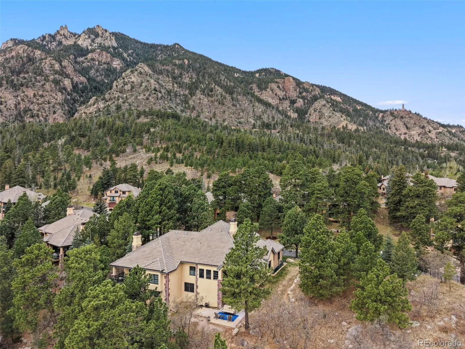 Luxury living in the gated Broadmoor Resort Community on Cheyenne Mountain. This beautifully updated end-unit villa offers exceptional privacy, backing to open space with sweeping city views and access to 67 acres of private hiking trails. The professionally updated interior features a new kitchen and updated finishes throughout, complemented by new blinds across the home. The main-level living area is designed for comfort and style, showcasing vaulted ceilings, built-ins, abundant natural light, and a striking gas fireplace that anchors the space. Enjoy true main-level living with a spacious primary suite, laundry, living, and dining all conveniently located on the main floor, along with a dedicated office ideal for working from home. The primary suite offers a relaxing retreat with well-appointed finishes and easy access to outdoor living. Step outside to a covered main-level deck, perfect for year-round enjoyment, or head to the expanded lower-level patio, designed for entertaining with space for a hot tub and fire pit, all set against a backdrop of peaceful open space. The lower level is ideal for guests or multi-generational living, featuring additional bedrooms, a full bath, a generous family room, and a second gas fireplace that creates a warm, inviting atmosphere. With 4 bedrooms, 3.5 bathrooms, two gas fireplaces, and thoughtfully designed living spaces throughout, this home blends functionality with refined mountain living. Residents of the Broadmoor Resort Community enjoy 24/7 gated security and the option to join the renowned Broadmoor Golf Club, offering world-class amenities including golf, dining, spa services, and more. Set in a quiet, sought-after location, this villa delivers a rare combination of privacy, views, and elevated lifestyle. Welcome home.