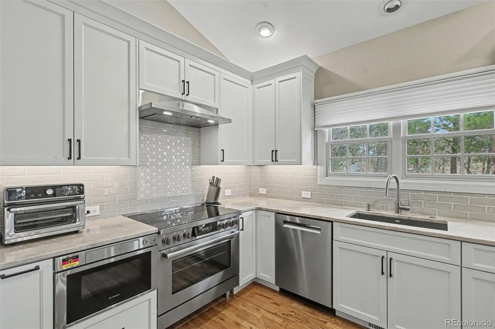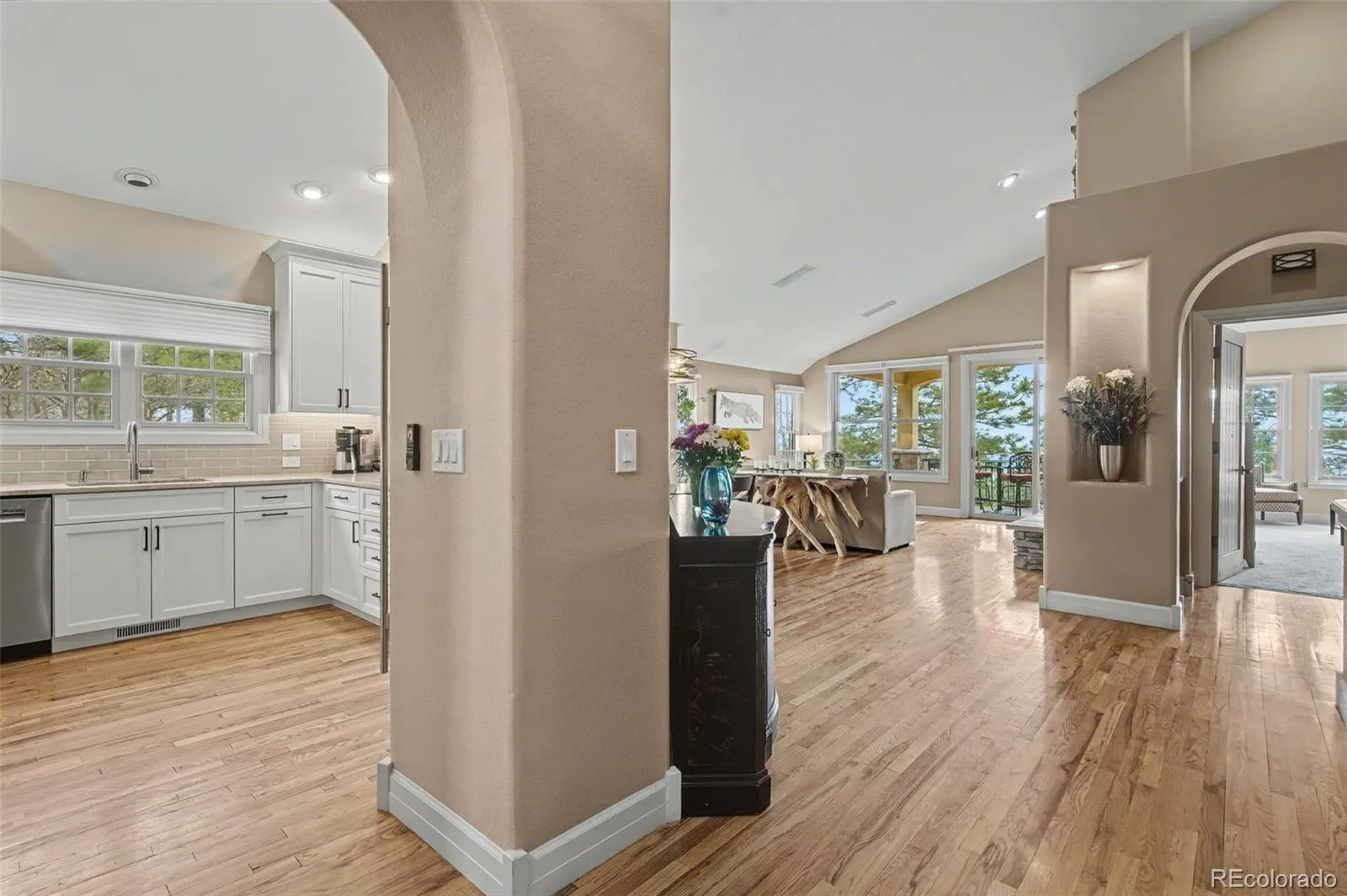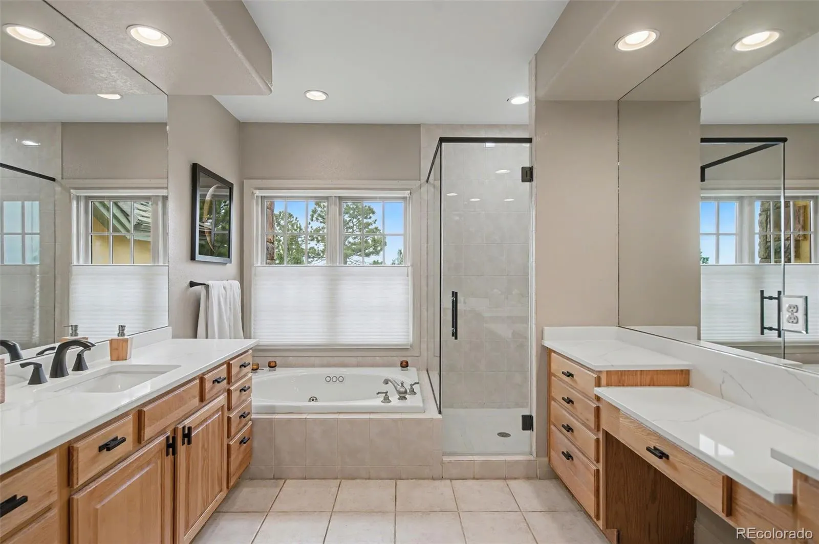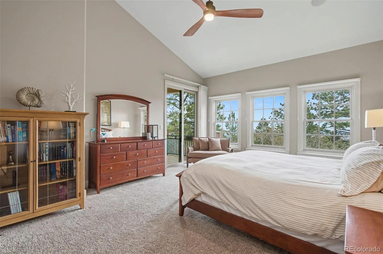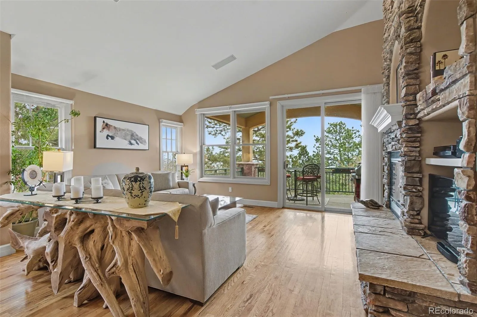 Luxury living in the gated Broadmoor Resort Community on Cheyenne Mountain. This beautifully updated end-unit villa offers exceptional privacy, backing to open space with sweeping city views and access to 67 acres of private hiking trails. The professionally updated interior features a new kitchen and updated finishes throughout, complemented by new blinds across the home. The main-level living area is designed for comfort and style, showcasing vaulted ceilings, built-ins, abundant natural light, and a striking gas fireplace that anchors the space. Enjoy true main-level living with a spacious primary suite, laundry, living, and dining all conveniently located on the main floor, along with a dedicated office ideal for working from home. The primary suite offers a relaxing retreat with well-appointed finishes and easy access to outdoor living. Step outside to a covered main-level deck, perfect for year-round enjoyment, or head to the expanded lower-level patio, designed for entertaining with space for a hot tub and fire pit, all set against a backdrop of peaceful open space. The lower level is ideal for guests or multi-generational living, featuring additional bedrooms, a full bath, a generous family room, and a second gas fireplace that creates a warm, inviting atmosphere. With 4 bedrooms, 3.5 bathrooms, two gas fireplaces, and thoughtfully designed living spaces throughout, this home blends functionality with refined mountain living. Residents of the Broadmoor Resort Community enjoy 24/7 gated security and the option to join the renowned Broadmoor Golf Club, offering world-class amenities including golf, dining, spa services, and more. Set in a quiet, sought-after location, this villa delivers a rare combination of privacy, views, and elevated lifestyle. Welcome home.