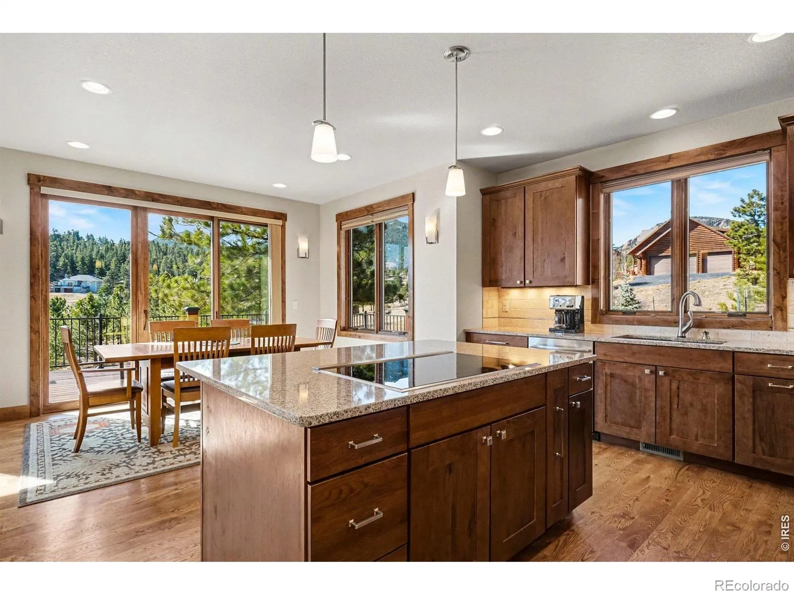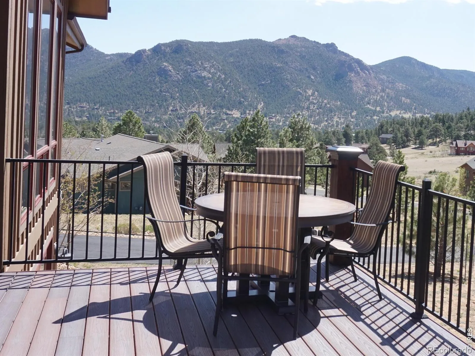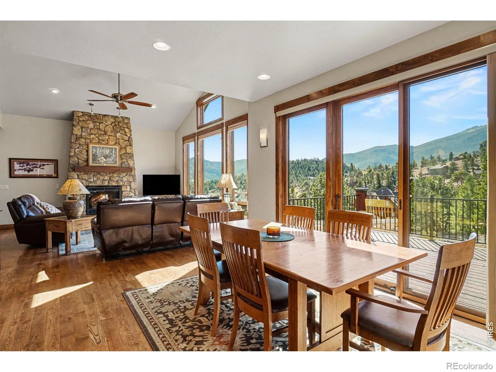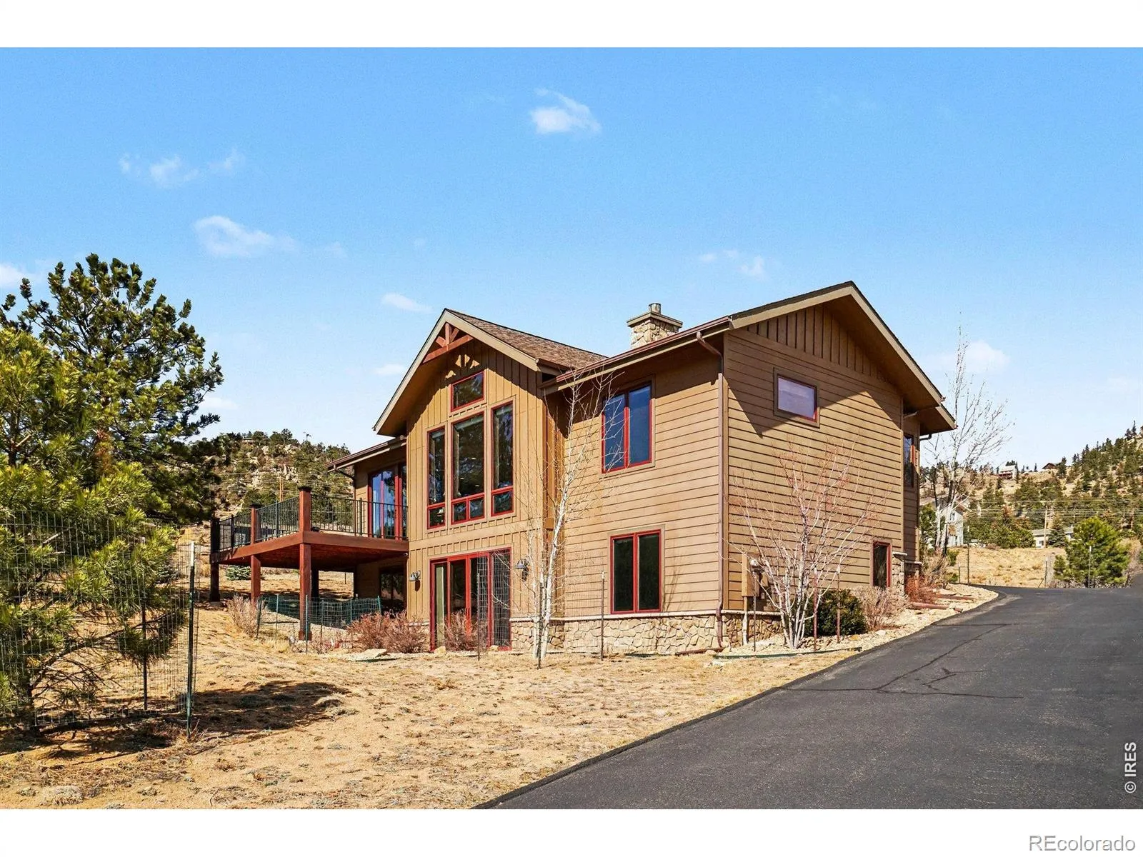 Wake to sunrises over Estes Valley with sweeping views. Located in Cherokee Meadows on a quiet street, is this thoughtfully designed house with 2822 square feet of living space on a 1.12 acre lot. Built in 2018, the open-concept main level is filled with natural light & ideal for gathering, featuring a spacious great room that is highlighted by a soaring vaulted ceiling with a striking stone fireplace and hardwood floors that flows seamlessly onto a large deck, perfect for everyday living & entertaining with a stunning mountain backdrop. At the heart of the home is the kitchen with high-end appliances cooking island with downdraft cooktop, built in oven, walk in pantry and an inviting kitchen island making this the natural hub where everyone can gather. The primary suite offers a private sanctuary with a bathroom featuring oversized tile shower, double vanity, and walk-in closet with built ins. There is a private office on the main level that provides a quiet workspace. On the lower level there are 2 generous sized bedrooms, full tile bath, family room with 4 panel sliding doors to the patio, fitness room or 4th bedroom, and there is also a great craft/workshop area. Thoughtfully designed for mountain living, where you can enjoy wildlife of the area.