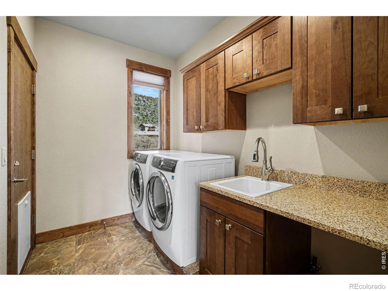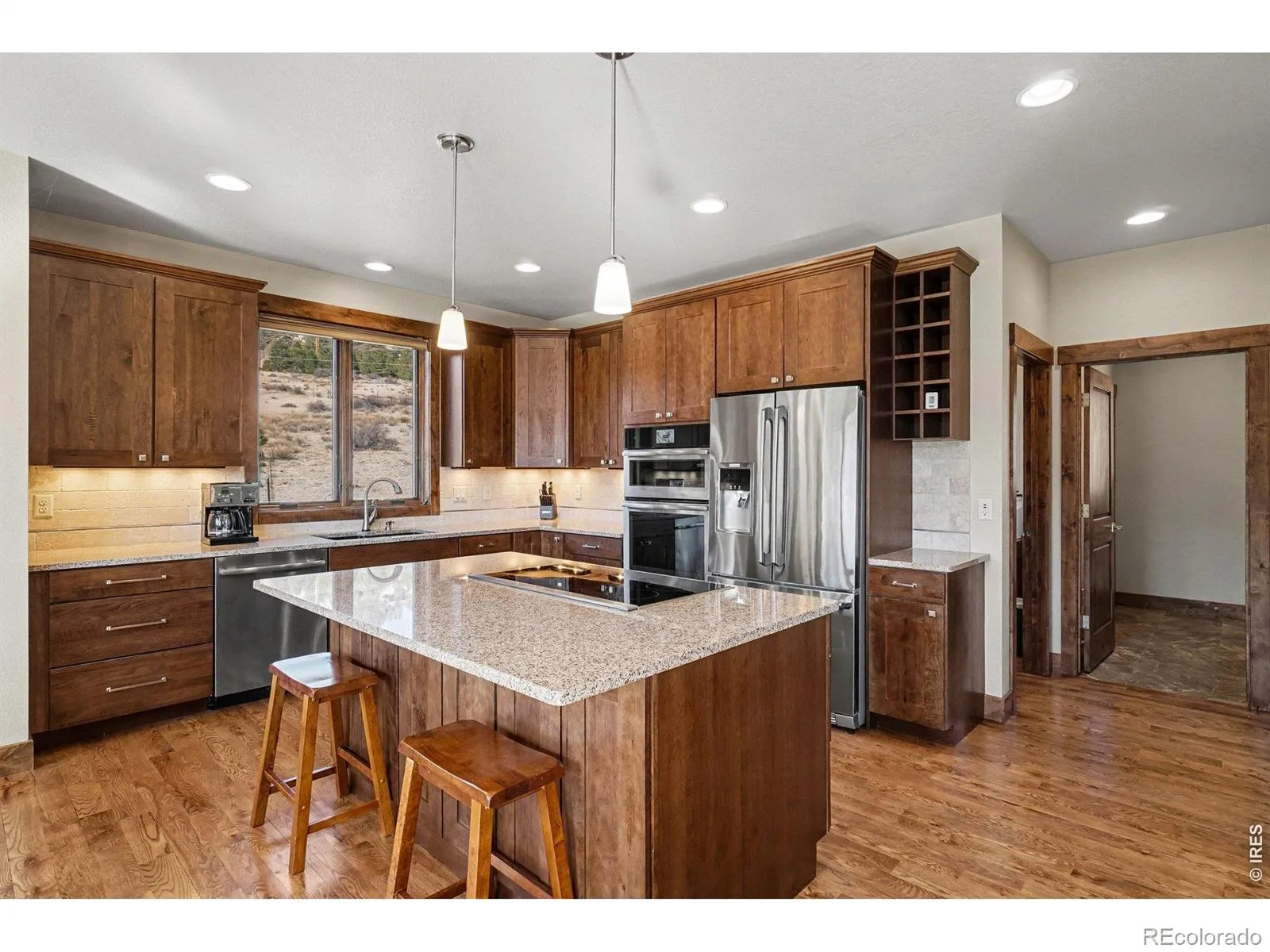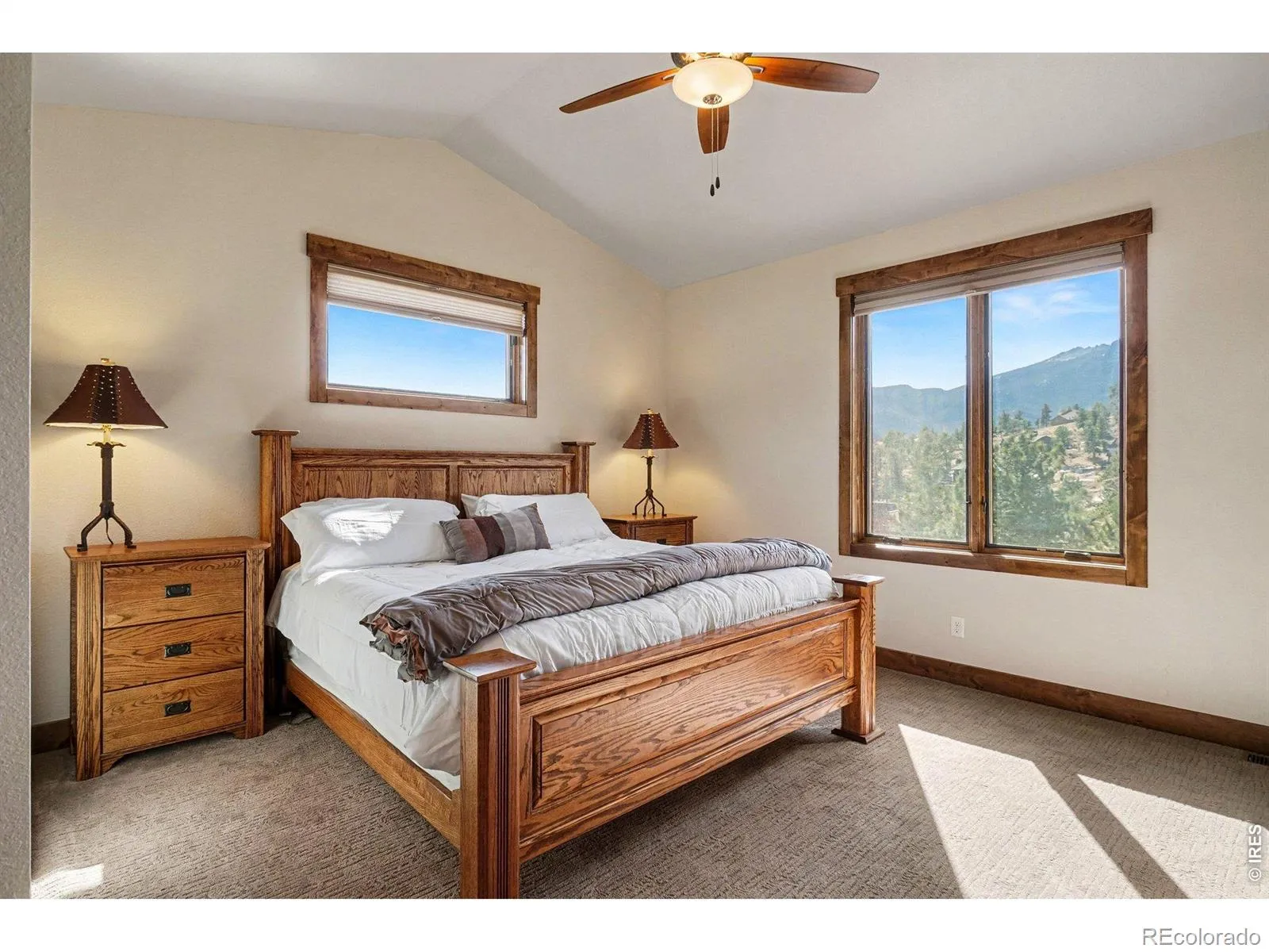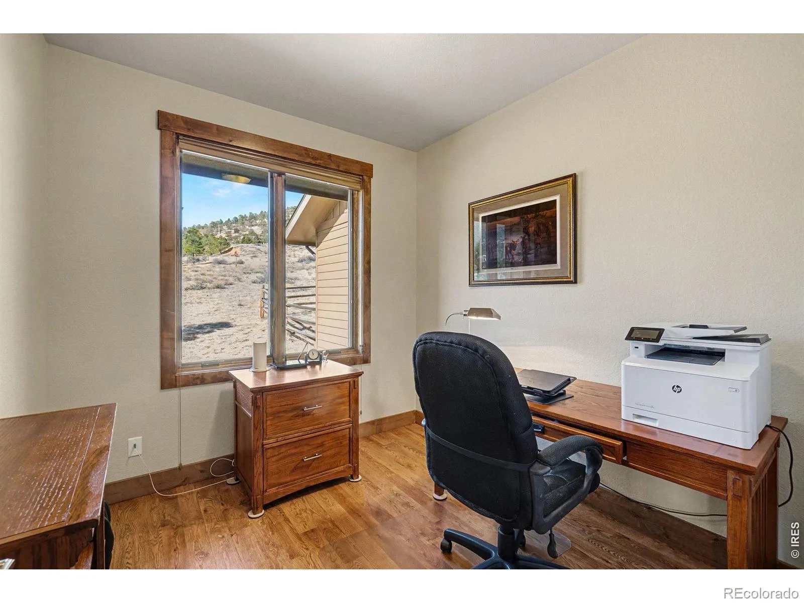 Wake to sunrises over Estes Valley with sweeping views. Located in Cherokee Meadows on a quiet street, is this thoughtfully designed house with 2822 square feet of living space on a 1.12 acre lot. Built in 2018, the open-concept main level is filled with natural light & ideal for gathering, featuring a spacious great room that is highlighted by a soaring vaulted ceiling with a striking stone fireplace and hardwood floors that flows seamlessly onto a large deck, perfect for everyday living & entertaining with a stunning mountain backdrop. At the heart of the home is the kitchen with high-end appliances cooking island with downdraft cooktop, built in oven, walk in pantry and an inviting kitchen island making this the natural hub where everyone can gather. The primary suite offers a private sanctuary with a bathroom featuring oversized tile shower, double vanity, and walk-in closet with built ins. There is a private office on the main level that provides a quiet workspace. On the lower level there are 2 generous sized bedrooms, full tile bath, family room with 4 panel sliding doors to the patio, fitness room or 4th bedroom, and there is also a great craft/workshop area. Thoughtfully designed for mountain living, where you can enjoy wildlife of the area.