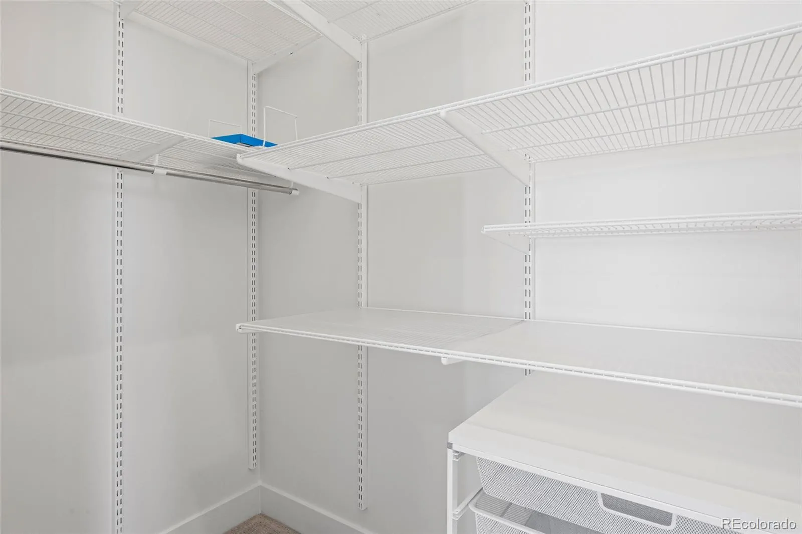 The second level is anchored by a generous primary suite featuring a well-appointed en-suite bath with a large walk-in shower and a custom walk-in closet system. A secondary bedroom and full bath provide comfortable accommodations for guests.