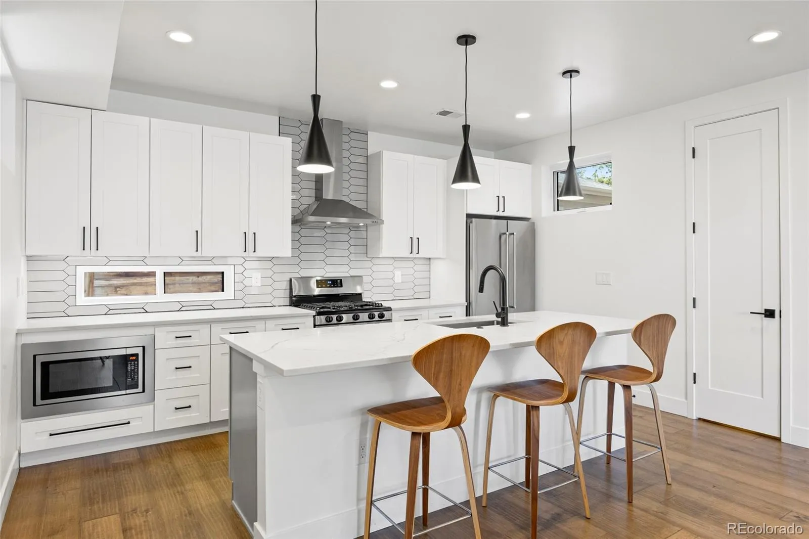 On the main level, tall ceilings and expansive windows fill the home with natural light, while sliding glass doors create seamless indoor–outdoor flow to a private patio. The open-concept layout connects the living, dining, and kitchen areas, where clean lines and modern finishes define the space. The kitchen is equipped with stainless steel appliances, a gas range, quartz countertops, soft-close cabinetry, a large island with seating and powder room.