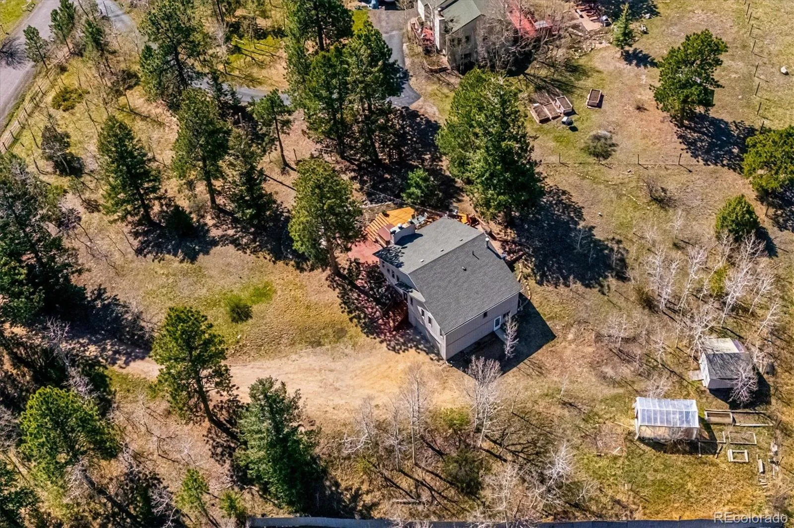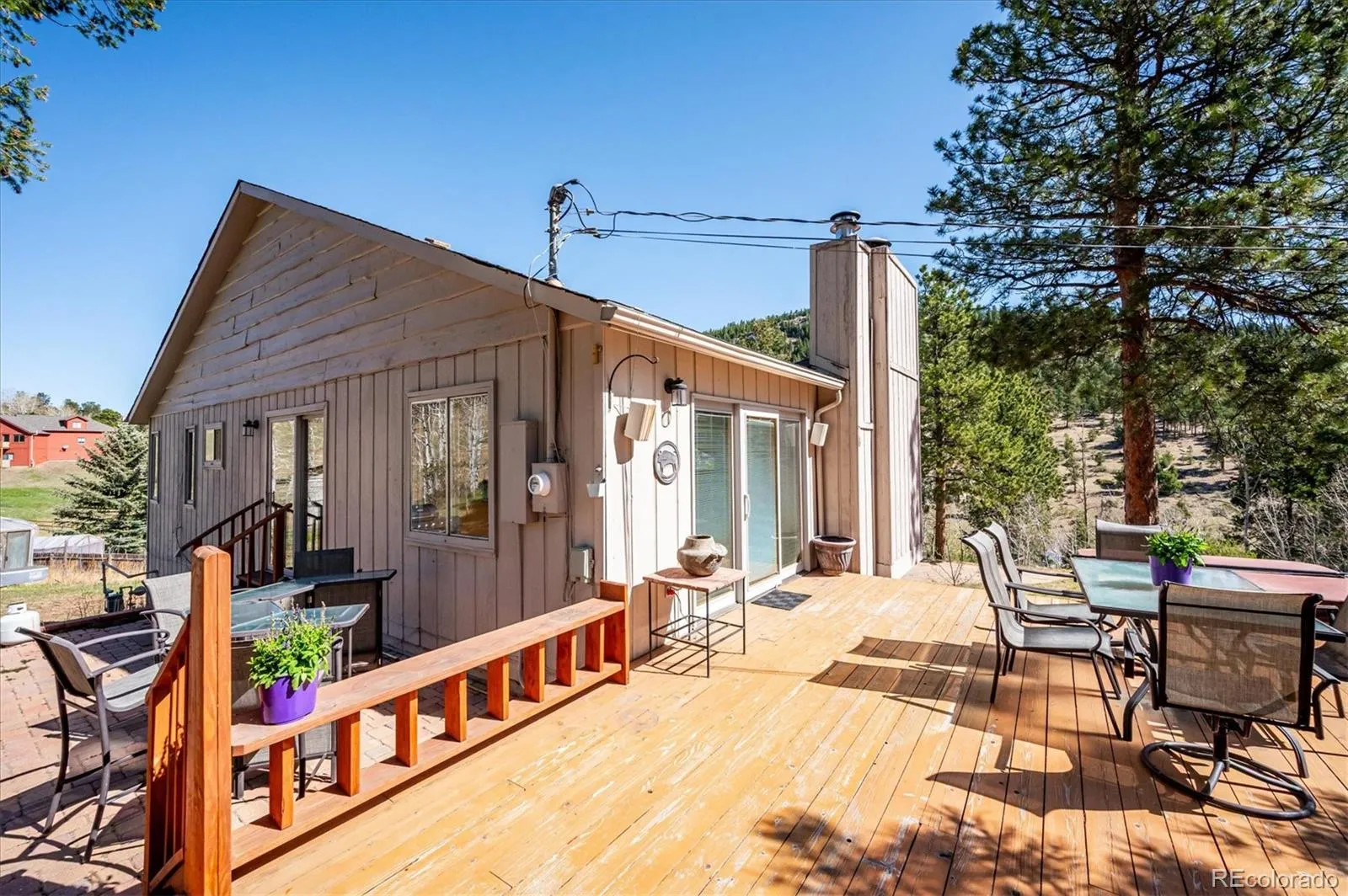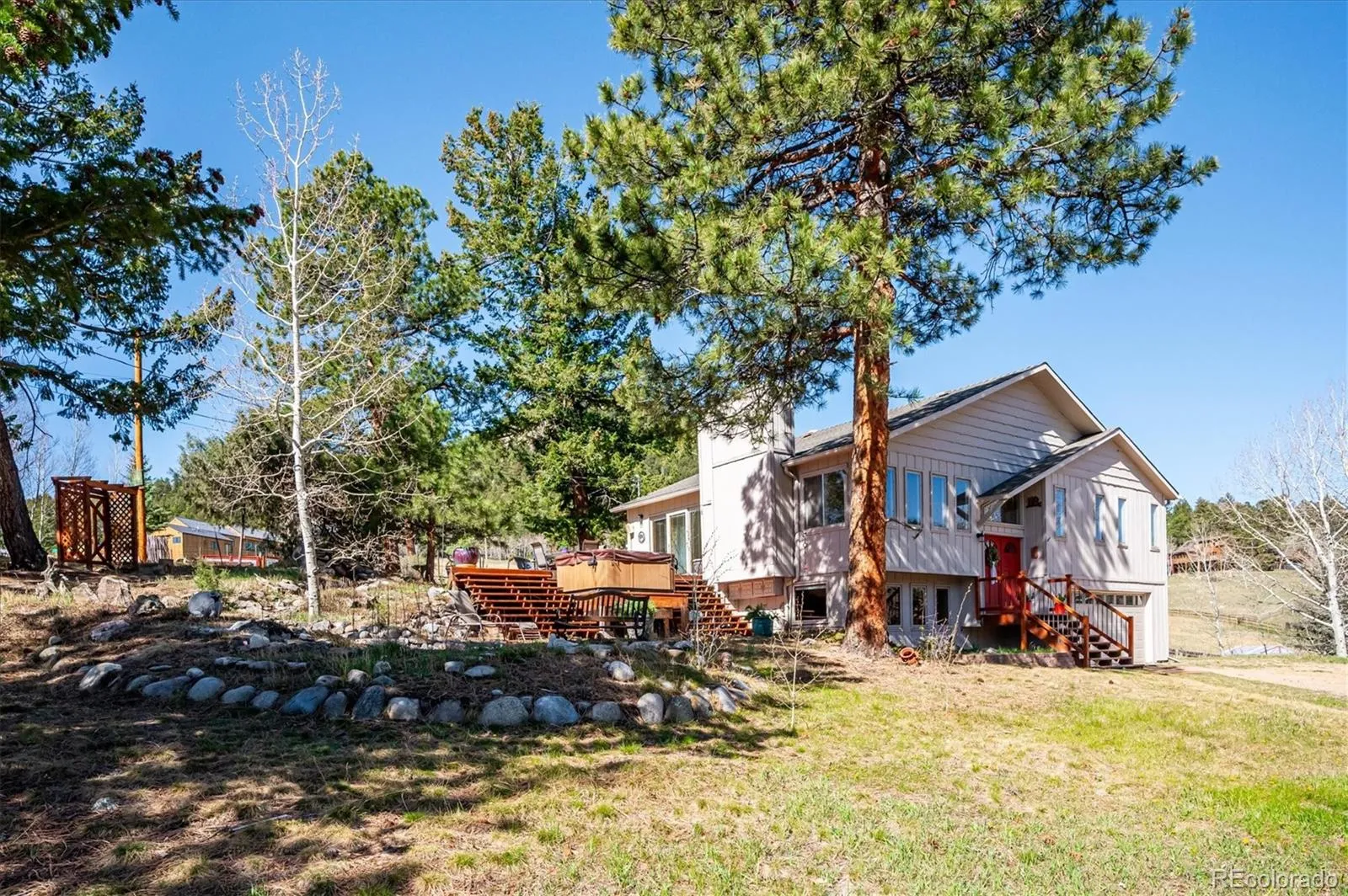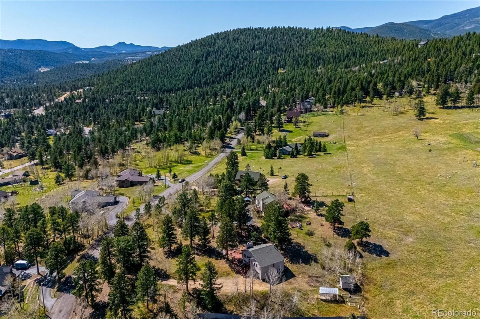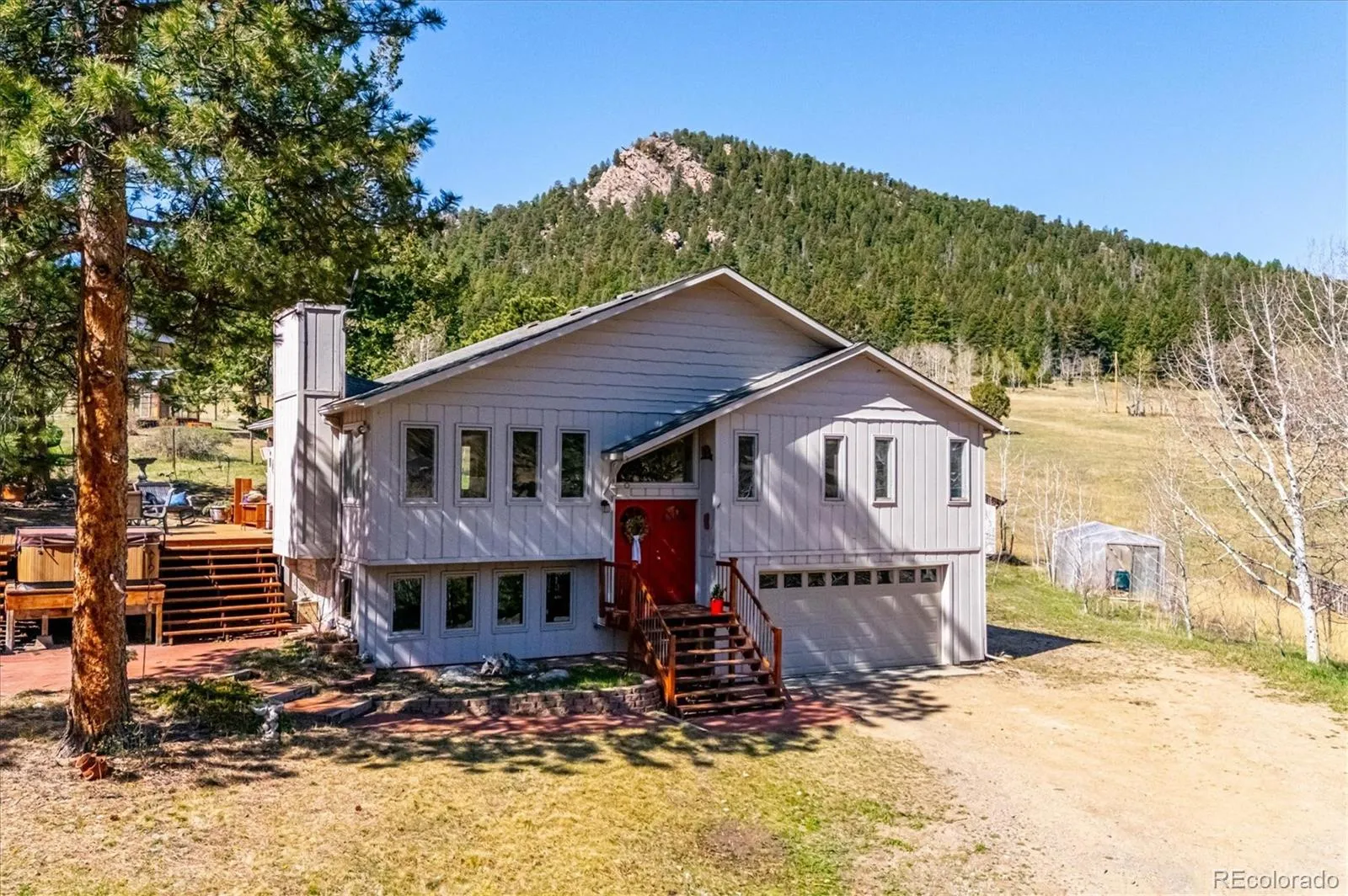 Tucked into an incredible location with sweeping, picturesque views, this charming mid-1970s home offers a rare opportunity to own a property with truly great bones on a beautiful 1.12-acre lot in the highly desirable Arapahoe Park Estates, just a short walk to the Arapahoe National Forest with 80 acres of gorgeous hiking and striking rock outcroppings, and only a quick drive to downtown Evergreen or Conifer. Inside, the upper level welcomes you with a light-filled living area anchored by a cozy fireplace, creating a warm and inviting space to gather. The thoughtfully updated kitchen features newer cabinetry, countertops, stainless steel appliances, a cheerful breakfast nook, and a spacious eating area, all with easy access to the expansive back deck—perfect for seamless indoor-outdoor living. The upper level is completed by a spacious primary suite with an adjacent 3/4 bath, along with two additional bedrooms that share a full bath. The lower level offers a giant, versatile family room with endless possibilities to create your own space, highlighted by a freestanding wood-burning stove (capable of heating the entire home) and brand new luxury carpet. This level also includes an additional 3/4 bath and a convenient mudroom/laundry area with utility sink and direct exterior access—an ideal setup for Colorado living. With spring in the air, the outdoor spaces are just beginning to come alive…hundreds of established perennials and wildflowers are on the verge of blooming, creating a vibrant and ever-changing landscape. The property is a true gardener’s dream, complete with a tranquil water feature, greenhouse, storage shed, fenced yard, and an expansive deck for relaxing and taking in the surrounding beauty. Convenient 2-Car Attached Garage. The property has been lovingly maintained, but has some features that hark back to the mid-70’s. This property will be sold “AS-IS” and offers an exceptional opportunity to personalize and build equity in a truly special setting.