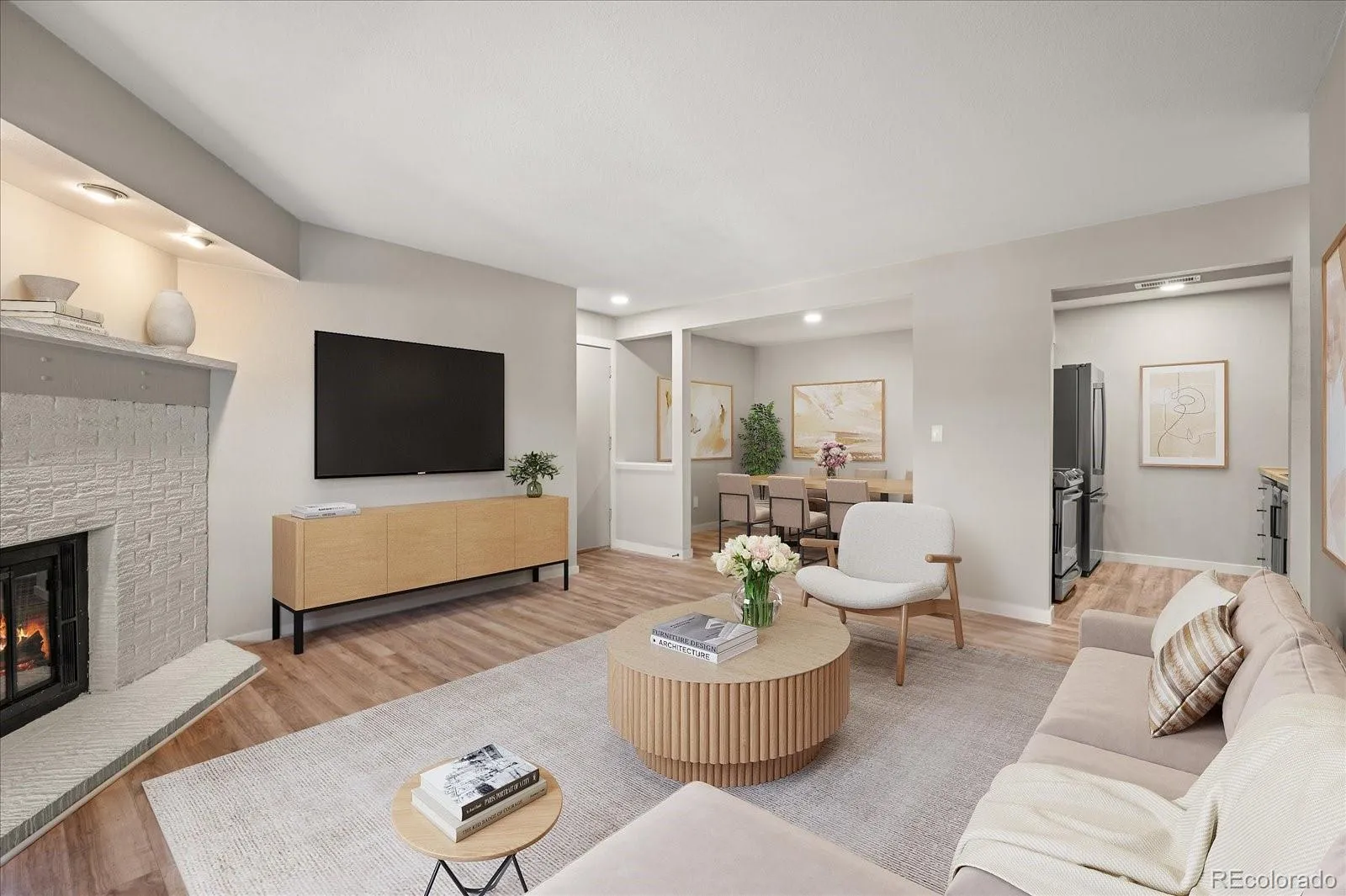 The interior has been refreshed with new vinyl plank flooring, fresh paint, updated bathroom vanities, new countertops, and a recently upgraded electrical panel. The main living space is anchored by a fireplace and opens naturally into the dining area, creating an easy flow for both everyday living and entertaining.