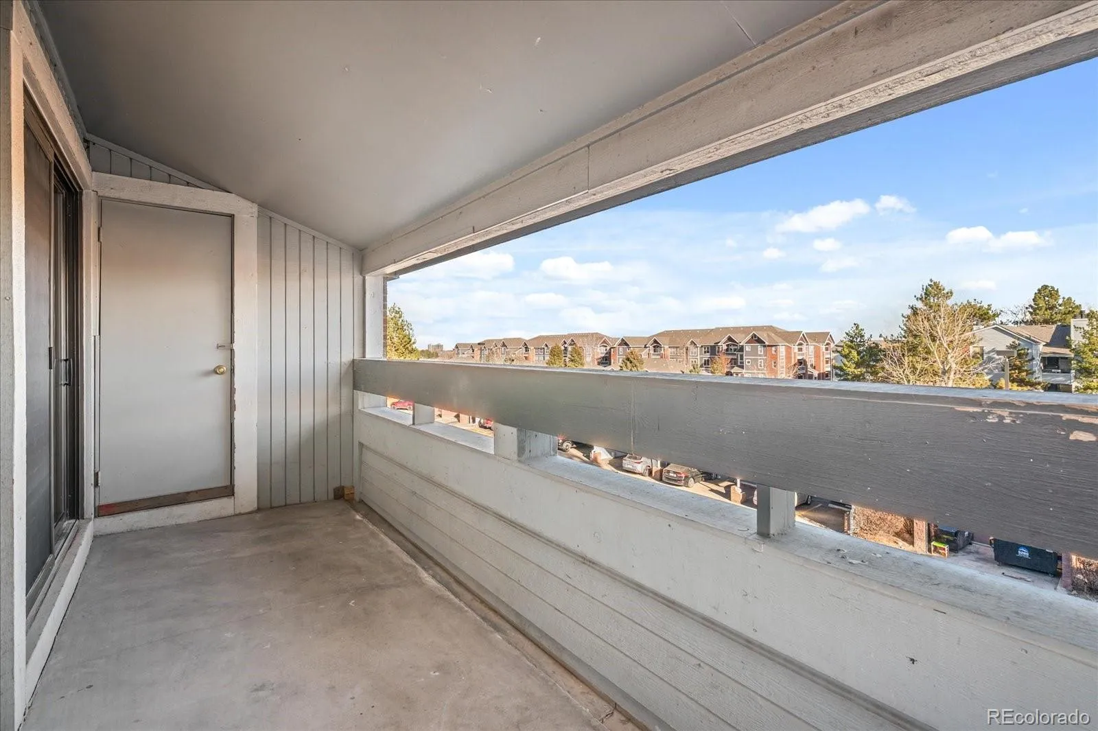 A covered balcony extends the living space outdoors and is accessible from both the living room and secondary bedroom. Additional exterior storage is also included.