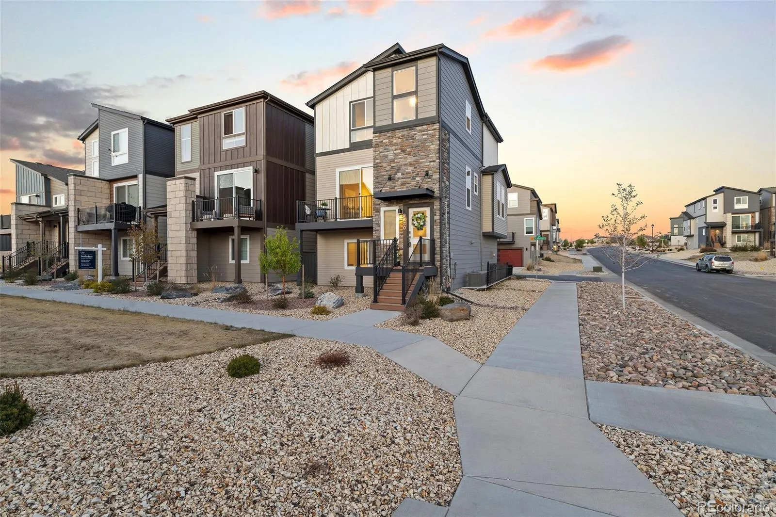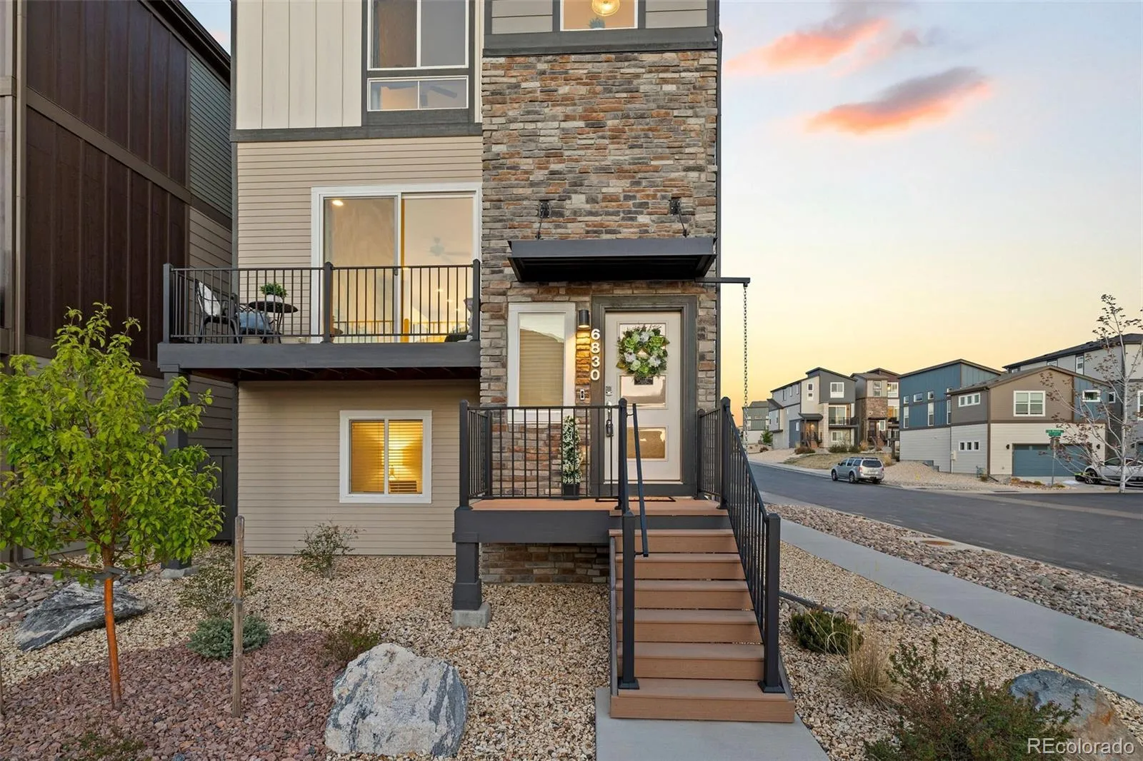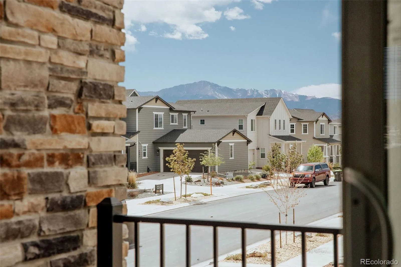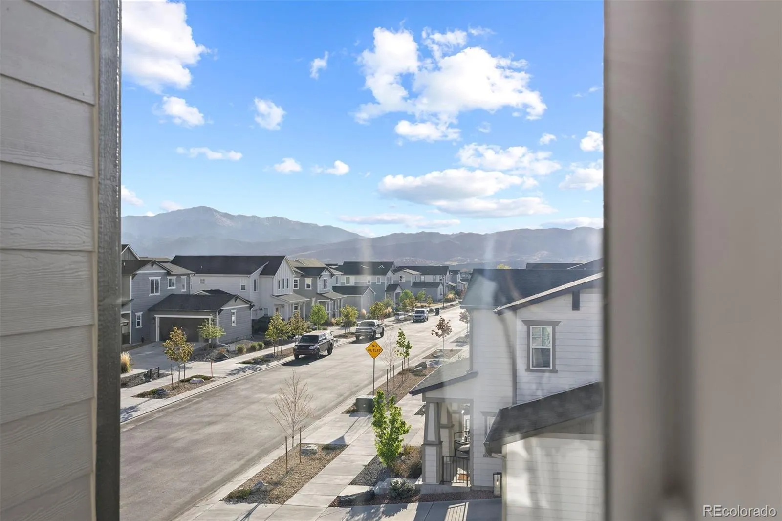 Simple, modern, and low-maintenance—this is the lifestyle you’ve been waiting for. Ideally positioned at the end of a contemporary row, this three-bedroom, three-bath home is filled with natural light, fresh air, and breathtaking views of Pikes Peak and the Front Range—you’ll truly see and feel the difference. Enjoy HOA-maintained landscaping so you can relax and enjoy the views and your lifestyle. Inside, engineered wood floors span the main level, complemented by tile at the owner’s entry and in the baths. A lower-level bedroom captures stunning west-facing views and abundant sunshine. The open main floor features a spacious living room with sliding doors to a private Pikes Peak-facing balcony—complete with composite decking and a gas line for grilling—perfect for soaking in Colorado’s outdoors. The kitchen offers a large center island with seating, granite countertops, stainless appliances, and a generously sized corner pantry. The dining area shines with two walls of south and east-facing windows, flooding the space with natural light—an upgrade over interior units. Upstairs, the primary suite has incredible Pikes Peak views, a spa-like bath with dual vanities, a walk-in shower, and a large closet. An additional bedroom with a double east-facing window and a walk-in closet and adjacent full bath with tub/shower completes the upper level – which also has amazing views from the loft. All the features you want, without the upkeep—plus a prime location near top restaurants, the area’s best shopping, and major corridors.