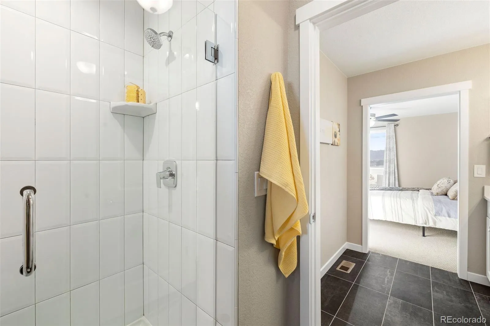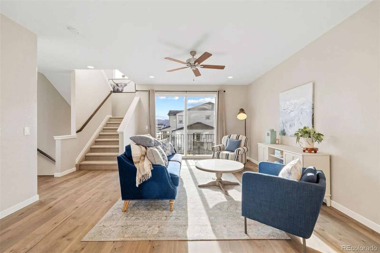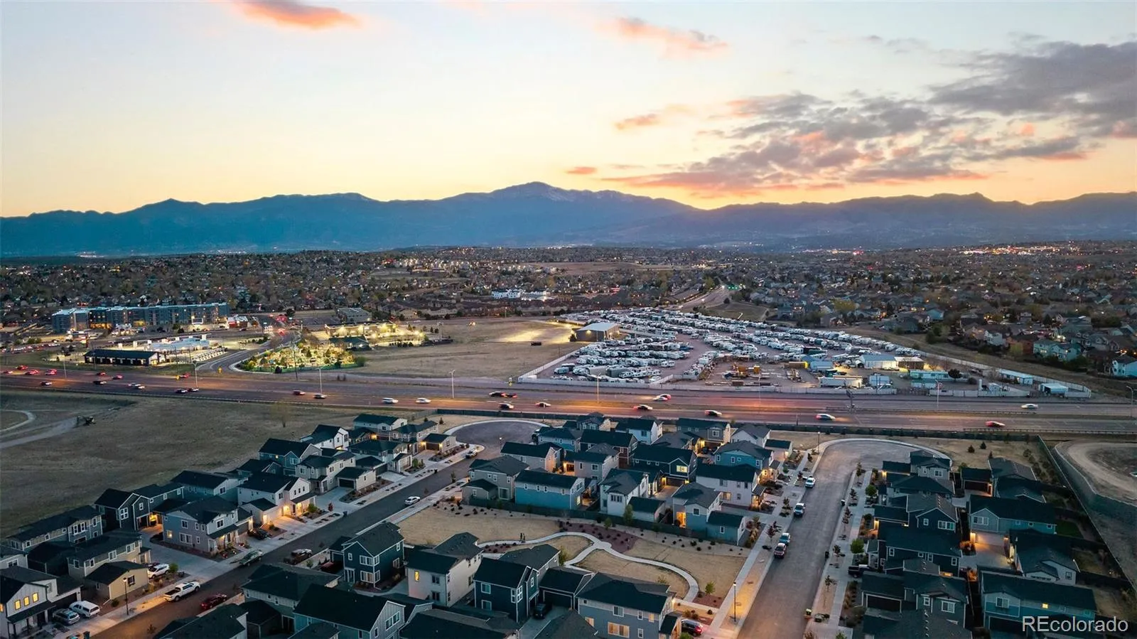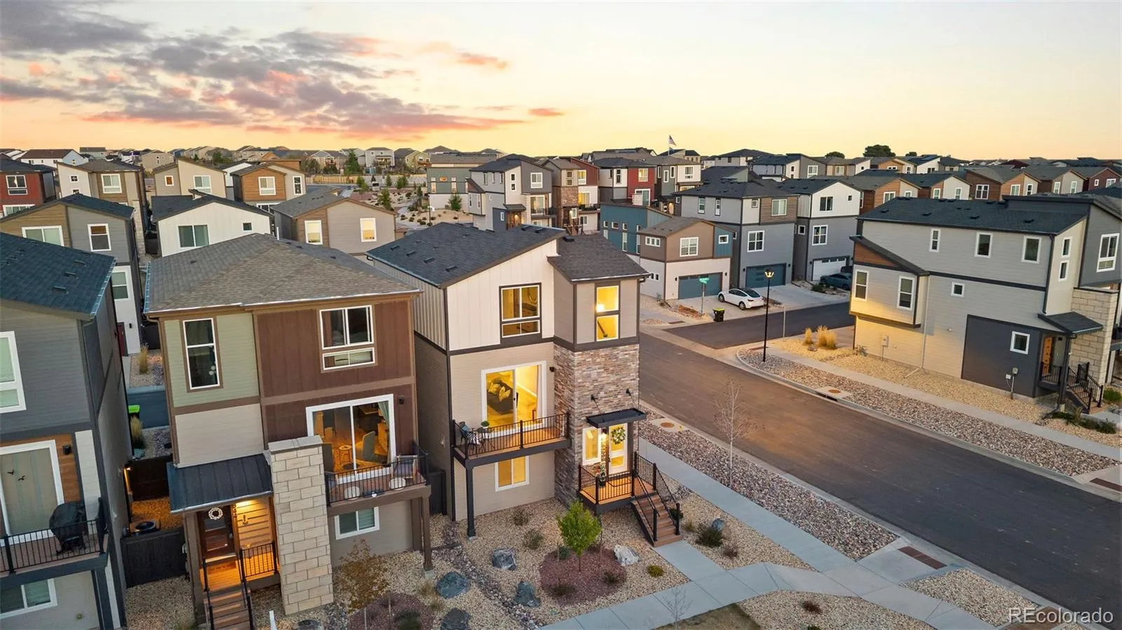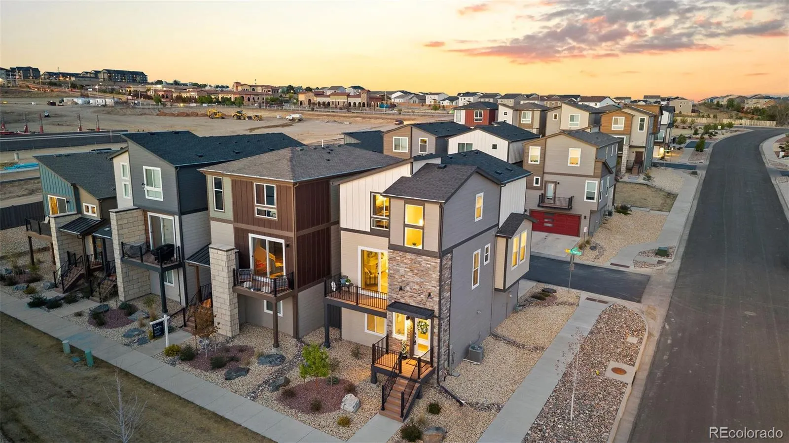 Simple, modern, and low-maintenance—this is the lifestyle you’ve been waiting for. Ideally positioned at the end of a contemporary row, this three-bedroom, three-bath home is filled with natural light, fresh air, and breathtaking views of Pikes Peak and the Front Range—you’ll truly see and feel the difference. Enjoy HOA-maintained landscaping so you can relax and enjoy the views and your lifestyle. Inside, engineered wood floors span the main level, complemented by tile at the owner’s entry and in the baths. A lower-level bedroom captures stunning west-facing views and abundant sunshine. The open main floor features a spacious living room with sliding doors to a private Pikes Peak-facing balcony—complete with composite decking and a gas line for grilling—perfect for soaking in Colorado’s outdoors. The kitchen offers a large center island with seating, granite countertops, stainless appliances, and a generously sized corner pantry. The dining area shines with two walls of south and east-facing windows, flooding the space with natural light—an upgrade over interior units. Upstairs, the primary suite has incredible Pikes Peak views, a spa-like bath with dual vanities, a walk-in shower, and a large closet. An additional bedroom with a double east-facing window and a walk-in closet and adjacent full bath with tub/shower completes the upper level – which also has amazing views from the loft. All the features you want, without the upkeep—plus a prime location near top restaurants, the area’s best shopping, and major corridors.