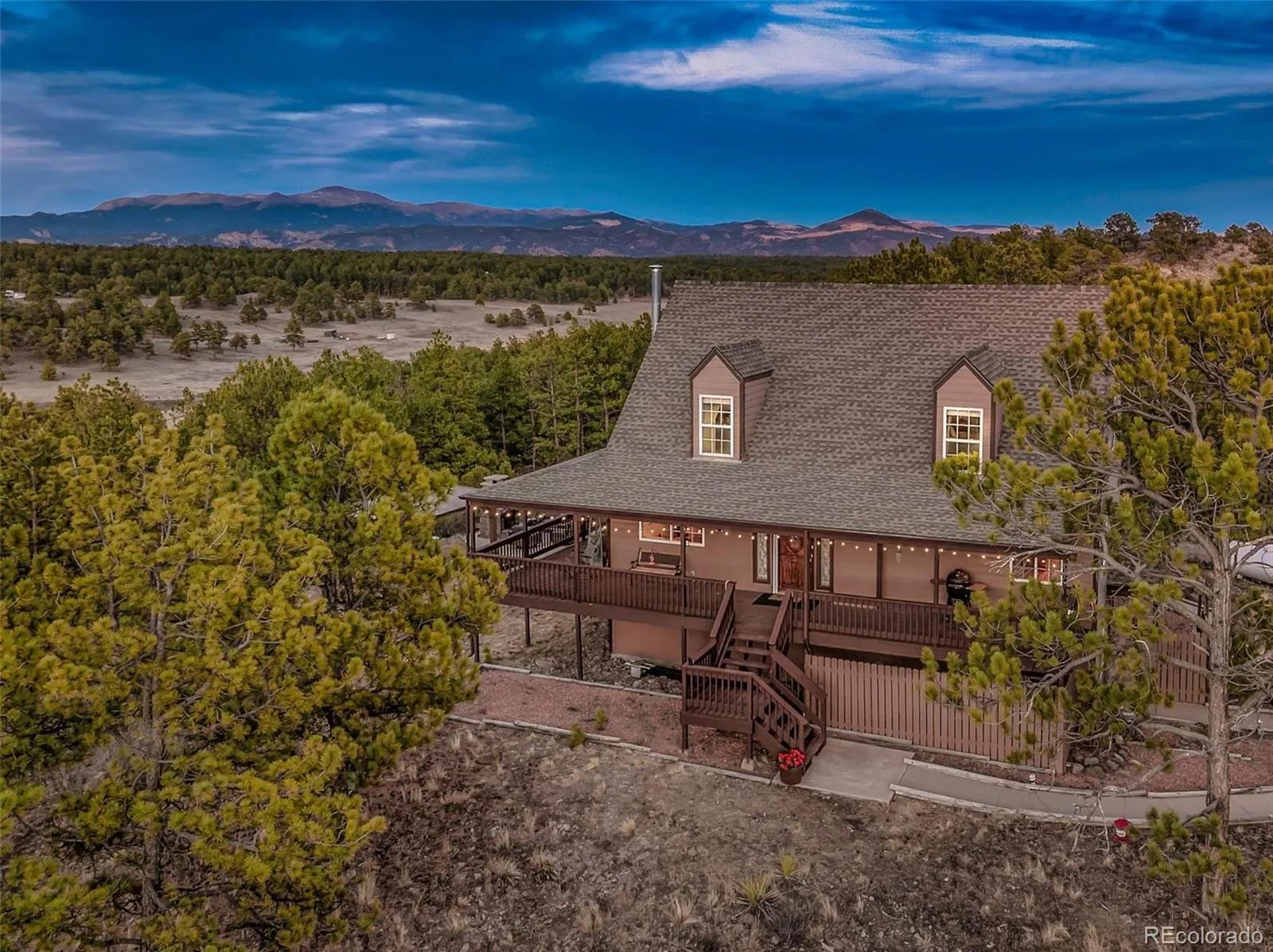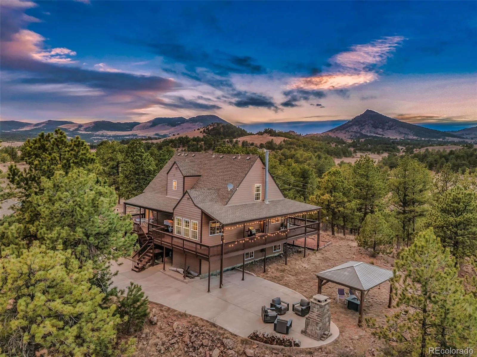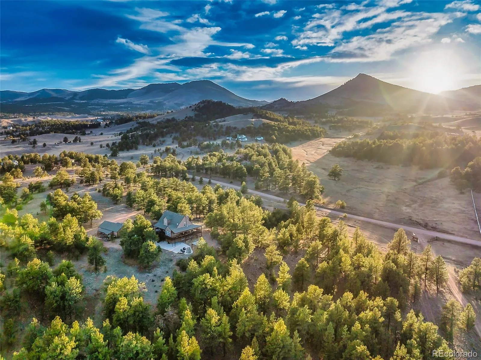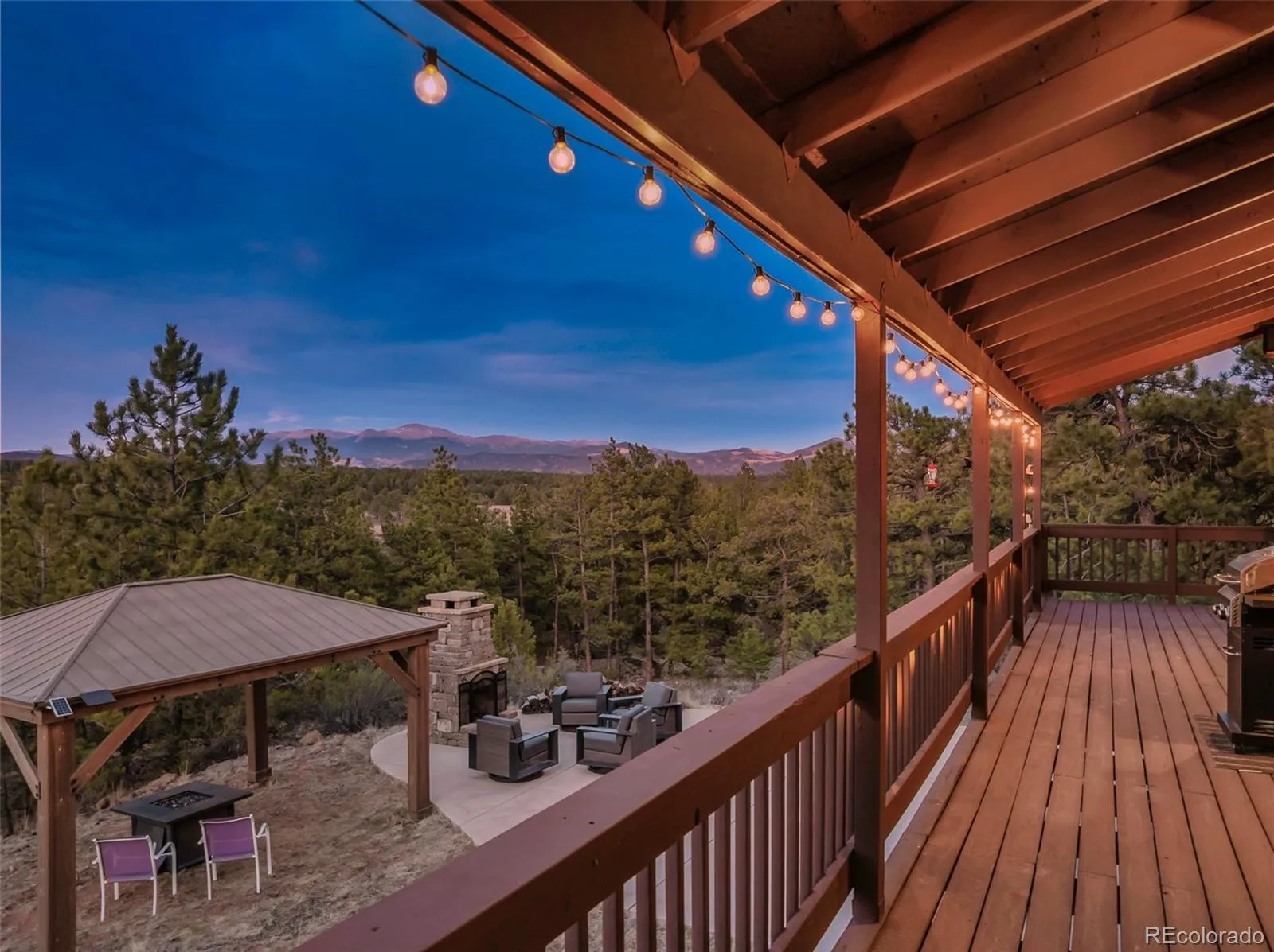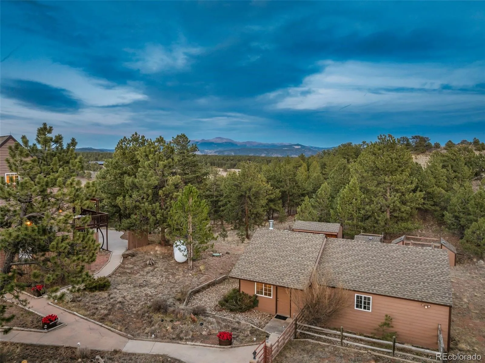 Tucked into a sun dappled forest of towering Ponderosa pines on 35 pristine acres this beautifully maintained and functionally perfect mountain retreat offers what may well be the finest views of Pikes Peak imaginable. Just a short distance off paved County road 102 and protected behind a private locked gate, the home blends luxurious comfort with profound seclusion….every window framing a living postcard of rugged peaks, sweeping valleys and endless blue skies. At the heart of this rambling residence lies a truly enchanting country kitchen — cozy yet modern, with a generous eat-in bar. This warm and functional space beautifully blends cooking, casual dining, and socializing into one inviting hub. Just steps away, the kitchen opens into a charming formal dining room, creating a perfect flow for both everyday family meals and larger gatherings. Together, the kitchen, dining room, and living room form the true social core of the home— an inviting hub ideal for everything from quick breakfasts at the bar to holiday dinners and relaxed evenings. The main level contemporary master suite feels like a high-end alpine retreat—sleek, minimalist and luxurious, with a strong emphasis on natural materials, dramatic views, and seamless indoor-outdoor living that perfectly complements the raw beauty of the Rocky Mountains. An expansive patio creates a generous, open-air living space that feels like an additional great room outdoors, with an 15′ X 8″ Gazebo, firepit and comfy patio seating, your evenings will be magical as direct sunlight fades and the iconic 14,115-foot summit catches the indirect rays scattering through the atmosphere, igniting in a stunning display of alpenglow. This beautiful home comes completely turnkey — fully furnished down to the glassware in the cabinets — so you can move in and start enjoying mountain living immediately.