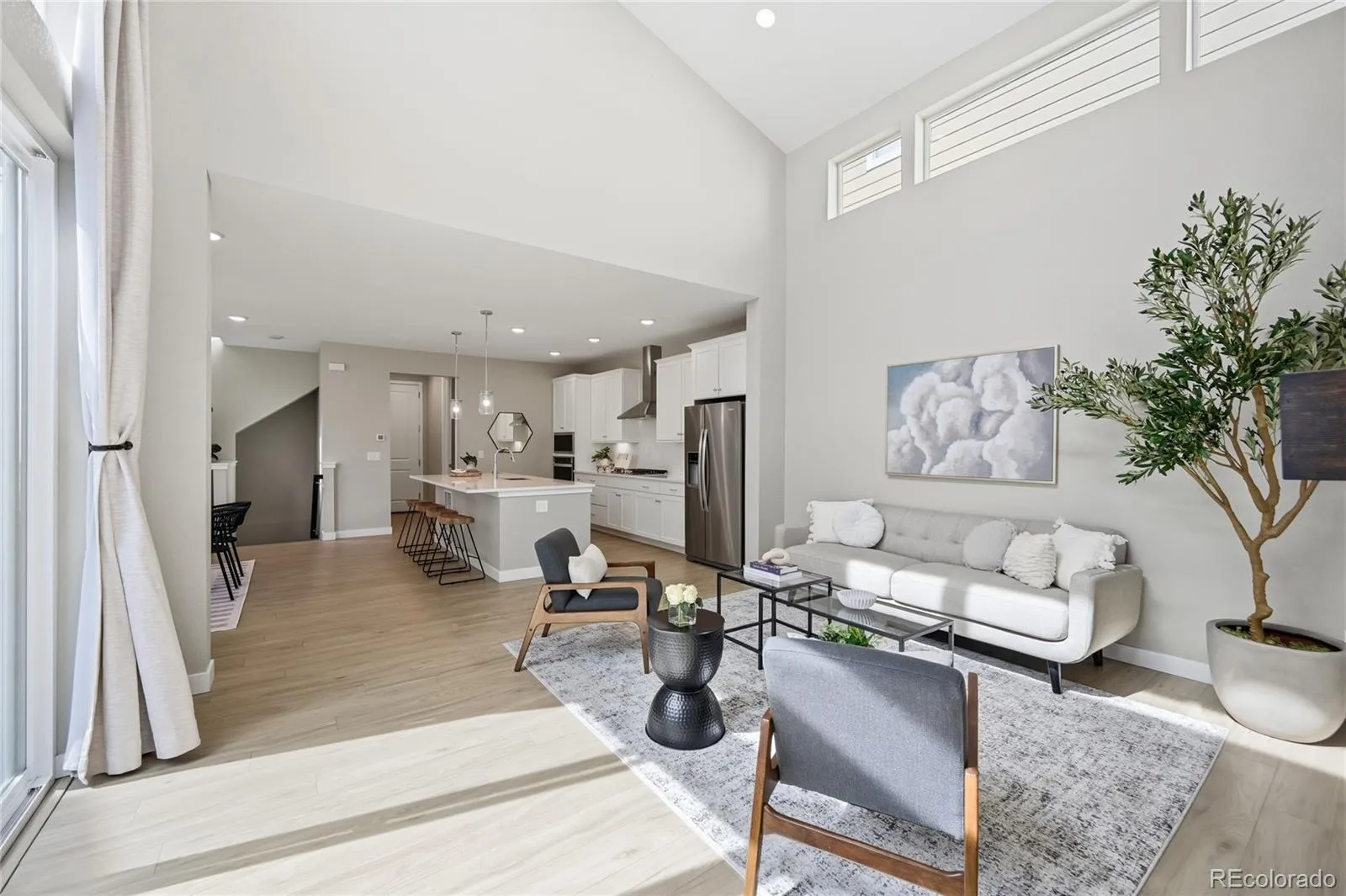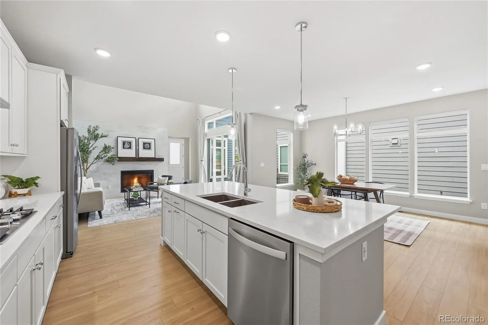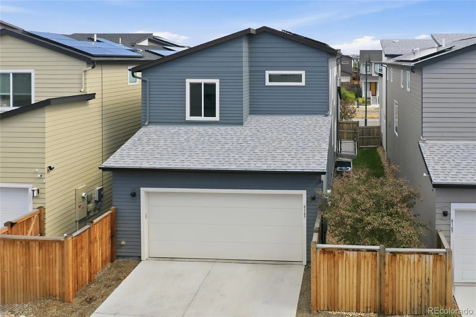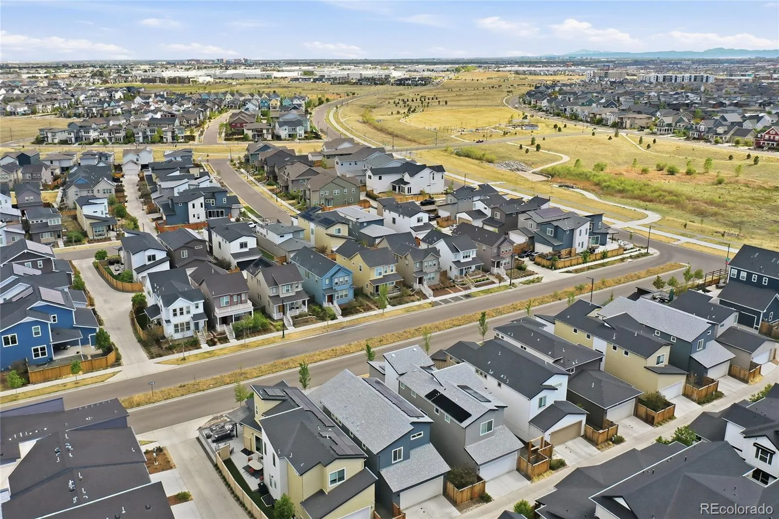 Welcome to a beautifully maintained home in the Central Park neighborhood, offering impressive curb appeal, mountain views, and a thoughtfully designed layout. From the moment you arrive, the inviting exterior sets the tone for what’s inside. Step through the front door to a welcoming entry, where a main-level office with frosted French doors sits just off the front, creating a functional and private workspace. From there, the layout opens into a seamless flow between the living area, dining space, and kitchen, designed for both everyday living and entertaining. The living room features a gas log fireplace with tile surround, along with built-in cord management ready for a mounted TV. The kitchen is equally inviting, offering a large island with seating, a gas cooktop with hood, stainless steel appliances, under-cabinet lighting, and generous cabinet space. Natural light fills the main level, which also includes a laundry room with cabinetry, a mudroom conveniently located just off the two-car garage entry, and a half bath. Upstairs, the primary suite provides a spacious retreat with a large walk-in closet and an ensuite bath featuring an oversized glass-enclosed shower. Two additional bedrooms share a full bathroom, creating a practical and comfortable layout. The finished basement expands the living space with a versatile area ideal for a media room, fitness space, office, or playroom. A bedroom and bathroom add flexibility, along with a storage room and utility area. An oversized sliding glass door connects the living space to the backyard, featuring a patio and grassy area designed for low-maintenance outdoor living. Additional upgrades include a video doorbell and owned solar panels, offering added security, energy efficiency, and long-term savings. Located in Central Park, this home offers access to parks, trails, pools, and highly rated schools, along with convenient proximity to Anschutz Medical Campus, DIA, and downtown Denver.