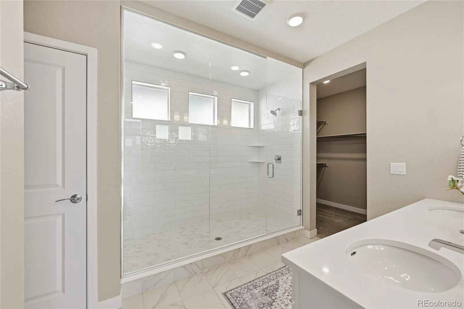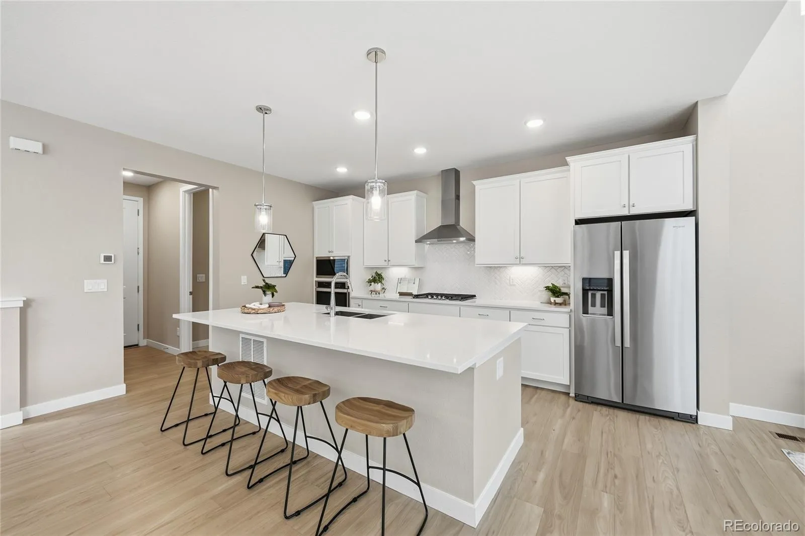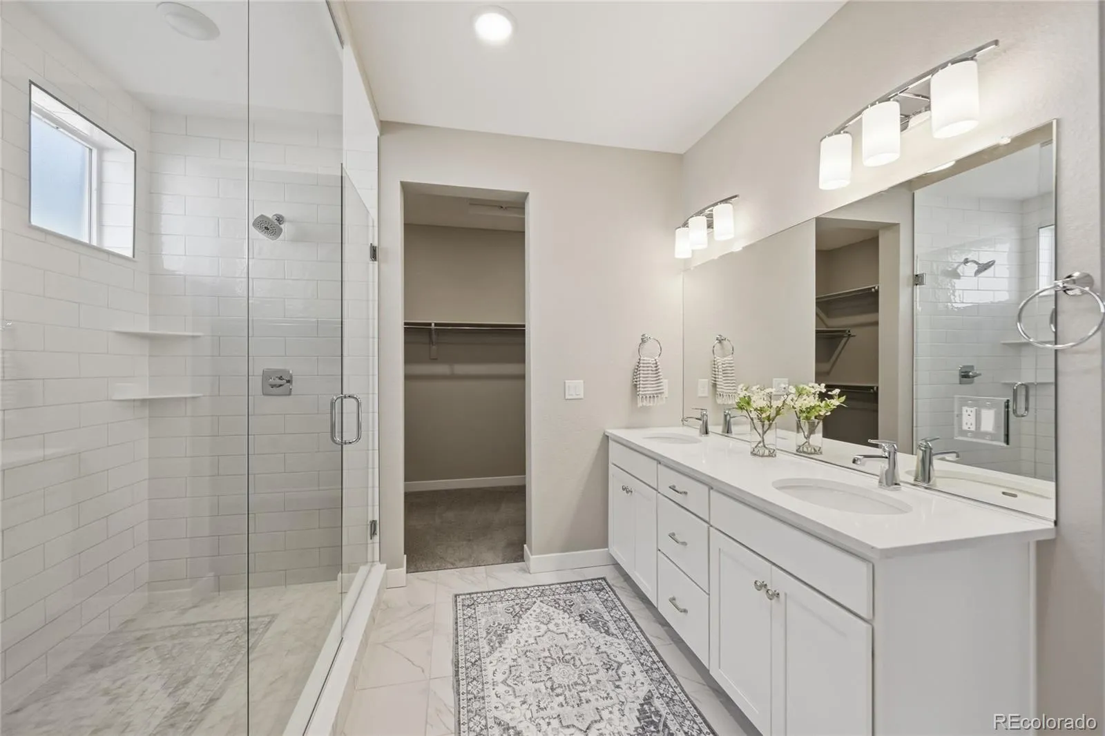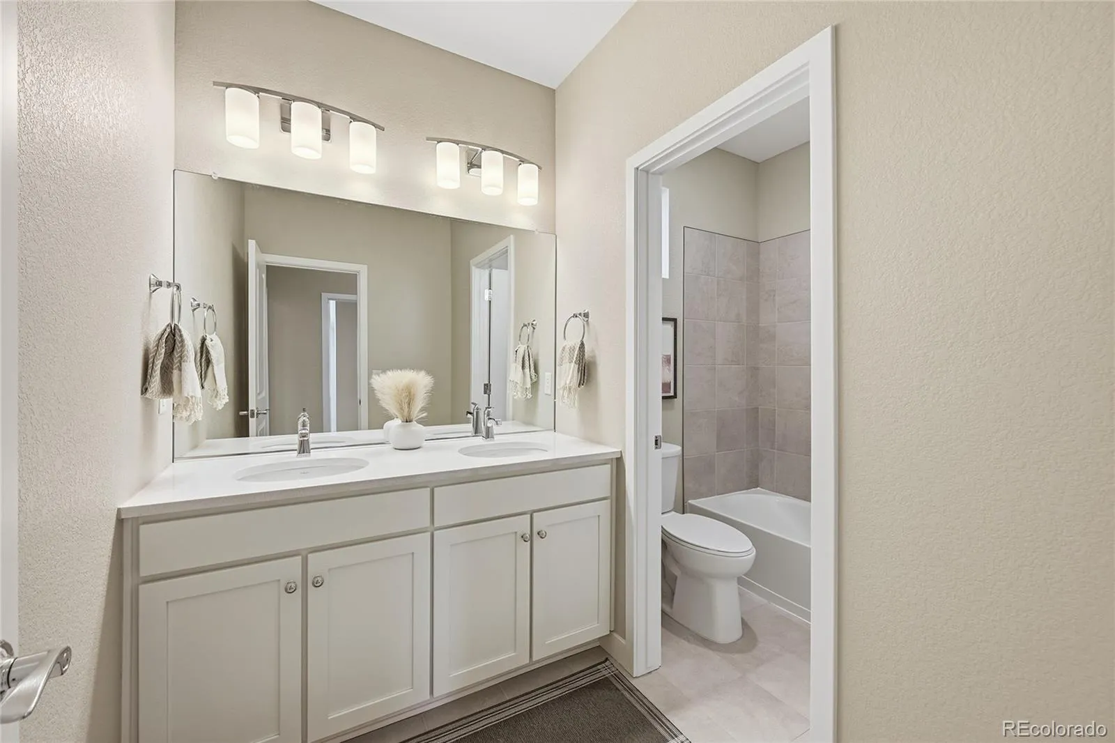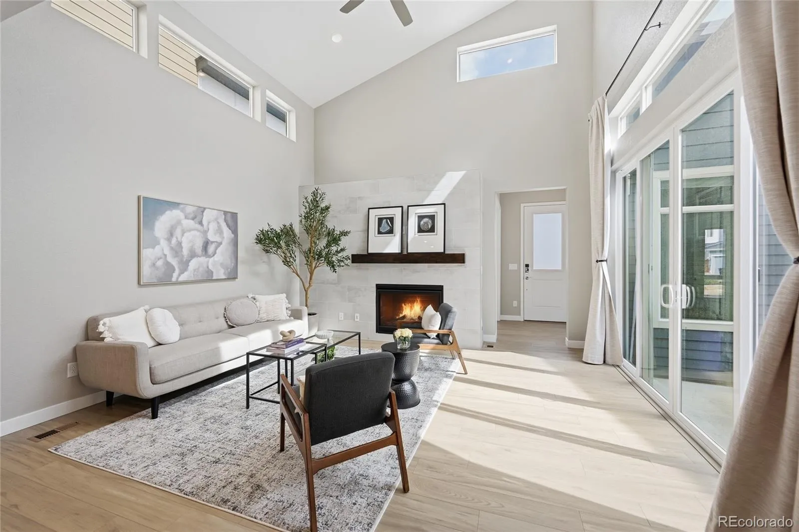 Welcome to a beautifully maintained home in the Central Park neighborhood, offering impressive curb appeal, mountain views, and a thoughtfully designed layout. From the moment you arrive, the inviting exterior sets the tone for what’s inside. Step through the front door to a welcoming entry, where a main-level office with frosted French doors sits just off the front, creating a functional and private workspace. From there, the layout opens into a seamless flow between the living area, dining space, and kitchen, designed for both everyday living and entertaining. The living room features a gas log fireplace with tile surround, along with built-in cord management ready for a mounted TV. The kitchen is equally inviting, offering a large island with seating, a gas cooktop with hood, stainless steel appliances, under-cabinet lighting, and generous cabinet space. Natural light fills the main level, which also includes a laundry room with cabinetry, a mudroom conveniently located just off the two-car garage entry, and a half bath. Upstairs, the primary suite provides a spacious retreat with a large walk-in closet and an ensuite bath featuring an oversized glass-enclosed shower. Two additional bedrooms share a full bathroom, creating a practical and comfortable layout. The finished basement expands the living space with a versatile area ideal for a media room, fitness space, office, or playroom. A bedroom and bathroom add flexibility, along with a storage room and utility area. An oversized sliding glass door connects the living space to the backyard, featuring a patio and grassy area designed for low-maintenance outdoor living. Additional upgrades include a video doorbell and owned solar panels, offering added security, energy efficiency, and long-term savings. Located in Central Park, this home offers access to parks, trails, pools, and highly rated schools, along with convenient proximity to Anschutz Medical Campus, DIA, and downtown Denver.