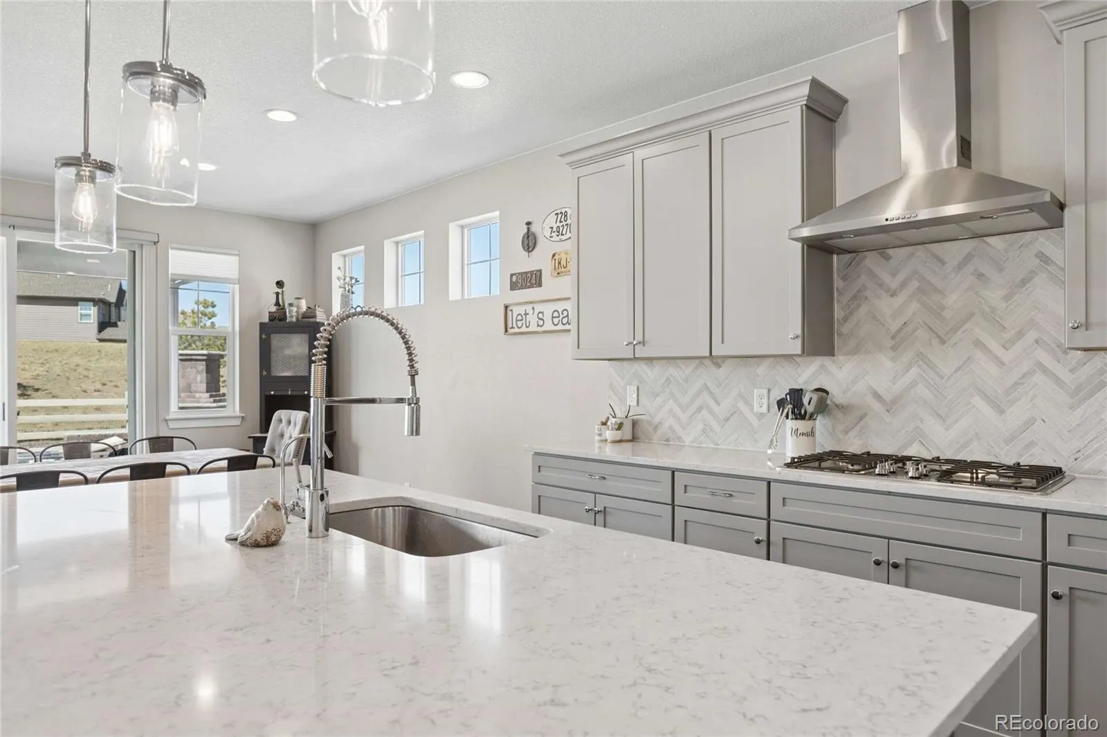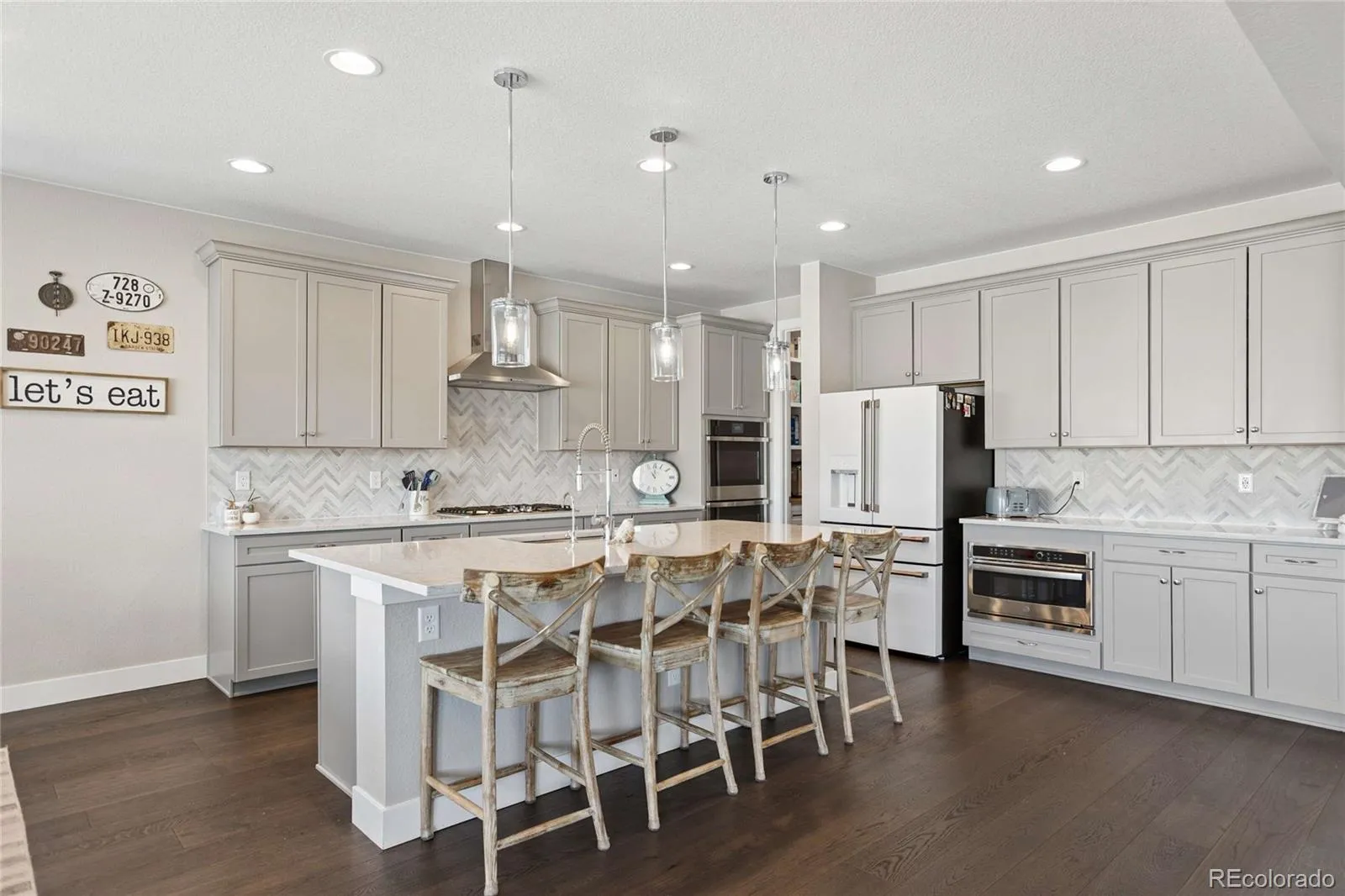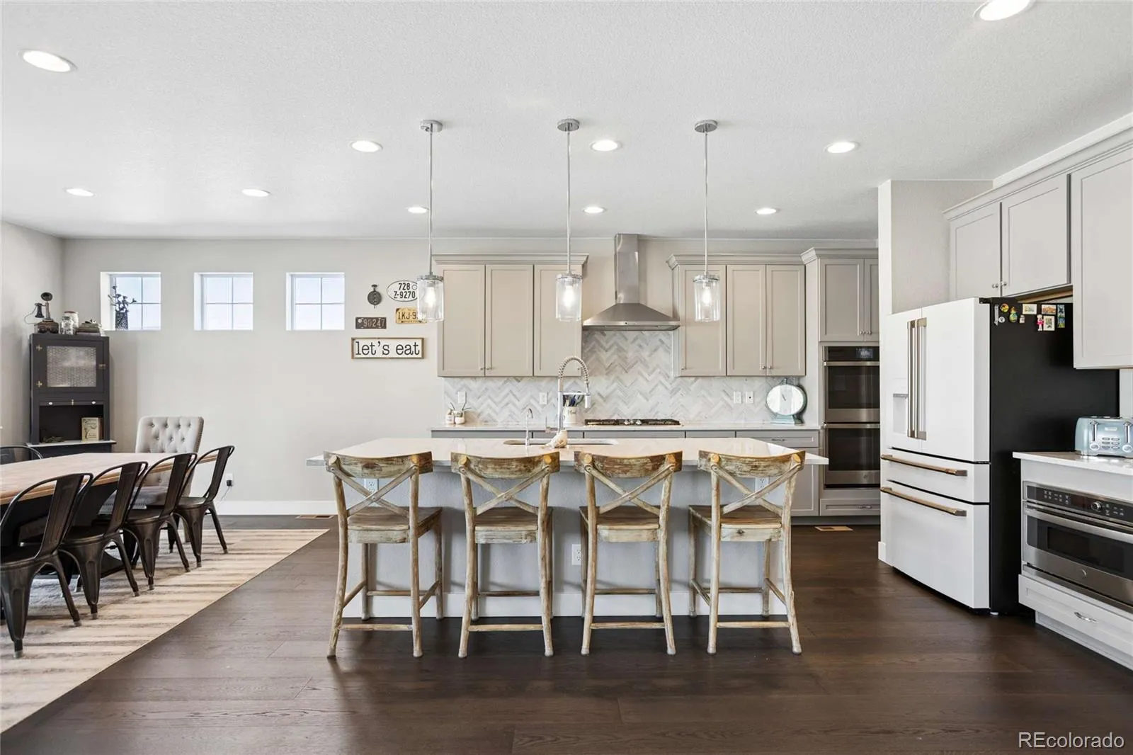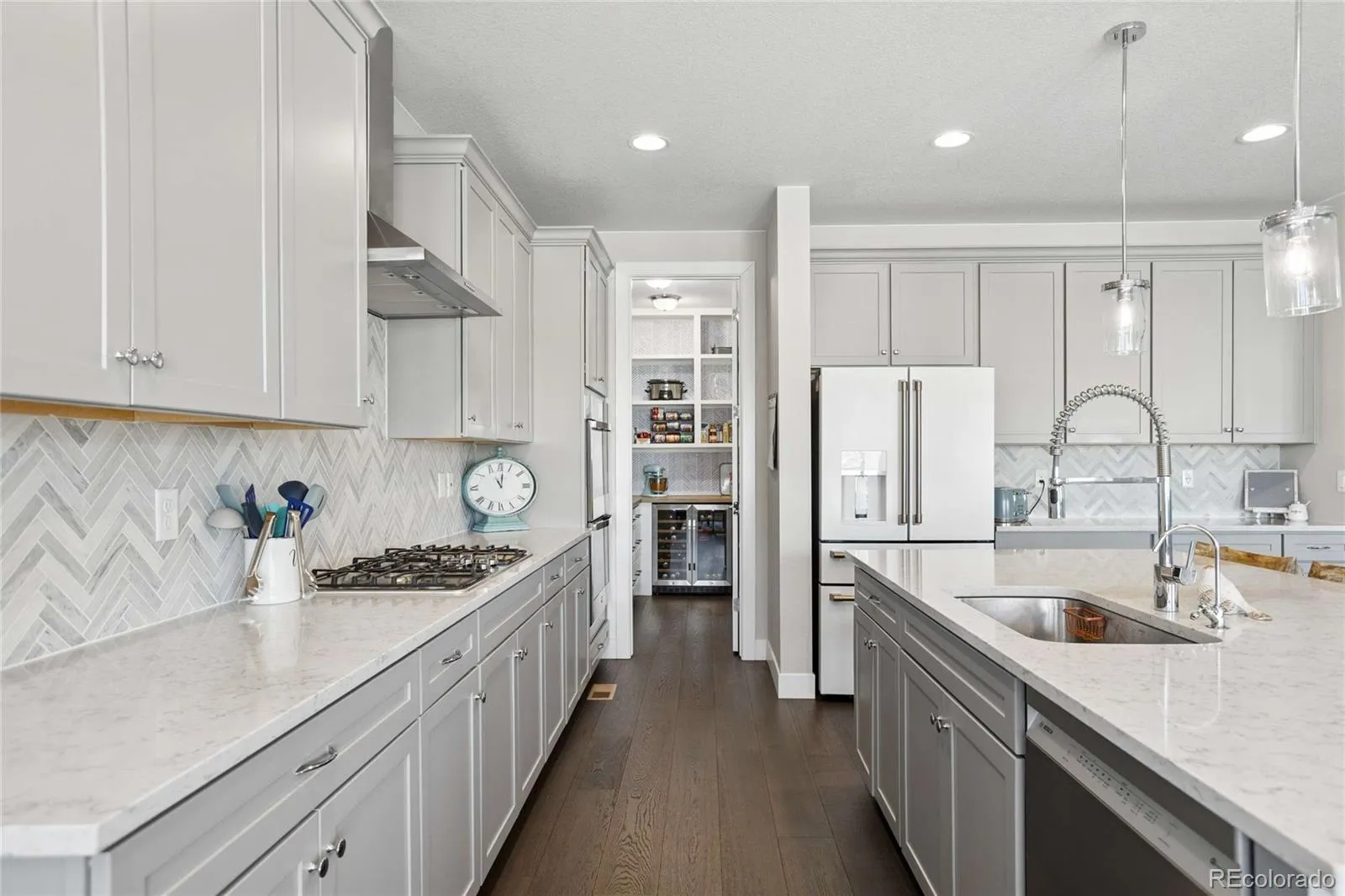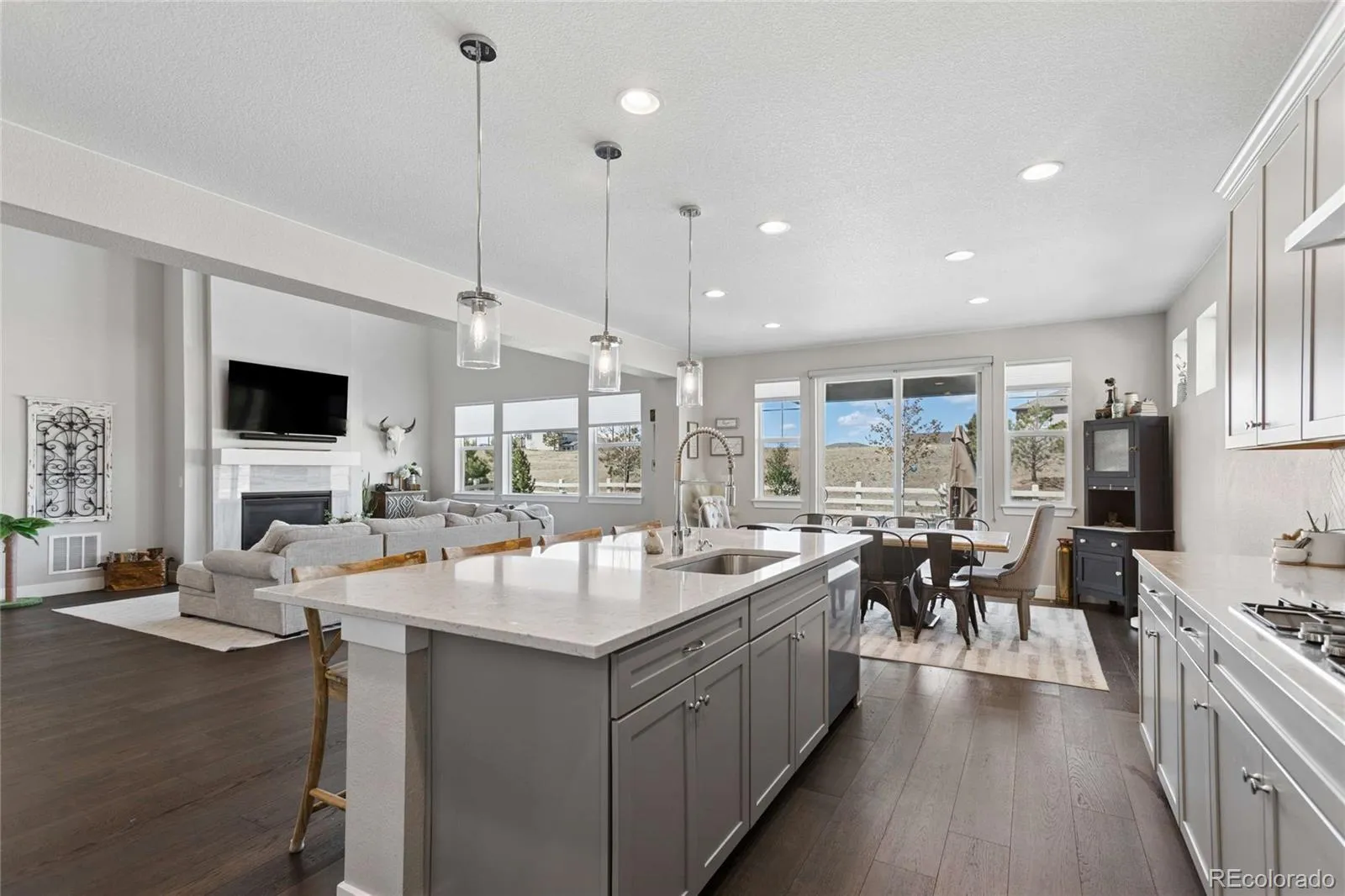 At the heart of the home, the chef-inspired kitchen delivers both function and elegance. It features an oversized island, premium appliances, and a natural tile backsplash that adds warmth and texture. The adjoining eat-in area captures scenic views, while the walk-in pantry is enhanced with custom cabinetry and a built-in mini fridge for added convenience.