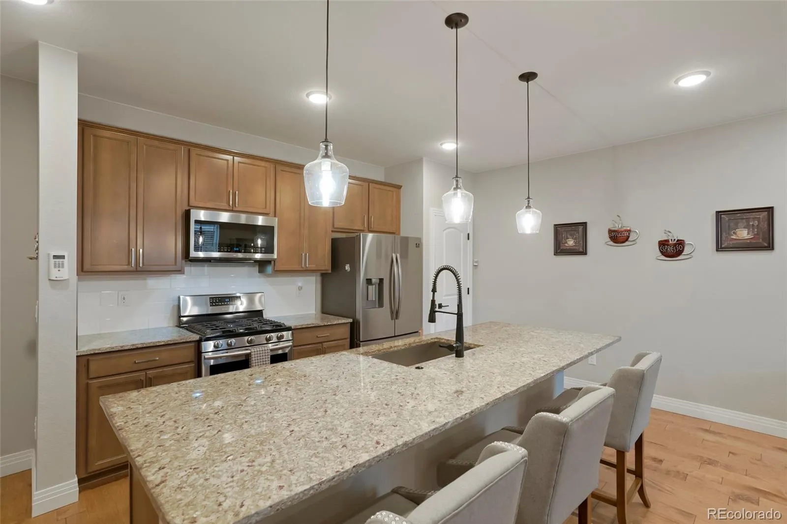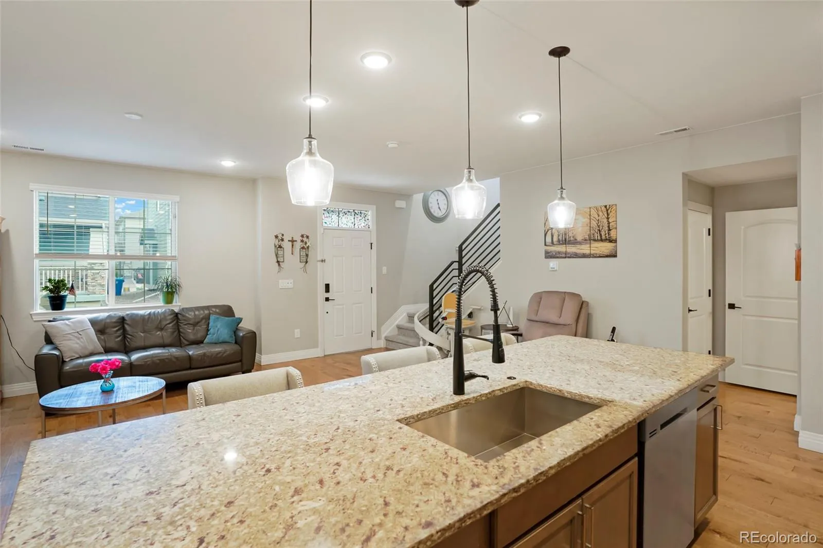 Welcome to your like new (2020) townhome in The Villages at Buffalo Run! This modern, two-story beauty offers 3 spacious bedrooms and 3 bathrooms across 1,654 square feet of well-designed living space. As you step inside, you’ll be greeted by engineered hardwood floors on the main level, leading to a stunning kitchen that’s perfect for hosting. Enjoy granite countertops, a large kitchen island, and sleek stainless steel appliances that make cooking a joy. The custom black metal railing adds a stylish touch as you make your way upstairs. Convenience is key with a custom chairlift installed in 2020 and 9-foot ceilings on the first level, creating an open and airy atmosphere. The upper level features 3 spacious bedrooms, 2 bathrooms, and a laundry room with ample storage washer and dryer are included. Extra perks include a tankless hot water heater, keypad entry, and a Honeywell thermostat for your comfort. The home also comes with a Simplisafe system for added security. The oversized two-car garage provides plenty of room for a workbench and tools, making it an ideal spot for any project. Situated on a 1,307 square foot lot, this townhome is close to various shopping and dining options. Plus, you’ll have easy access to highways and be just 20 minutes from DIA. Don’t miss out on this fantastic opportunity to own a contemporary and convenient home in Commerce City!