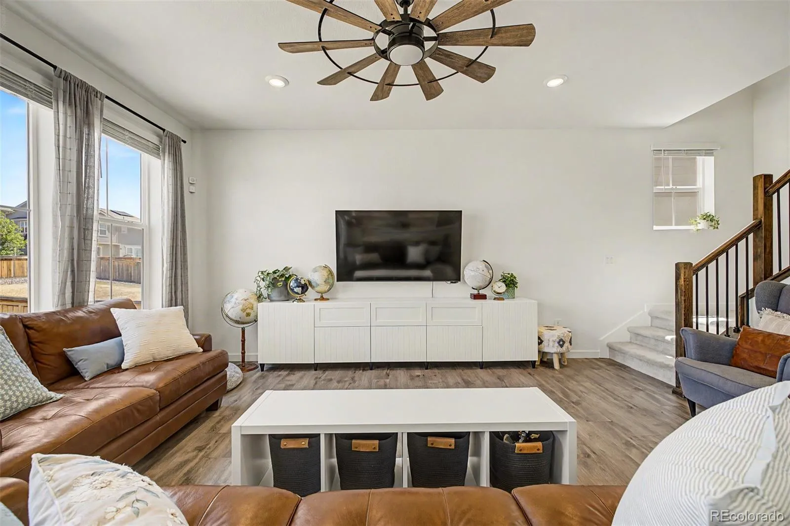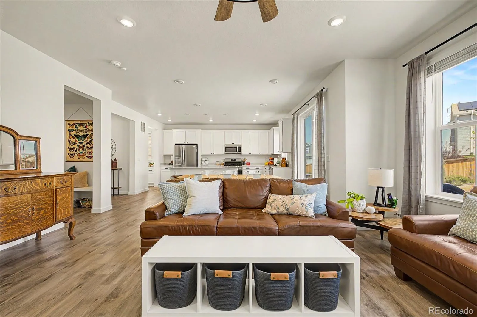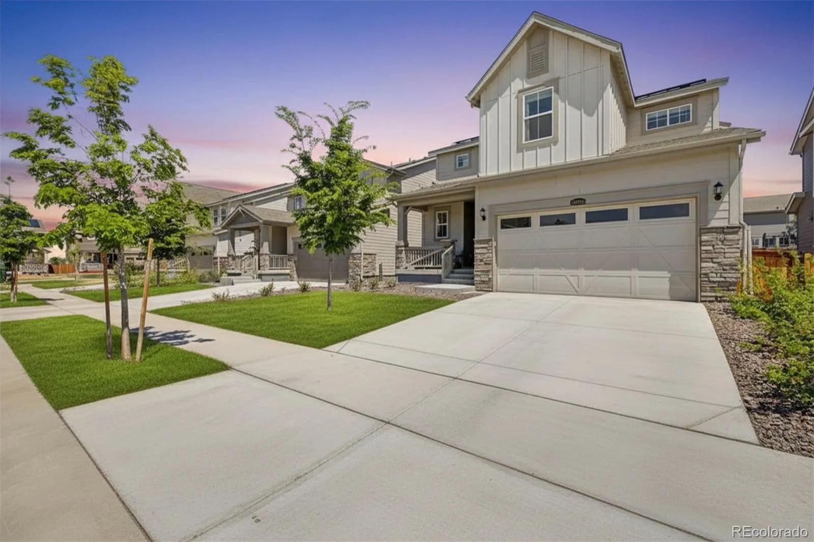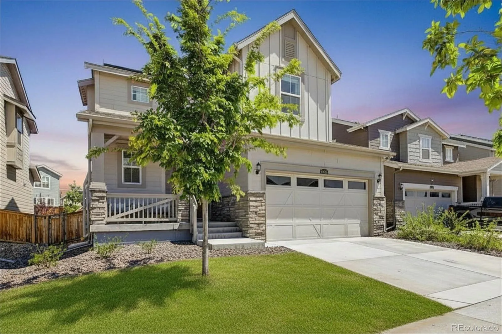 Stunning 2022-built two-story in sought-after Reunion Ridge, loaded w/ designer upgrades, smart-home tech & a beautifully landscaped yard built for entertaining. Step inside to durable LVP flooring across an open-concept main level where a chef-inspired kitchen flows into the dining & living room w/ stylish ceiling fan. Kitchen showcases a Frigidaire fridge, 5-burner gas stove, dishwasher, deep undermount sink, gooseneck faucet & large center island. A media room off the kitchen doubles as a home office, while a walk-in pantry, half bath off the entry, mudroom & coat closet w/ bench provide direct access to the garage & basement. Upstairs, plush carpet leads to a spacious loft & three bedrooms — all w/ ceiling fans — including a secondary bedroom w/ sweeping views of downtown Denver, the community park & Front Range mountains, perfect for catching 4th of July & NYE fireworks. The oversized primary suite offers an en suite 3/4 bath w/ window, double vanity, tile floors & walk-in closet. A full hall bath w/ double sinks, linen closet & laundry room w/ GE washer/dryer round out the upper level. The large, unfinished daylight basement w/ sump pump offers endless potential. Outside, the yard features Vego raised garden beds & planters (all included!), Skyrocket Juniper, Dwarf Korean Lilac, Popcorn Roses, Stella de Oro Day Lily, Lamb’s Ear, Blonde Ambition Grass, Lavender, Blue Salvia, Moonbeam Coreopsis, Winecup, Ice Plant, Dwarf Butterfly Bush, honey locust & Siberian maple trees. 2-car garage w/ EV charger hookup, 220V & sprinkler box. Leased Sunstrong solar feeds back to the main panel for lower bills — no battery needed. Includes Simplisafe alarm, smart locks, video doorbell & water leak sensor. Reunion amenities include a pool, clubhouse, fitness center, seasonal pond & three community parks w/ a playground visible from the front porch. Just a 20-min drive or bus ride to DIA, w/ quick access to E-470, I-76 & the Rocky Mountain Arsenal Wildlife Refuge.