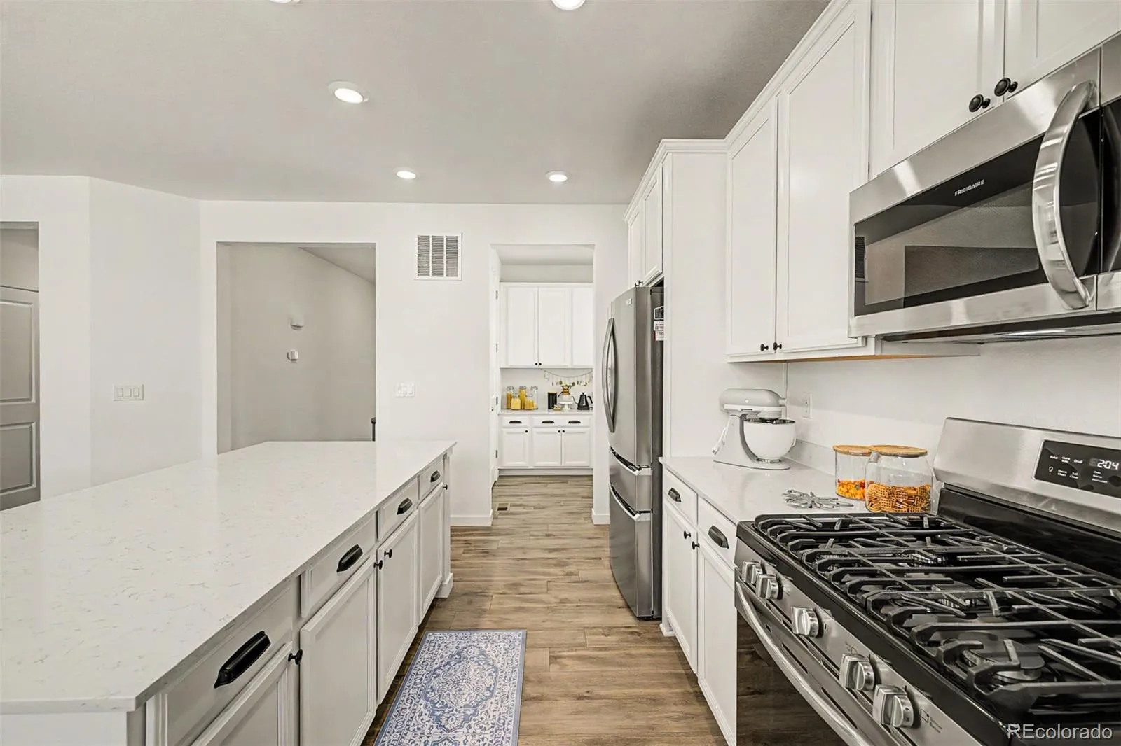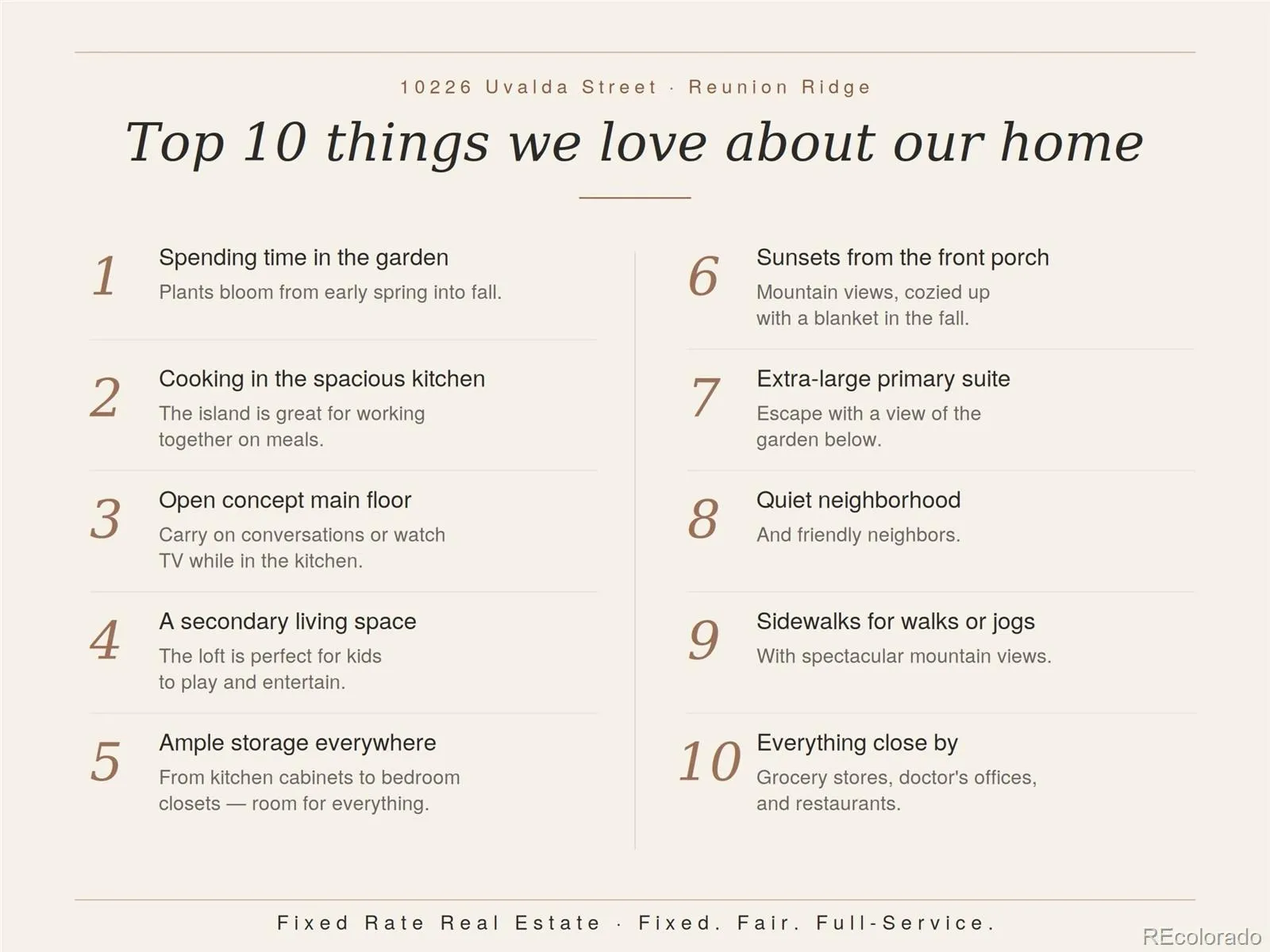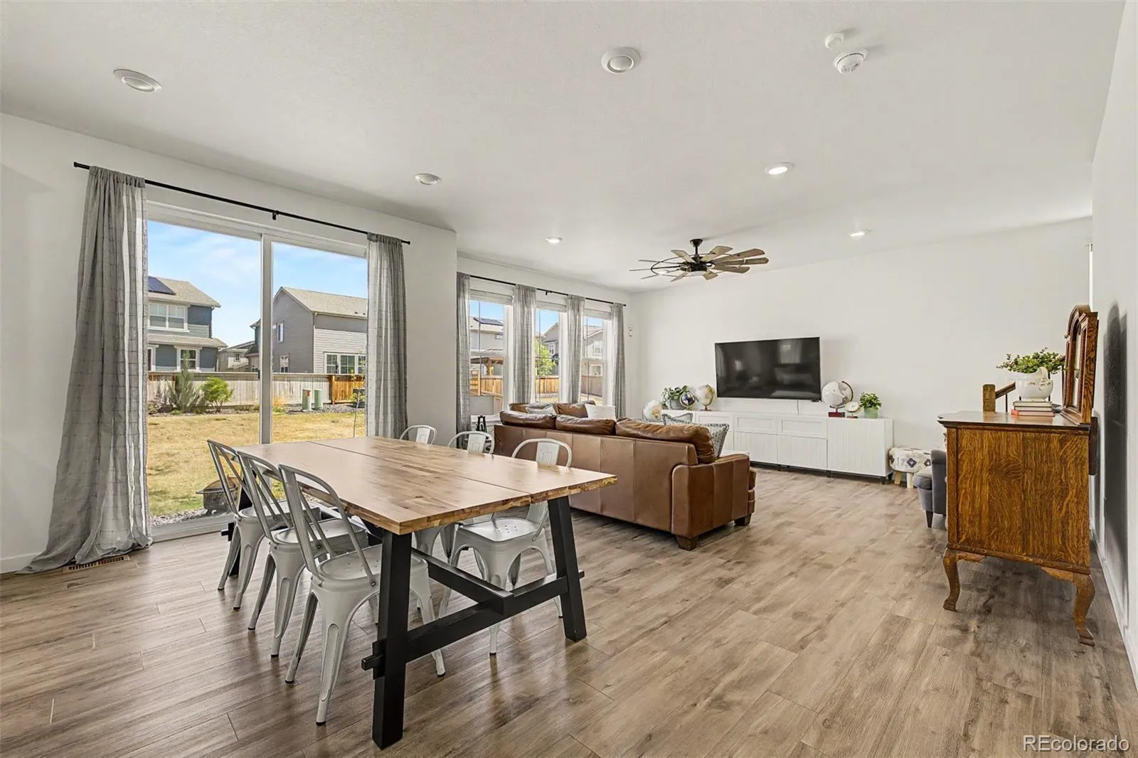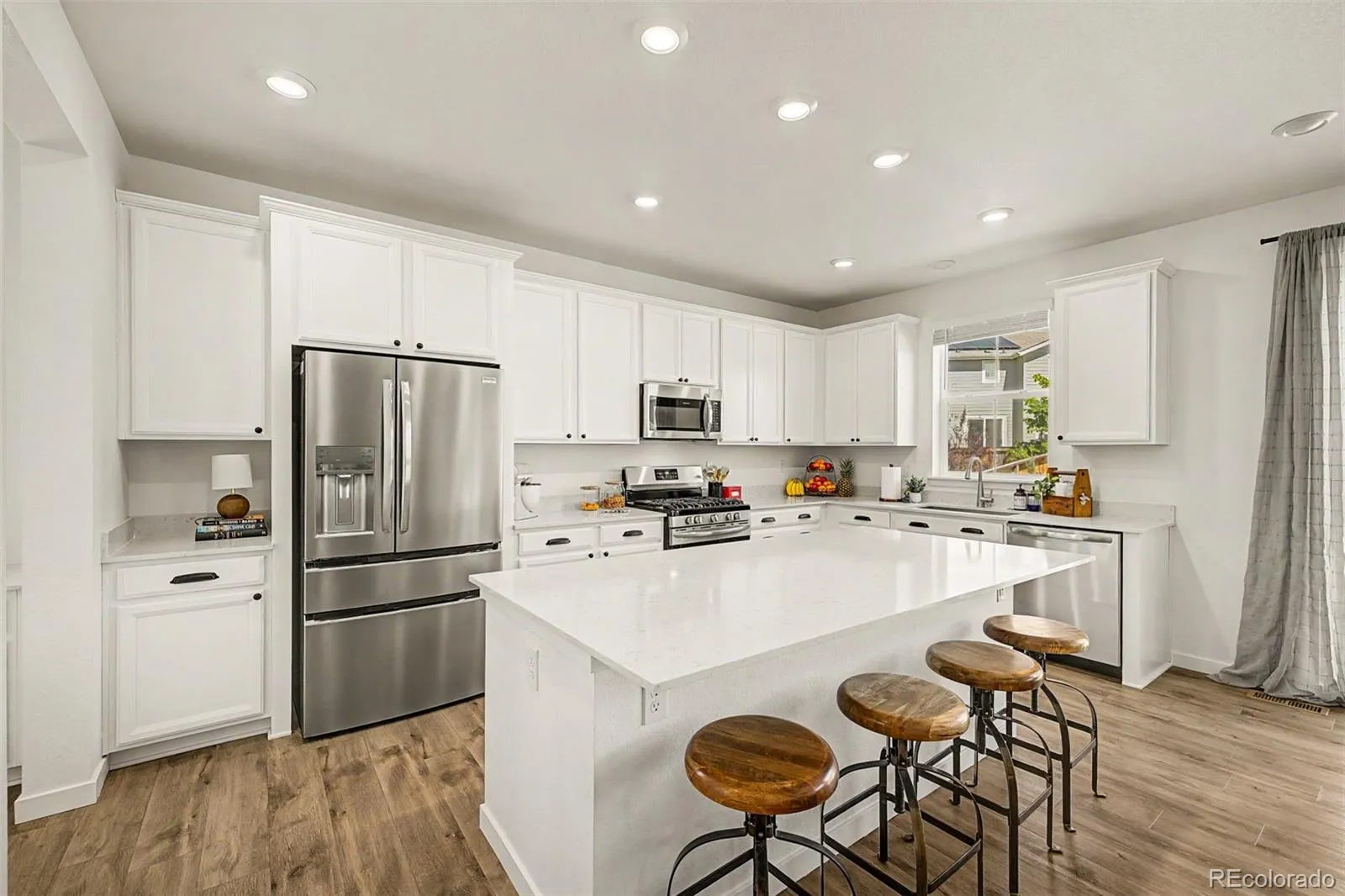 Stunning 2022-built two-story in sought-after Reunion Ridge, loaded w/ designer upgrades, smart-home tech & a beautifully landscaped yard built for entertaining. Step inside to durable LVP flooring across an open-concept main level where a chef-inspired kitchen flows into the dining & living room w/ stylish ceiling fan. Kitchen showcases a Frigidaire fridge, 5-burner gas stove, dishwasher, deep undermount sink, gooseneck faucet & large center island. A media room off the kitchen doubles as a home office, while a walk-in pantry, half bath off the entry, mudroom & coat closet w/ bench provide direct access to the garage & basement. Upstairs, plush carpet leads to a spacious loft & three bedrooms — all w/ ceiling fans — including a secondary bedroom w/ sweeping views of downtown Denver, the community park & Front Range mountains, perfect for catching 4th of July & NYE fireworks. The oversized primary suite offers an en suite 3/4 bath w/ window, double vanity, tile floors & walk-in closet. A full hall bath w/ double sinks, linen closet & laundry room w/ GE washer/dryer round out the upper level. The large, unfinished daylight basement w/ sump pump offers endless potential. Outside, the yard features Vego raised garden beds & planters (all included!), Skyrocket Juniper, Dwarf Korean Lilac, Popcorn Roses, Stella de Oro Day Lily, Lamb’s Ear, Blonde Ambition Grass, Lavender, Blue Salvia, Moonbeam Coreopsis, Winecup, Ice Plant, Dwarf Butterfly Bush, honey locust & Siberian maple trees. 2-car garage w/ EV charger hookup, 220V & sprinkler box. Leased Sunstrong solar feeds back to the main panel for lower bills — no battery needed. Includes Simplisafe alarm, smart locks, video doorbell & water leak sensor. Reunion amenities include a pool, clubhouse, fitness center, seasonal pond & three community parks w/ a playground visible from the front porch. Just a 20-min drive or bus ride to DIA, w/ quick access to E-470, I-76 & the Rocky Mountain Arsenal Wildlife Refuge.