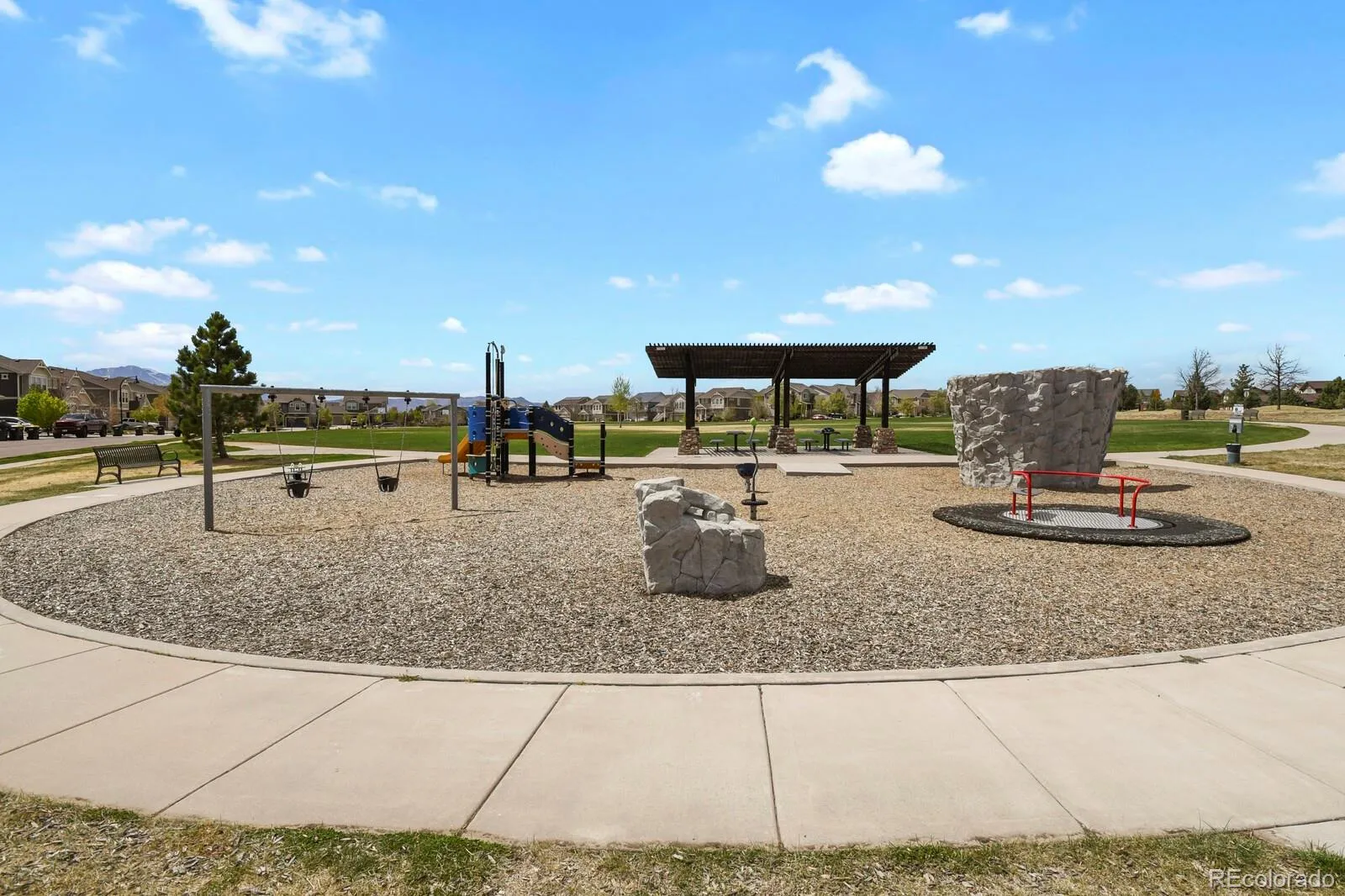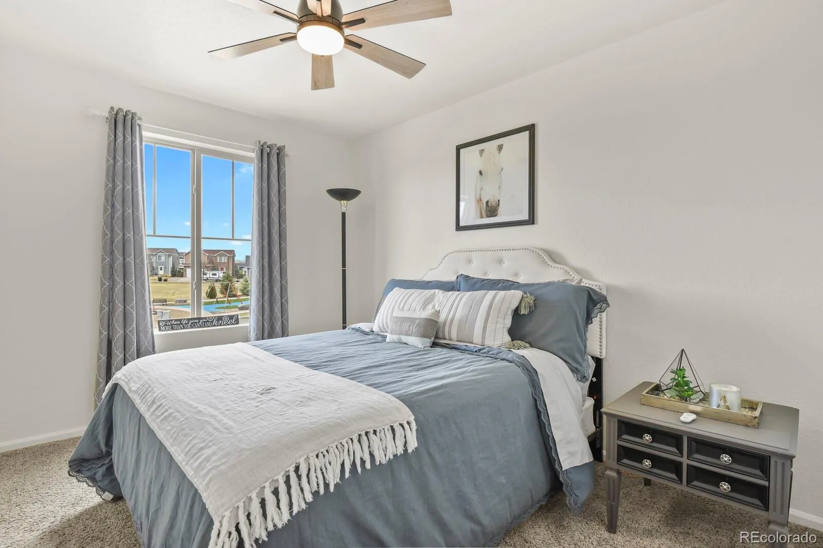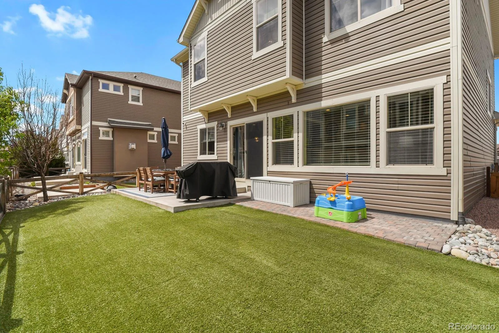 Climbers Park directly across the street • Covered front porch • Open-concept layout • Paid-off solar • This two-story home offers over 2,000 sq ft with 3 bedrooms, 2.5 bathrooms, a 2-car garage, and a functional layout designed for both everyday living and flexibility. VA assumable loan available for qualified buyers 2.75% interest rate (substitution of entitlement required). Main level features hardwood floors and an open-concept living and kitchen layout. Kitchen includes granite countertops, stainless steel appliances, gas range, dark wood cabinetry, large island, and walk-in pantry. Sliding glass door leads to a low-maintenance backyard with astroturf. Upstairs includes a loft space ideal for a home office, gym, or second living area. Primary suite features dual vanities with granite countertops a walk-in shower with floor-to-ceiling tile, stone pebble flooring and a stone pebble mosaic. Two additional bedrooms, upper-level laundry, and waterproof flooring in wet areas. Additional features include fully paid-off solar panels, Class 4 high impact roofing, and completed pre-listing inspection report. Convenient access to Powers Boulevard, nearby shopping and dining, and a short drive to Peterson Space Force Base, Schriever Space Force Base, Fort Carson and the U.S Air Force Academy. Positioned directly across from Climbers Park, this home offers immediate access to open fields, basketball courts, playground, and climbing features. Located in Banning Lewis Ranch with over 75 acres of parks, trails, open space, and connected community areas, along with regular events including food trucks, concerts, and seasonal gatherings. Community amenities include a clubhouse, junior Olympic pool, splash park, fitness center, pickleball courts, dog park, and an extensive trail network. This home stands out for its location, condition, and overall value. See floor plans in photos.