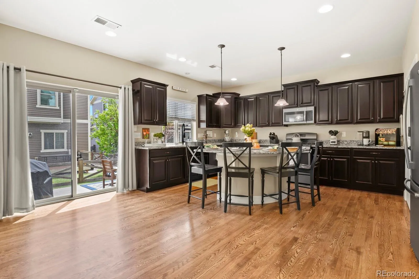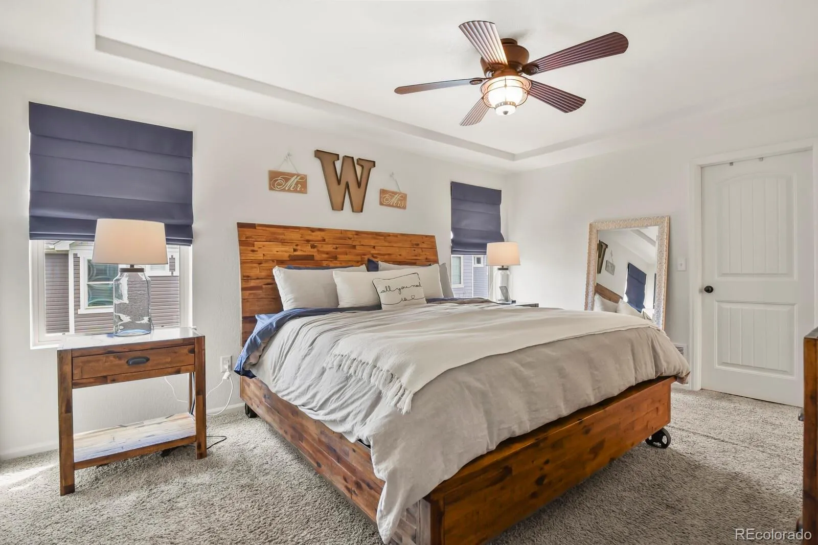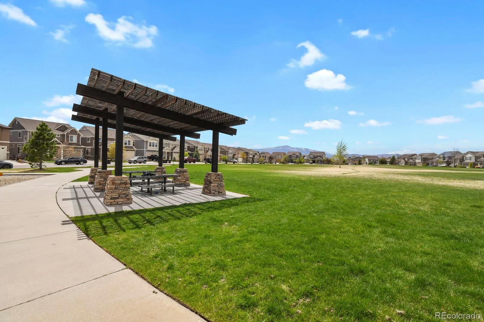 Climbers Park directly across the street • Covered front porch • Open-concept layout • Paid-off solar • This two-story home offers over 2,000 sq ft with 3 bedrooms, 2.5 bathrooms, a 2-car garage, and a functional layout designed for both everyday living and flexibility. VA assumable loan available for qualified buyers 2.75% interest rate (substitution of entitlement required). Main level features hardwood floors and an open-concept living and kitchen layout. Kitchen includes granite countertops, stainless steel appliances, gas range, dark wood cabinetry, large island, and walk-in pantry. Sliding glass door leads to a low-maintenance backyard with astroturf. Upstairs includes a loft space ideal for a home office, gym, or second living area. Primary suite features dual vanities with granite countertops a walk-in shower with floor-to-ceiling tile, stone pebble flooring and a stone pebble mosaic. Two additional bedrooms, upper-level laundry, and waterproof flooring in wet areas. Additional features include fully paid-off solar panels, Class 4 high impact roofing, and completed pre-listing inspection report. Convenient access to Powers Boulevard, nearby shopping and dining, and a short drive to Peterson Space Force Base, Schriever Space Force Base, Fort Carson and the U.S Air Force Academy. Positioned directly across from Climbers Park, this home offers immediate access to open fields, basketball courts, playground, and climbing features. Located in Banning Lewis Ranch with over 75 acres of parks, trails, open space, and connected community areas, along with regular events including food trucks, concerts, and seasonal gatherings. Community amenities include a clubhouse, junior Olympic pool, splash park, fitness center, pickleball courts, dog park, and an extensive trail network. This home stands out for its location, condition, and overall value. See floor plans in photos.