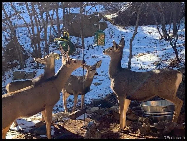 With beautiful decks and a patio space (with a propane fire pit) in the front and backyard — relax on your new Colorado mountain dream property and enjoy visits from our friendly mule deer.