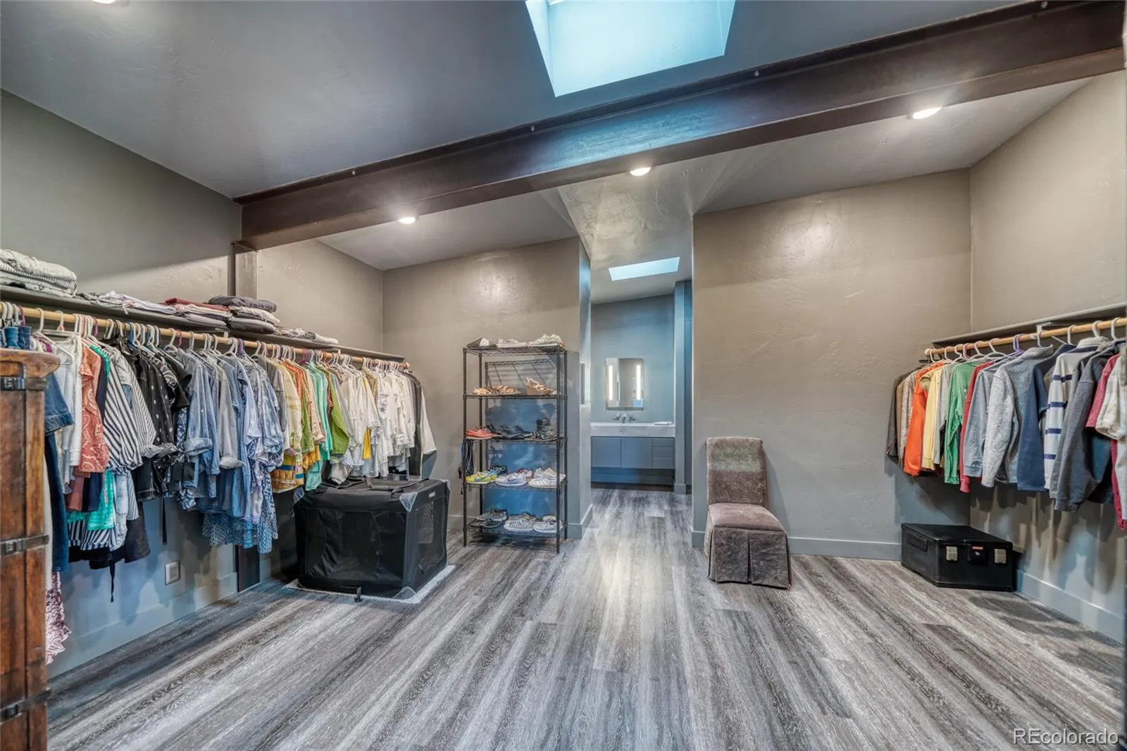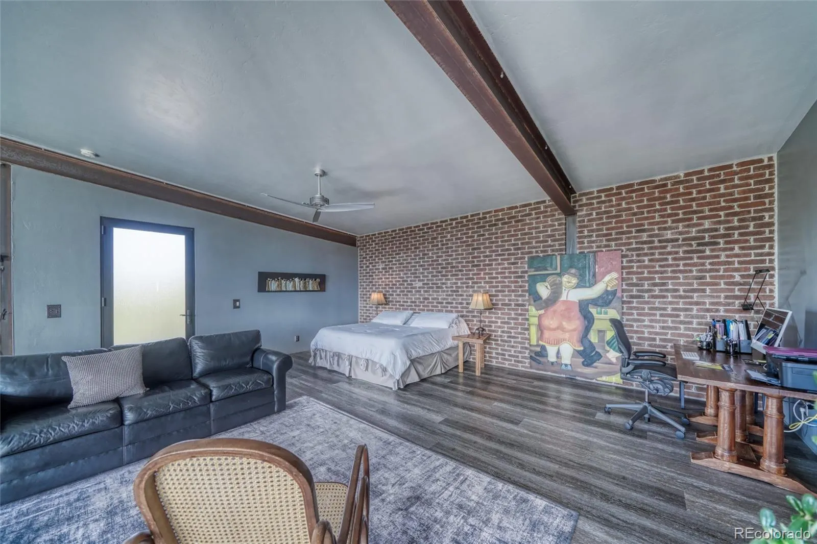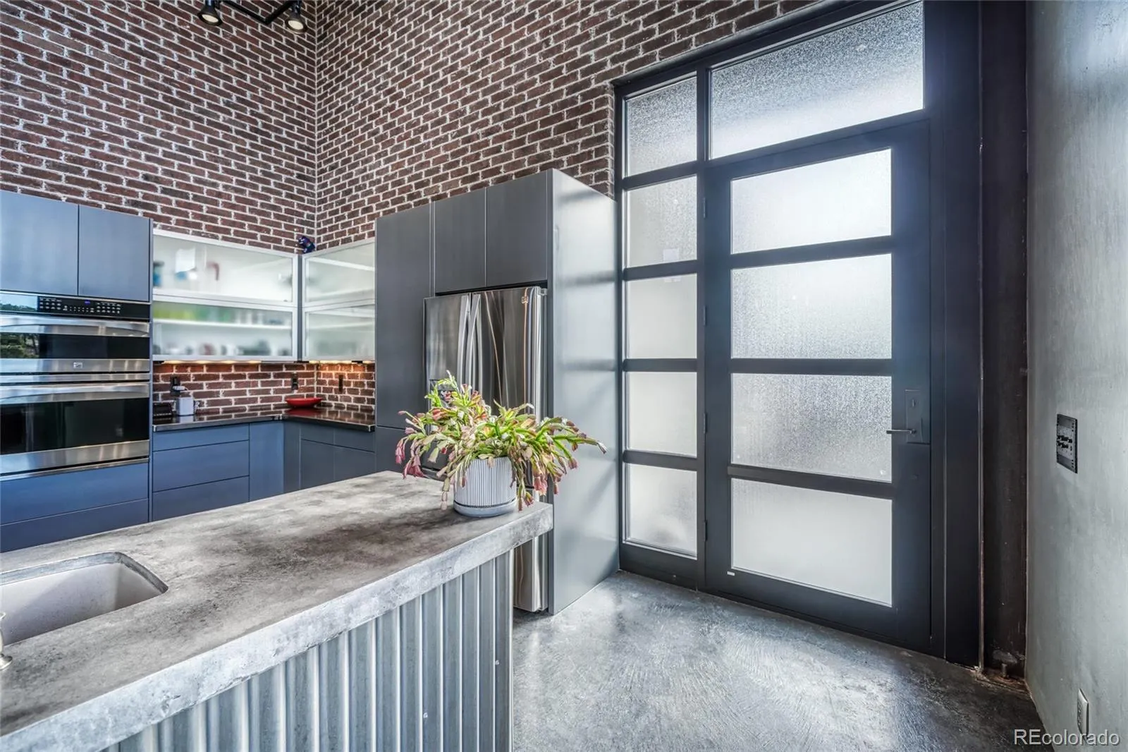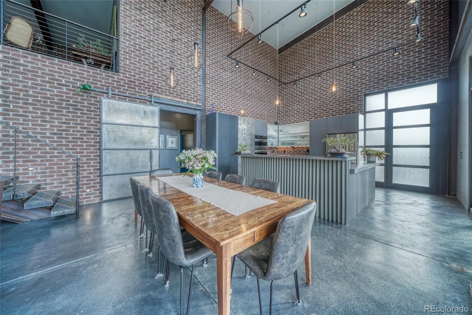 Distinctive features add warmth and character, including exposed brick from historic downtown Salida, steel beam construction, oversized front door, custom metal barn door, and a thoughtfully designed fireplace. The staircase showcases a handcrafted double-wrap railing, while custom mirrors, inventive LED lighting, and curated finishes continue throughout.