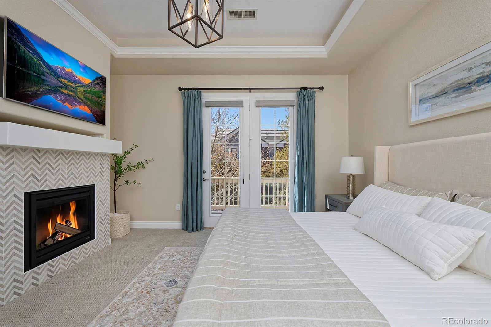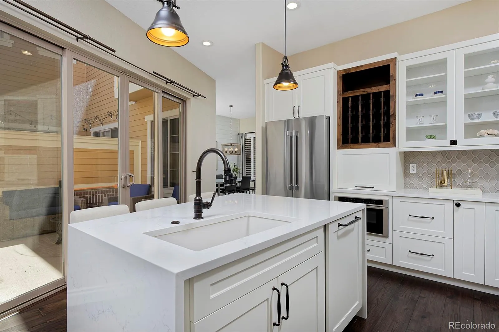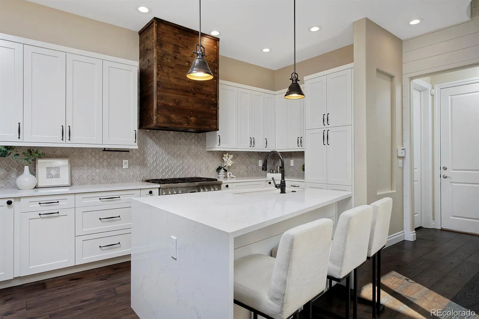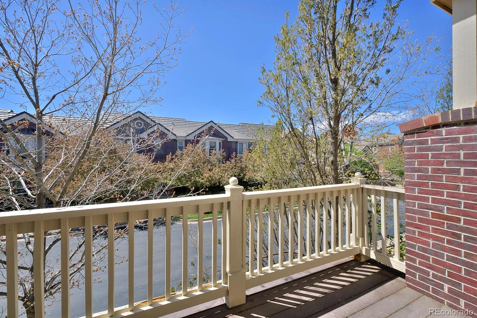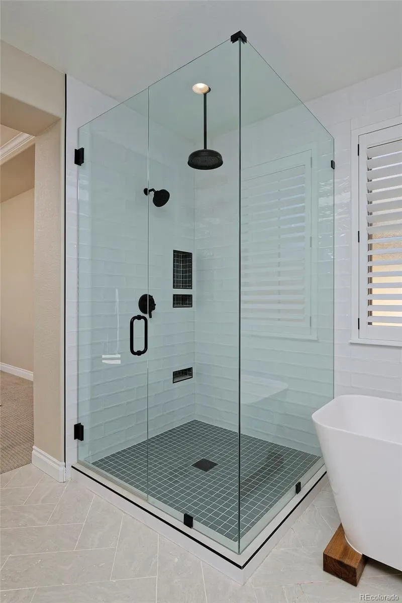 Isn’t she lovely? From the storybook gables and timeless red brickwork to the tiled roof and liberty-blue front door, the polished exterior of this charming RidgeGate townhome hints at what you’ll find inside, too: elegant finishes top to bottom, thanks to a recent remodel, and a smart layout to love. Let’s start with the stunning kitchen, decked out in stylish, soft-close cabinetry with rubbed-oil hardware; a custom alder wood wine rack and matching hood; an arabesque tile backsplash; sparkling quartz counters and an in-sink island with a waterfall edge. And to make entertaining an absolute joy, it has top-of-the-line appliances: a Thermador gas range and cabinet-matching dishwasher and a Bosch refrigerator and microwave drawer. After charcuterie around the island, take your gatherings through the glass sliding doors to the courtyard patio to clink glasses under the stars. The upgrades continue in your primary suite, with its own balcony for morning coffee and a bedside gas fireplace to create what has to be the coziest spot imaginable. Your en suite bath is an airy, serene, shiplap-lined space where you can melt your worries away in the freestanding tub under a chandelier or enjoy your walk-in, seamless-glass shower. Back downstairs, an open living room features a second fireplace and reclaimed wood mantle and flows easily into the dining room, with a shiplap feature wall. You’ll find stunning hardwood floors on the main level and stairs, and HunterDouglas shutters and roller shades throughout. Enjoy this is a fabulous location, close to Lone Tree’s rec center, library and arts center, plus shopping, dining, and a light rail station to zip into Denver. The amazing Belvedere Park is sure to become a favorite, as is Bluffs Regional Park Trail, two golf courses, a soccer complex and much more.