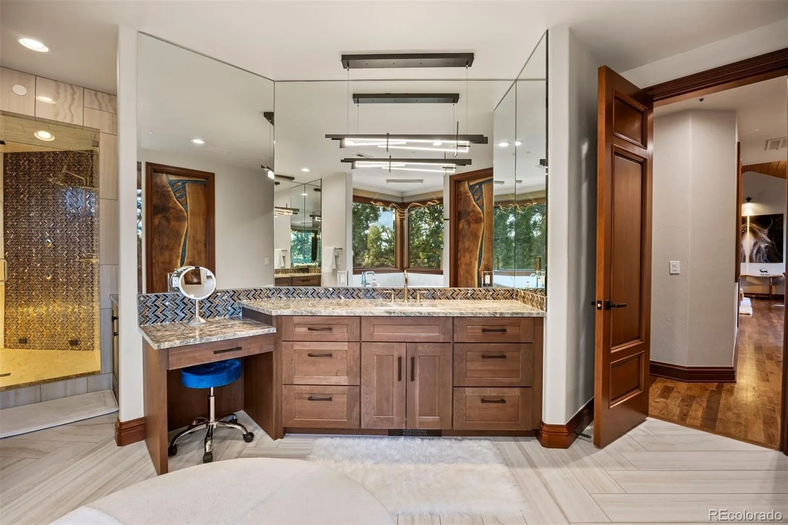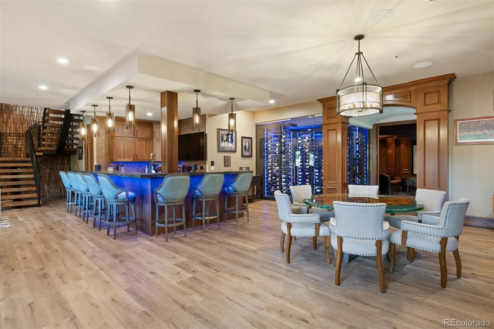 This Contemporary English Manor, set on a private lot along the 10th fairway of the Castle Pines Golf Club, offers an unparalleled blend of luxury and nature. Every detail of this home has been thoughtfully designed for ultimate comfort and sophistication. The completely updated chef’s kitchen is a dream for any cook, featuring two large islands and top-of-the-line appliances, including 4 ovens (including a steam oven), a Miele coffee system, a 6-burner gas stove with a built-in griddle, 2 dishwashers, Sub Zero refrigerator, freezer, and wine cooler. Even your furry friends were considered, with a built-in dog bowl station! The two-story library is a striking space, with a spiral staircase and a wall of windows that flood the room with natural light. Adjacent, the formal dining room is perfect for intimate gatherings, while the family room features wood ceilings and a massive antler chandelier. Expansive windows overlook the lush golf course, seamlessly blending indoor and outdoor beauty. All 8 bathrooms have been completely updated, and new flooring and LED lighting can be found throughout. Upstairs, two large secondary bedroom suites offer privacy, and a huge bonus space near the primary suite is currently being used as a home gym. The primary suite itself offers a cozy fireplace, stunning golf course views, and a spa-like bath with a steam shower, dual vanities, and a freestanding tub. Custom doors crafted from Maryland black walnut add a unique and luxurious touch to the suite. The lower level includes an additional guest ensuite, a large stately office, a home theater, a climate-controlled wine room, and a fully equipped bar perfect for entertaining or a quiet evening in. The home also features two laundry rooms, a sleek tube-style elevator that connects all three levels, and a 6-car garage with a 2-car lift. Outside, the heated, gated courtyard adds to the luxury, as does the outdoor covered deck with a hot tub, putting green, and dramatic lava rock fire pit.