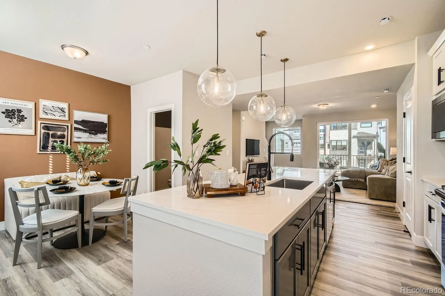 The entry level features a private bedroom with a full bath. Ideal for guests, a home office, or a peaceful retreat. On the second floor, you’ll find an open-concept living space filled with natural light, highlighted by a chef-inspired kitchen with crisp white cabinetry, a bright and inviting living area, and a dedicated dining space perfect for entertaining.