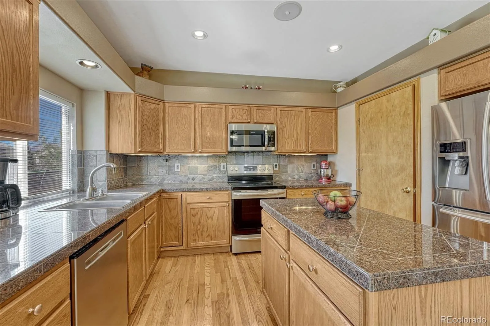 Welcome to 9358 Prairie Clover Drive, a charming 2-story home in the heart of Briargate. Sitting on a beautifully manicured private lot, this 5BR, 4BA, 3-car garage home offers over 3,400 sq ft of comfortable living space. Gleaming hardwood floors welcome you into the main level with a spacious kitchen featuring granite tile counters, center island, stainless steel appliances, and a breakfast nook that opens to the family room—perfect for everyday living and entertaining. Upstairs you’ll find a generous primary suite with a luxurious 5-piece bath and peek-a-boo views of Pikes Peak, plus three more bedrooms and one full bath. The finished basement includes a roomy rec room, plus another bedroom, and 3/4 bath. Step outside and enjoy the peaceful, park-like backyard with patio and expansive green grass with a shed for additional storage. This is an amazing location in Academy District 20 with top schools, nearby parks, hospitals, shopping, and easy access to I-25 & Powers. Turn-key and ready for you and yours!